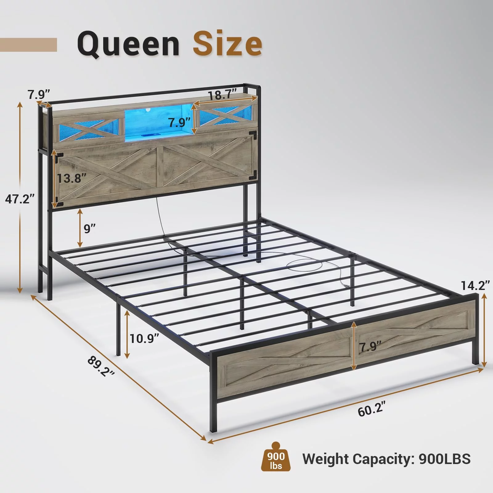 Queen Size Bed Frame with LED Lights and Charging Station and Storage Headboard,Farmhouse Metal Platform Bed Frame with Sliding Barn Door, No Box Spring Needed, Rustic Oak