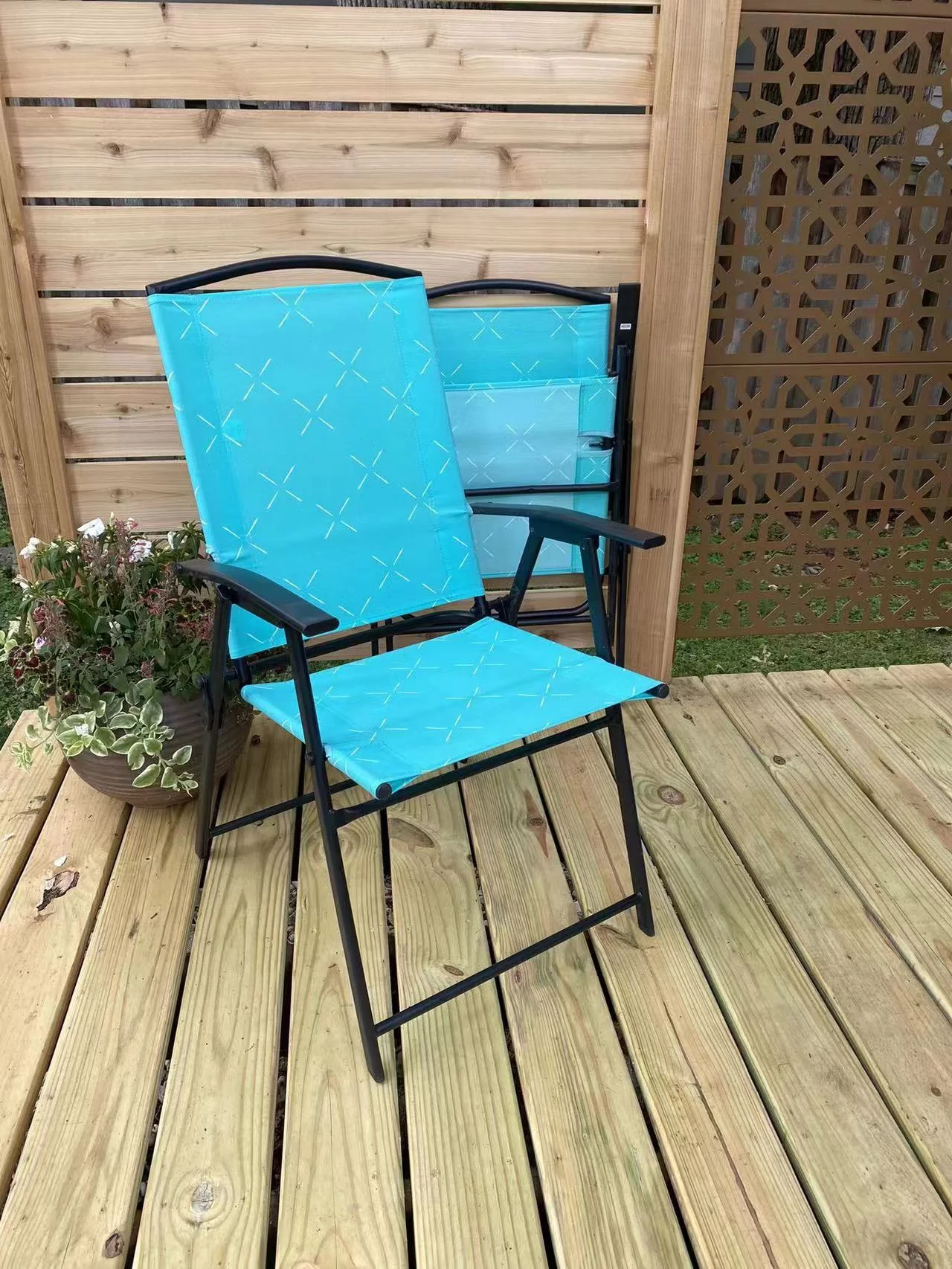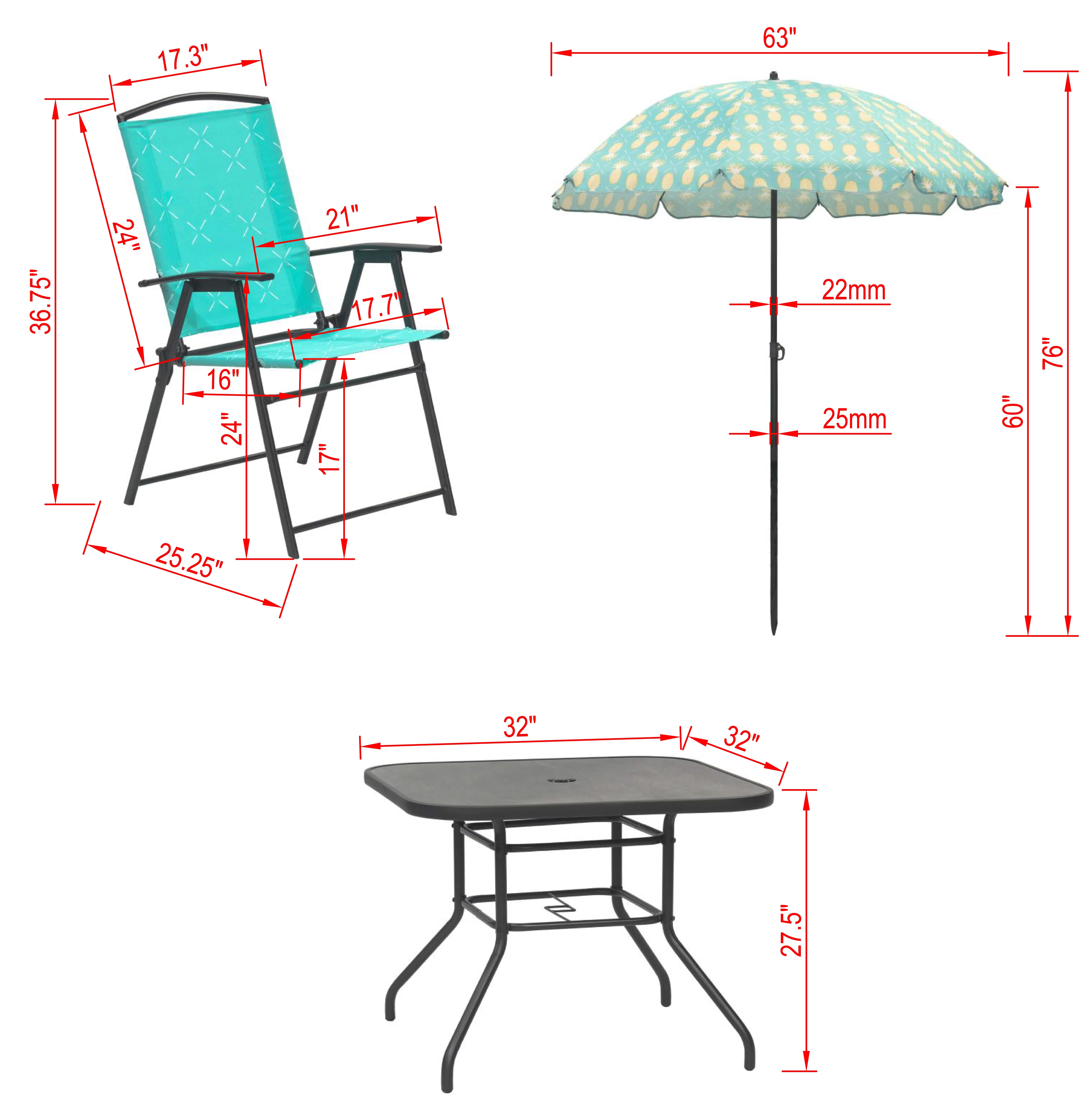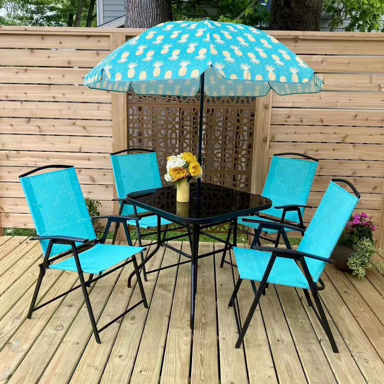 Donglin Wyndham 6pcs Outdoor Funiture Steel Folding Dining Set with Umbrella,Blue,4 person seating