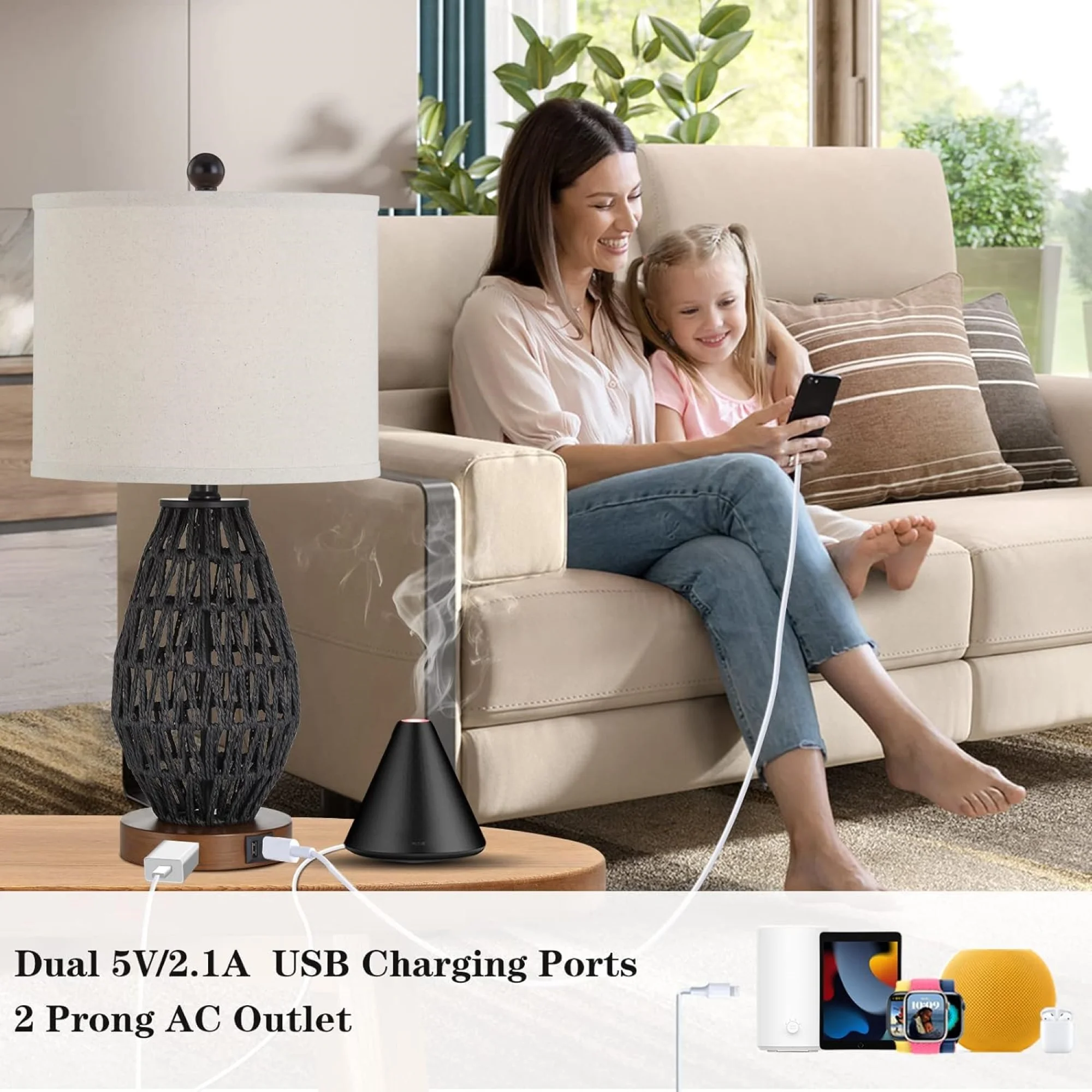 Cinkeda Black Rattan Table Lamp Set of 2 for Living Room Bedroom 3 Way Dimmable Touch Control Bedside Nightstand Lamps with USB Ports AC Outlet(2 Bulb) - Curated Treasures Market