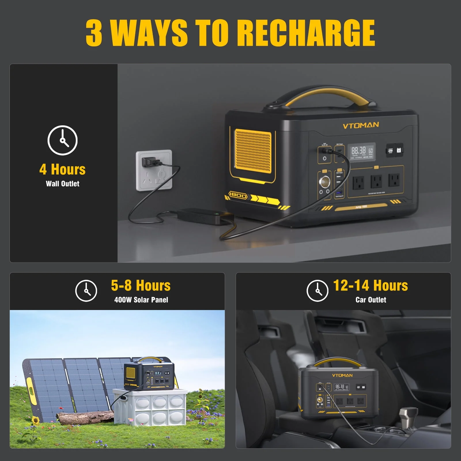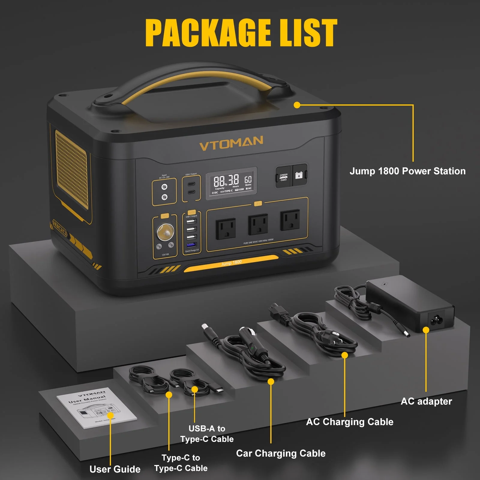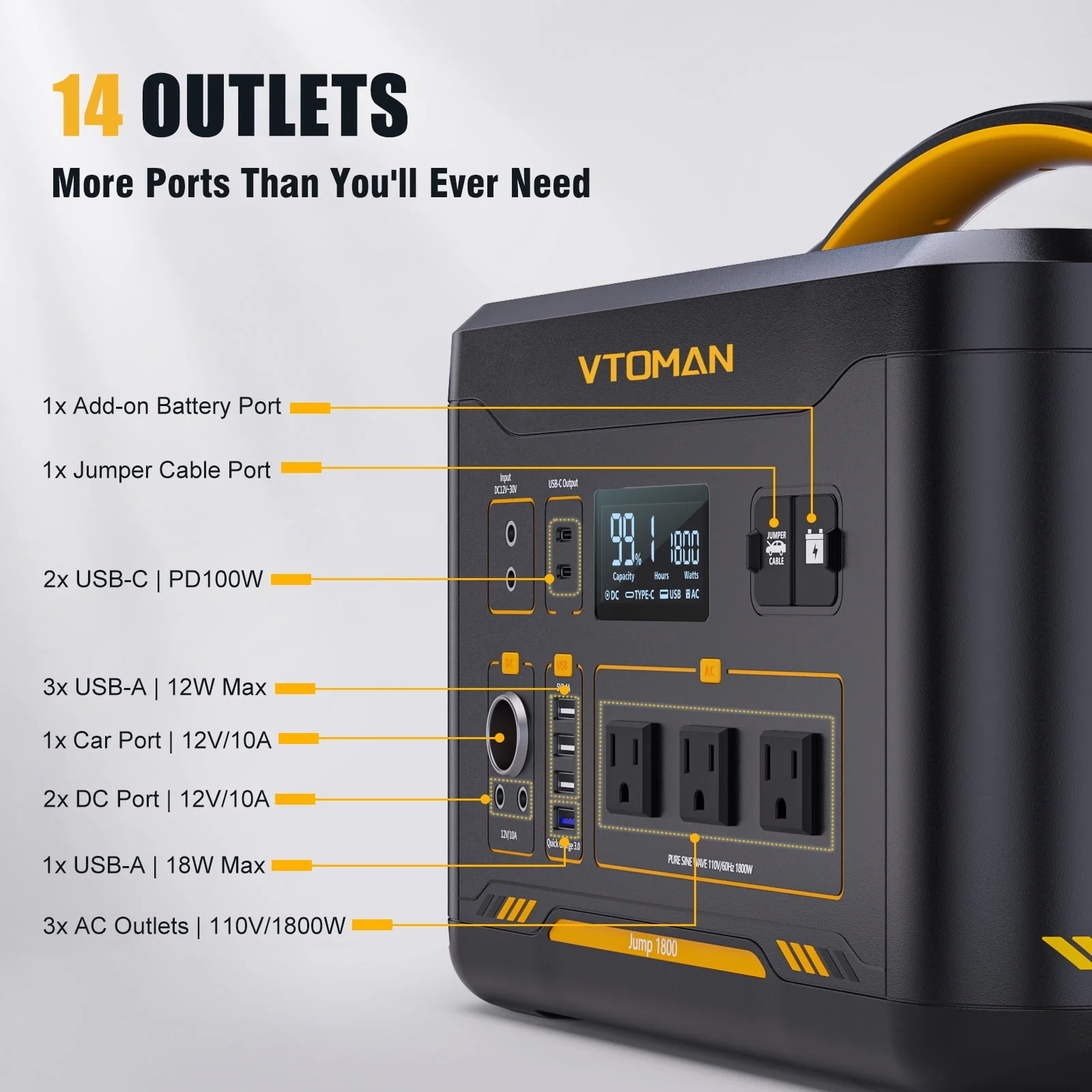 VTOMAN Jump 1800 Portable Power Station 1800W(3600W Peak), 1548Wh LFP Battery Generator with AC/DC/USB/Car Ports, Jump Starter, for Outdoor Camping, RV/Van, Traveling, Fishing, Blackout, Emergencies