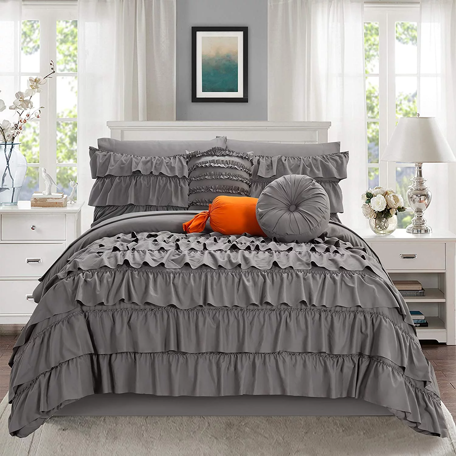 Mocassi 10-Piece Bed-in-a-Bag. Includes Bed Sheet with Double Sided Storage Pockets & Decorative Pillows. Multi-Ruffle Comforter. Twin XL. Gray