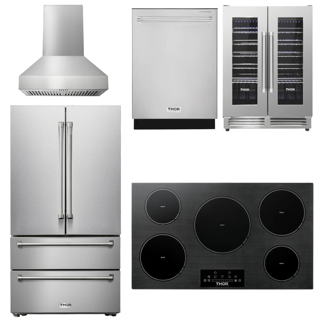 Thor Kitchen Package - 36 Induction Cooktop, Range Hood, Refrigerator, Dishwasher, Wine Cooler, AP-TIH36-W-3