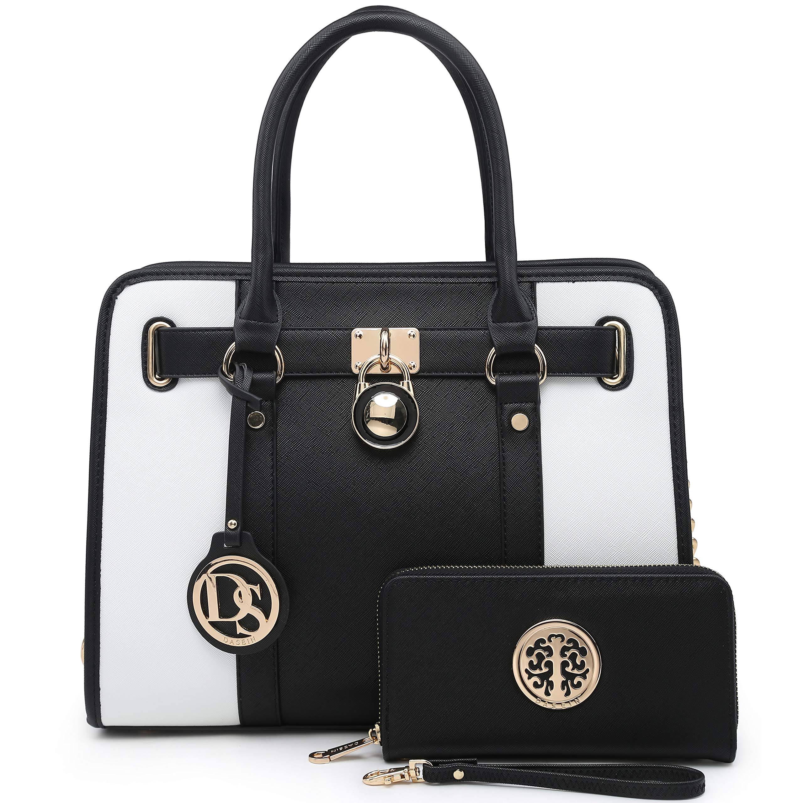 Dasein Two-Tone Gold Chain Strap Satchel Handbag with Matching Wallet - Black/White - Megean
