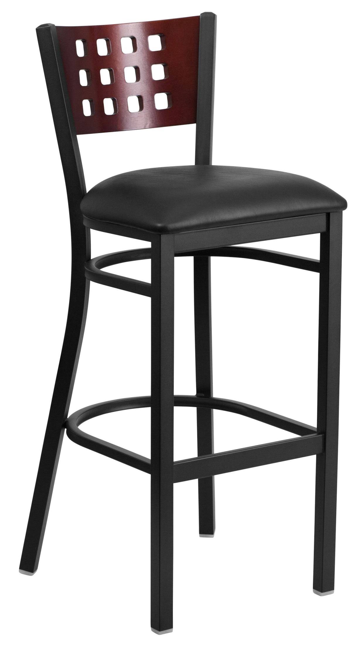 Hercules Series Black Cutout Back Metal Restaurant Barstool - Mahogany Wood BACK, Black Vinyl Seat | Flash Furniture - Megean