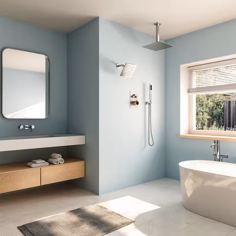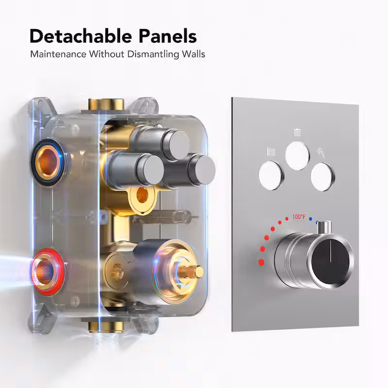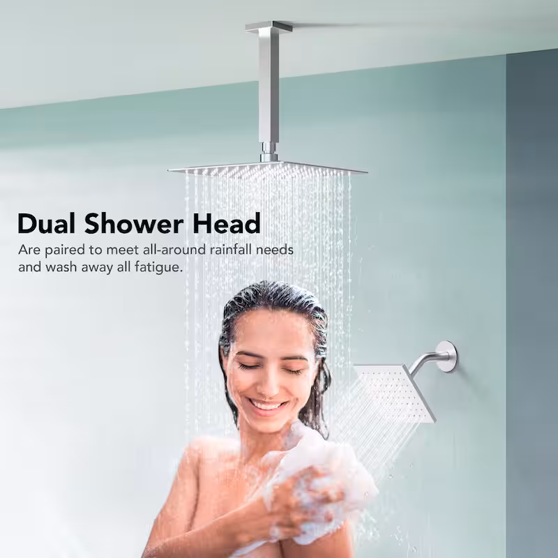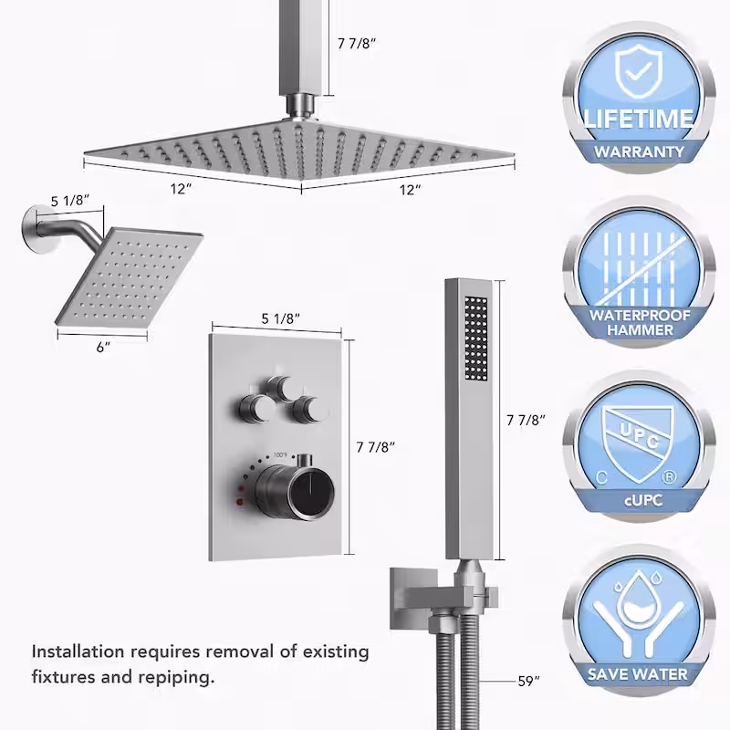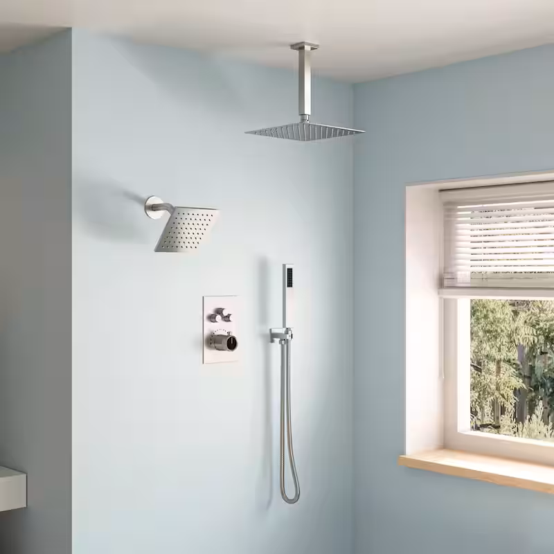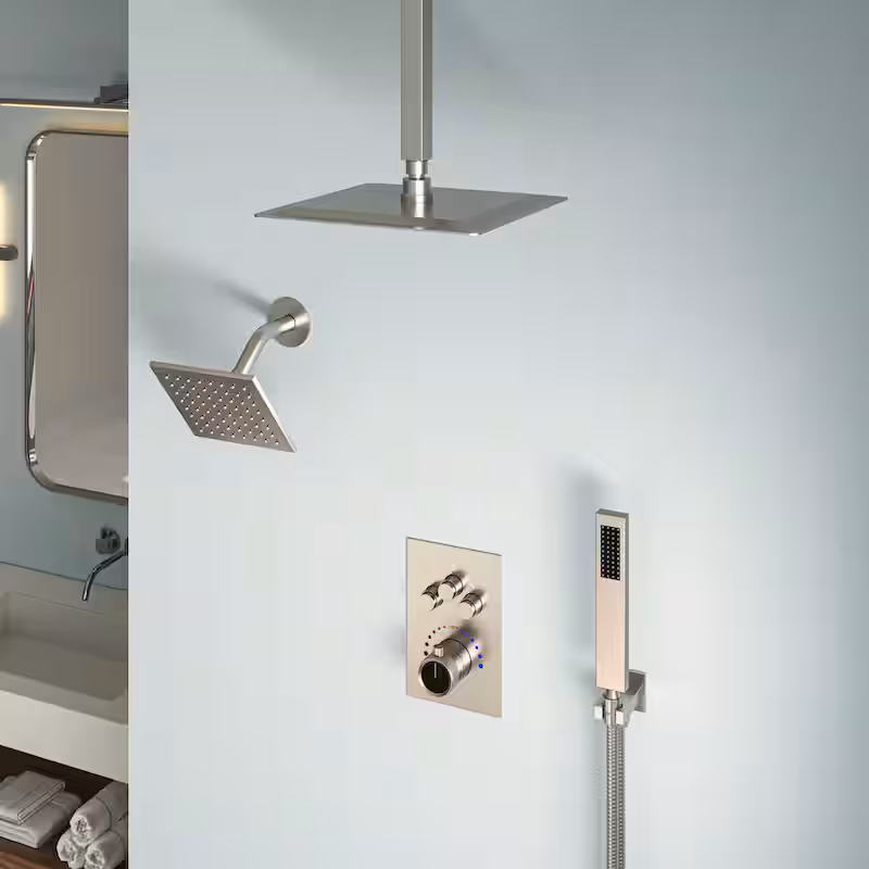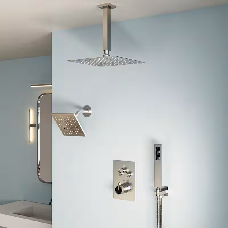 7-Spray Patterns Thermostatic 12 in., 6 in. Ceiling Mount 2.5 GPM Fixed and Handheld Shower Head in Brushed Nickel