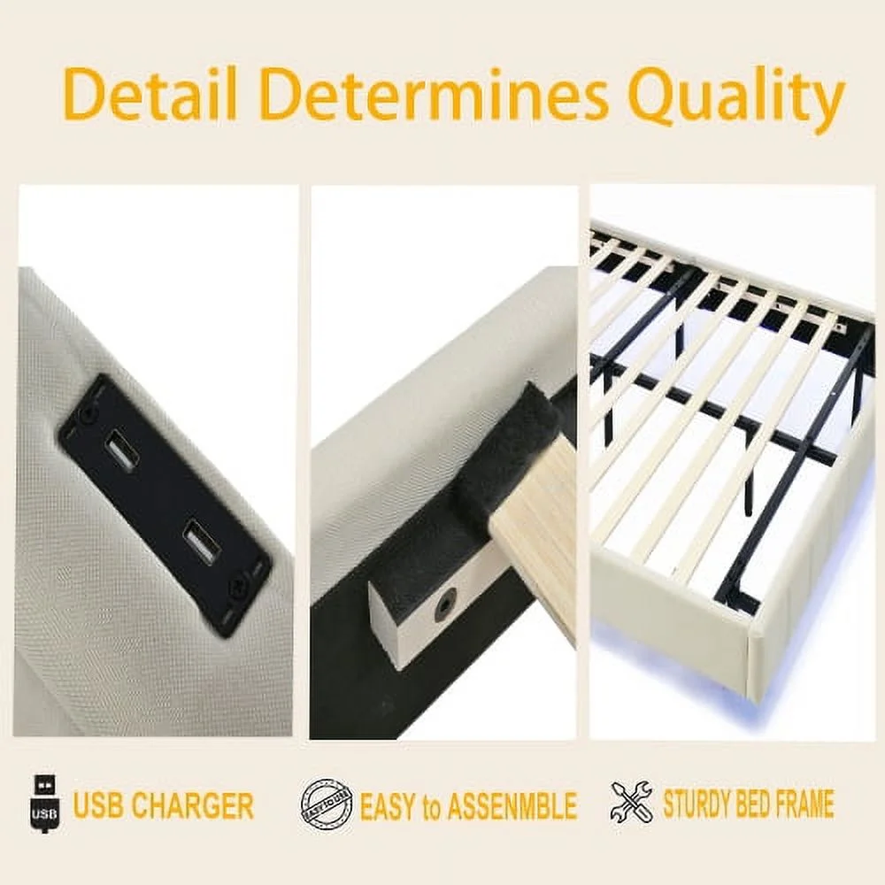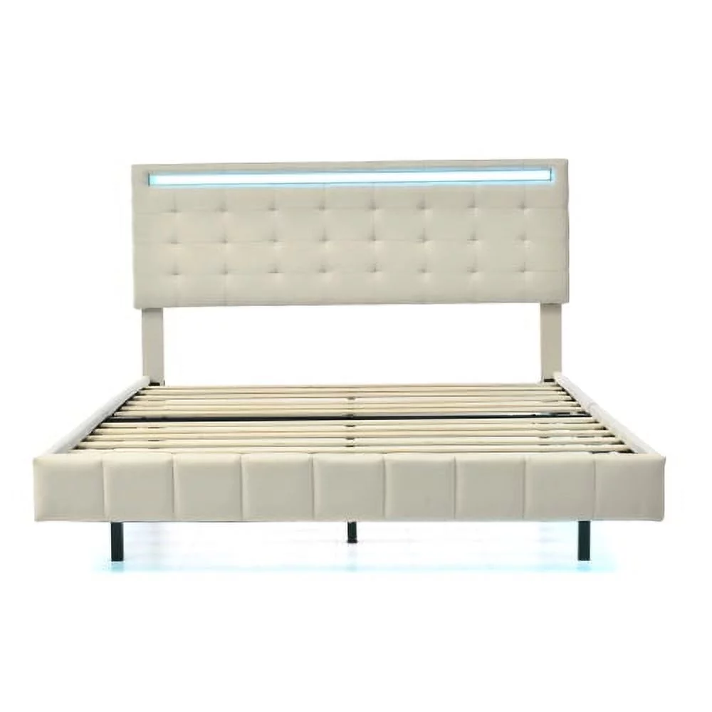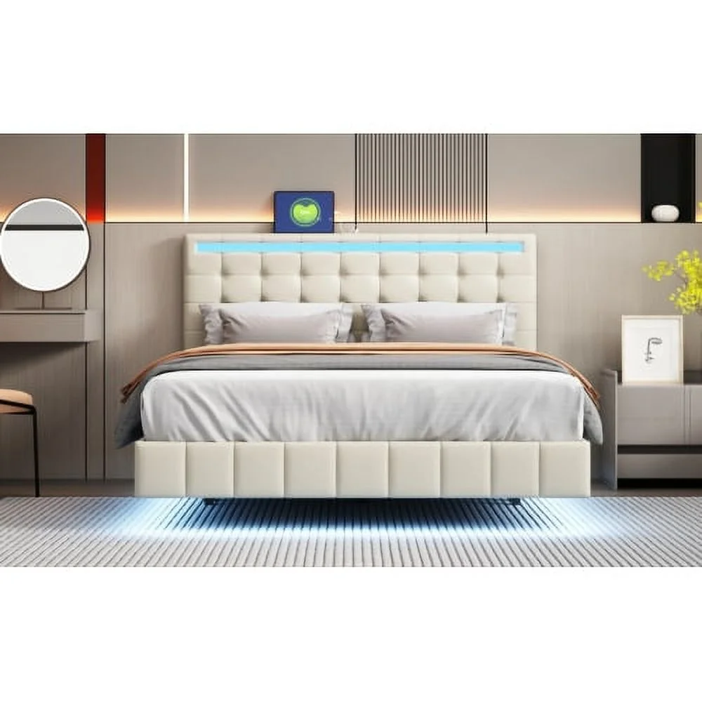 DremFaryoyo Queen Size Floating Bed Frame with LED Lights and USB Charging Modern Upholstered Platform LED Bed Frame Black - Curated Treasures Market