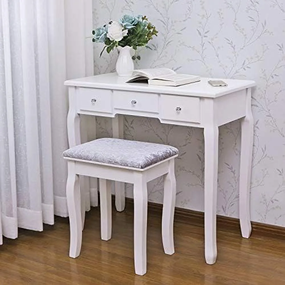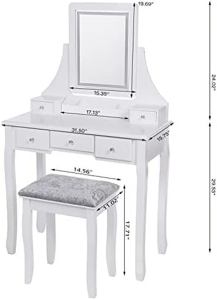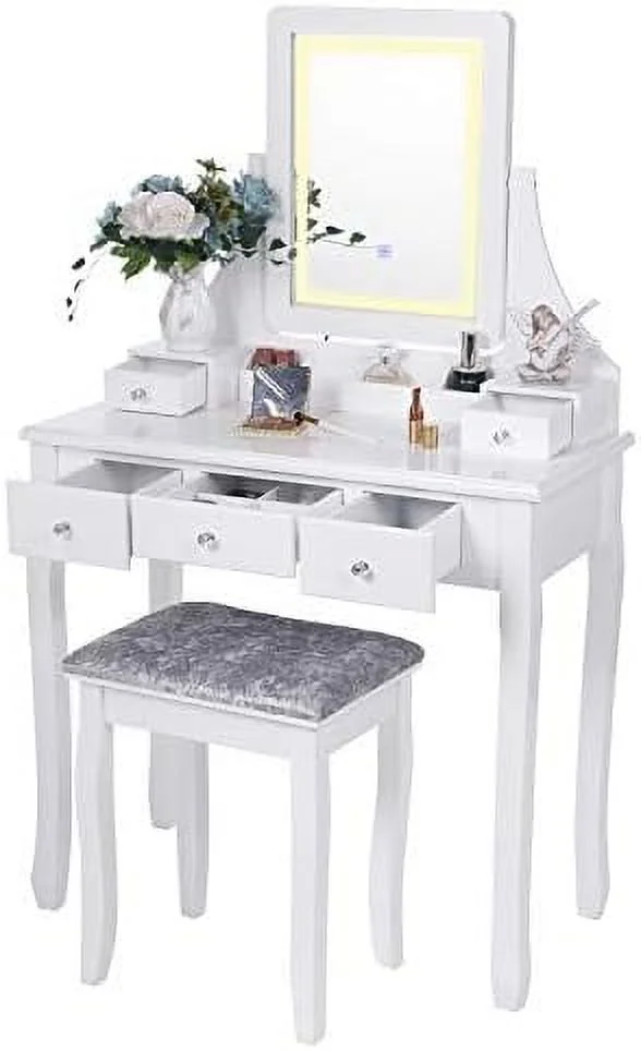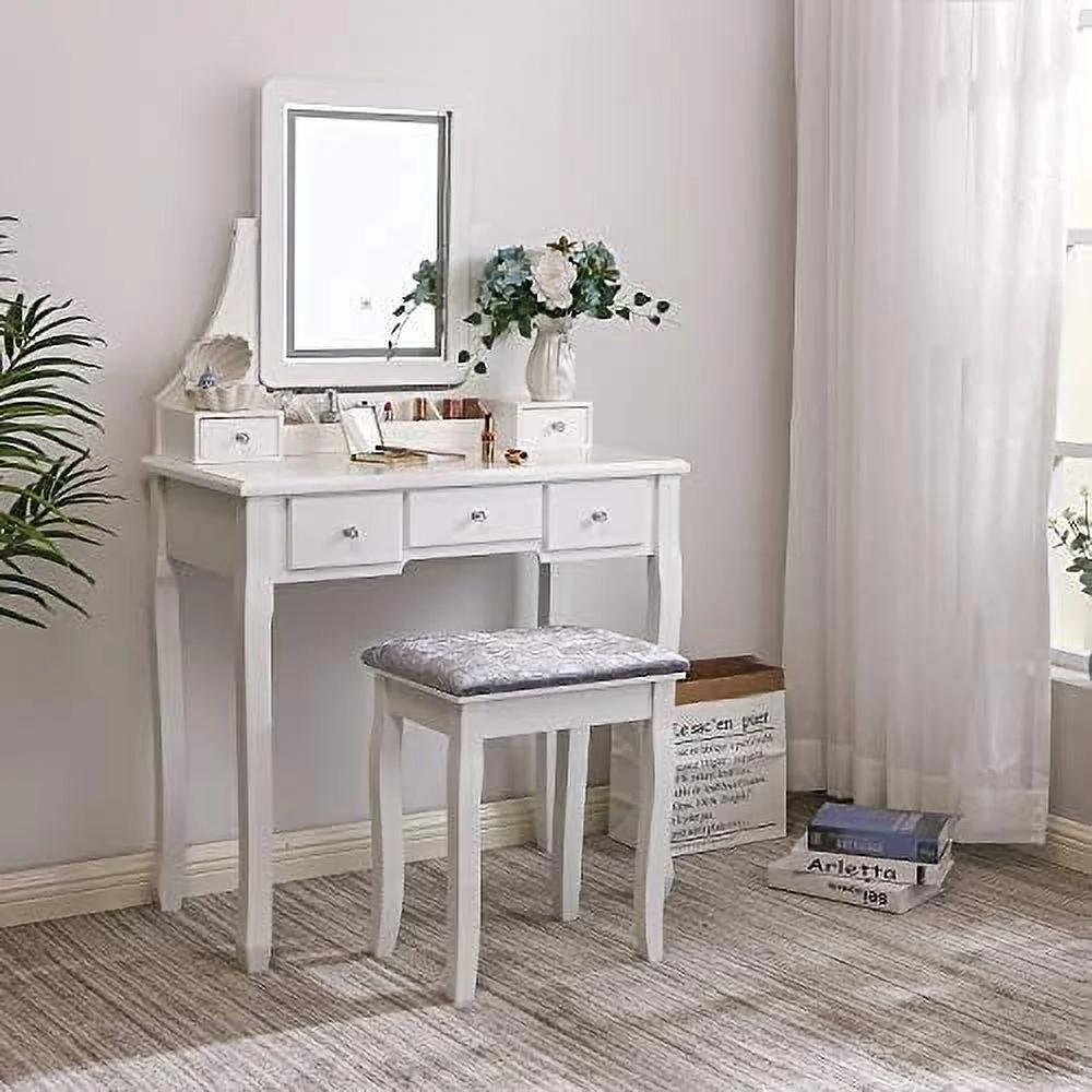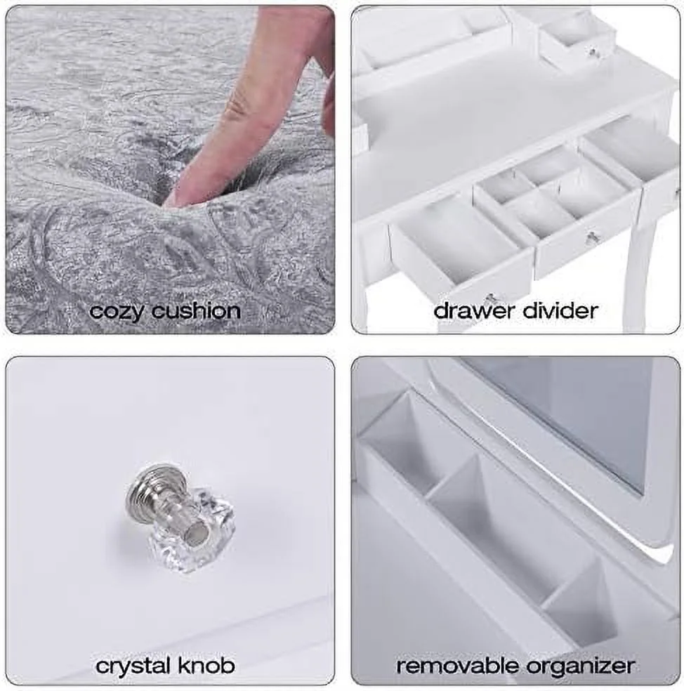 CGFHYP Vanity Set with Lighted Mirror Dimming Touch Screen Switch & Cushioned Stool Dressing Table Vanity Table 5 Drawers 2 Dividers Removable Organizers Vanity Desk White FST07W - Curated Treasures Market