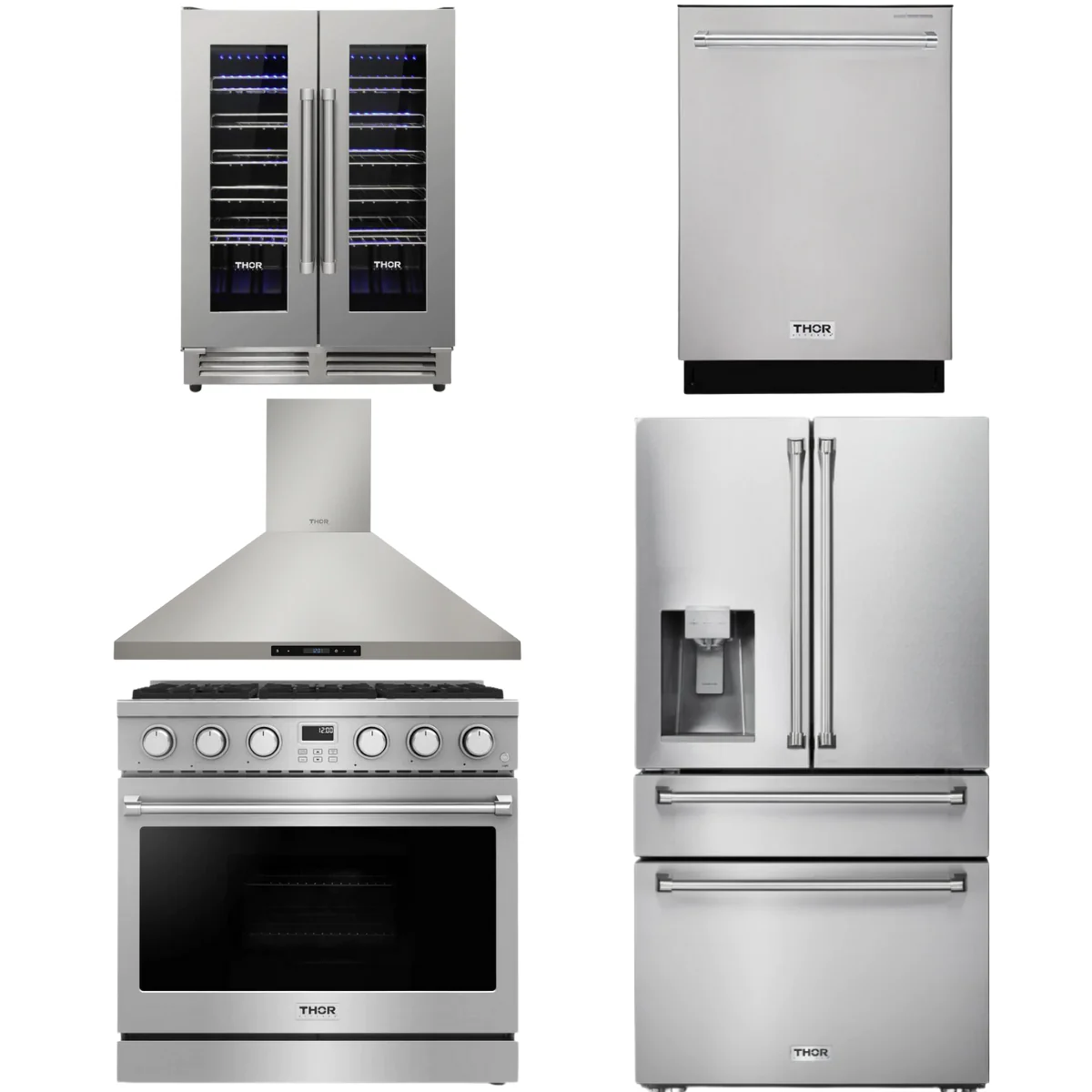 Thor Contemporary Package - 36 Gas Range, Range Hood, Refrigerator, Dishwasher and Wine Cooler, Thor-AP-ARG36LP-B102