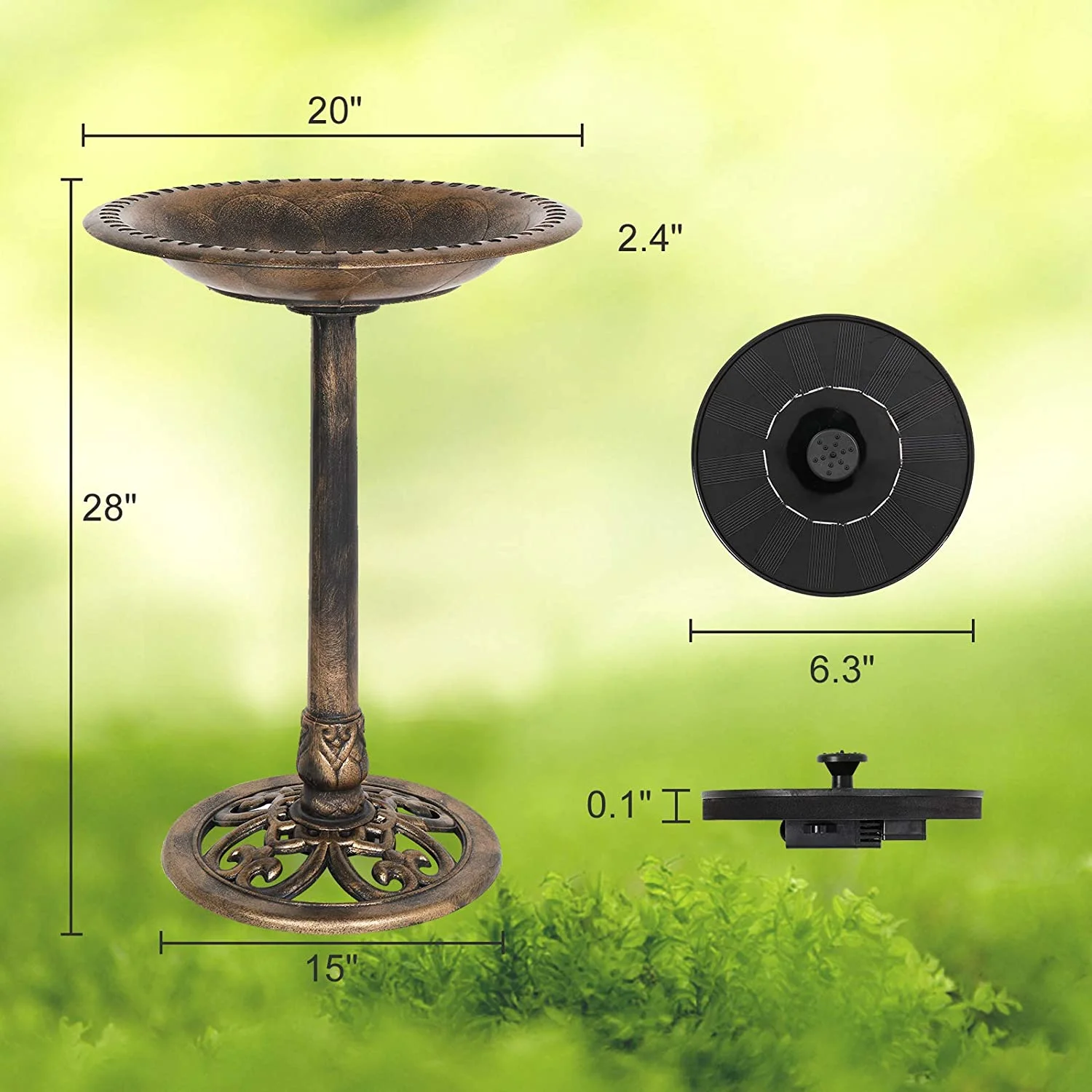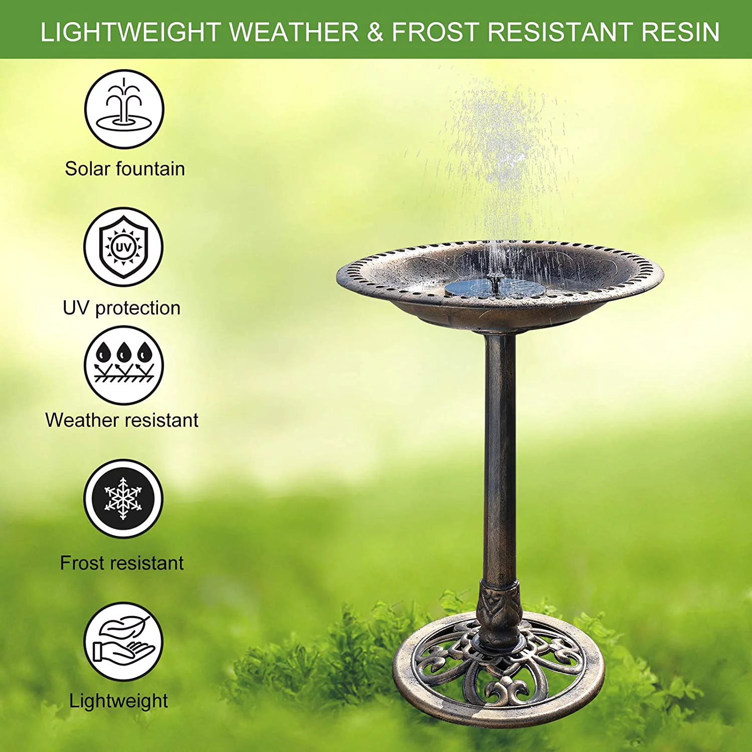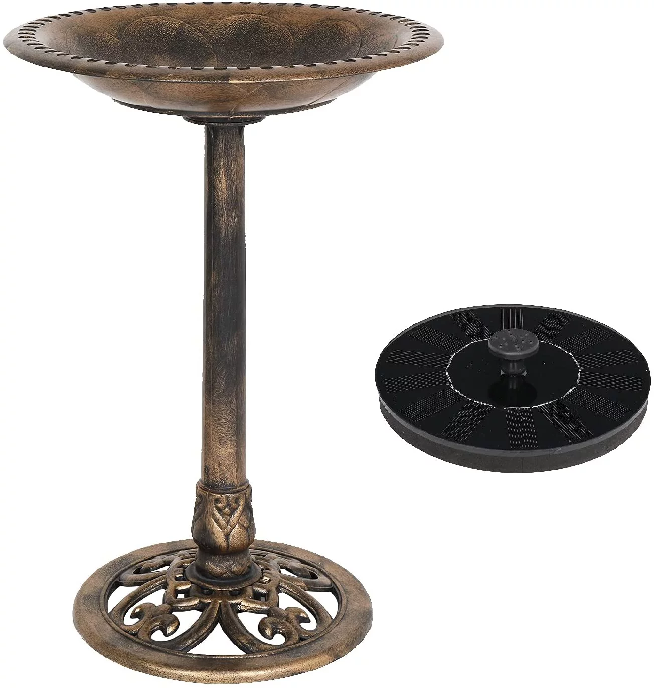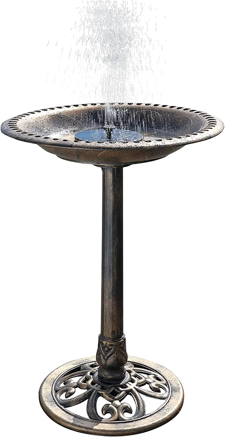 28 Inch Bird Bath with Solar Fountain Antique Copper Weather Resistant Resin Pedestal Birdbaths Floral Accents and Vintage Finish Garden Decor for Outdoor Lightweight Courtyard - Curated Treasures Market