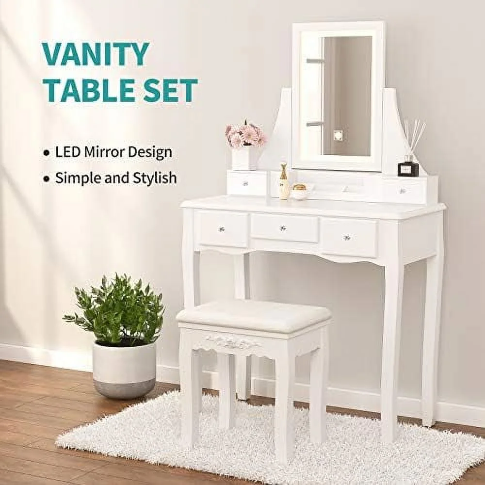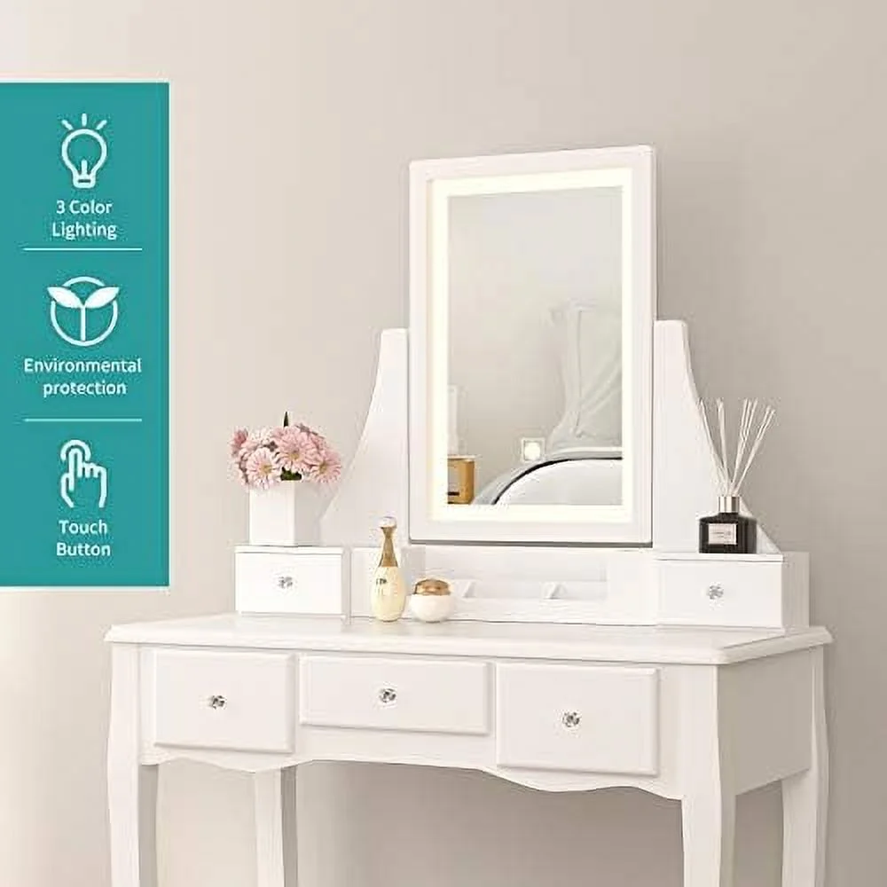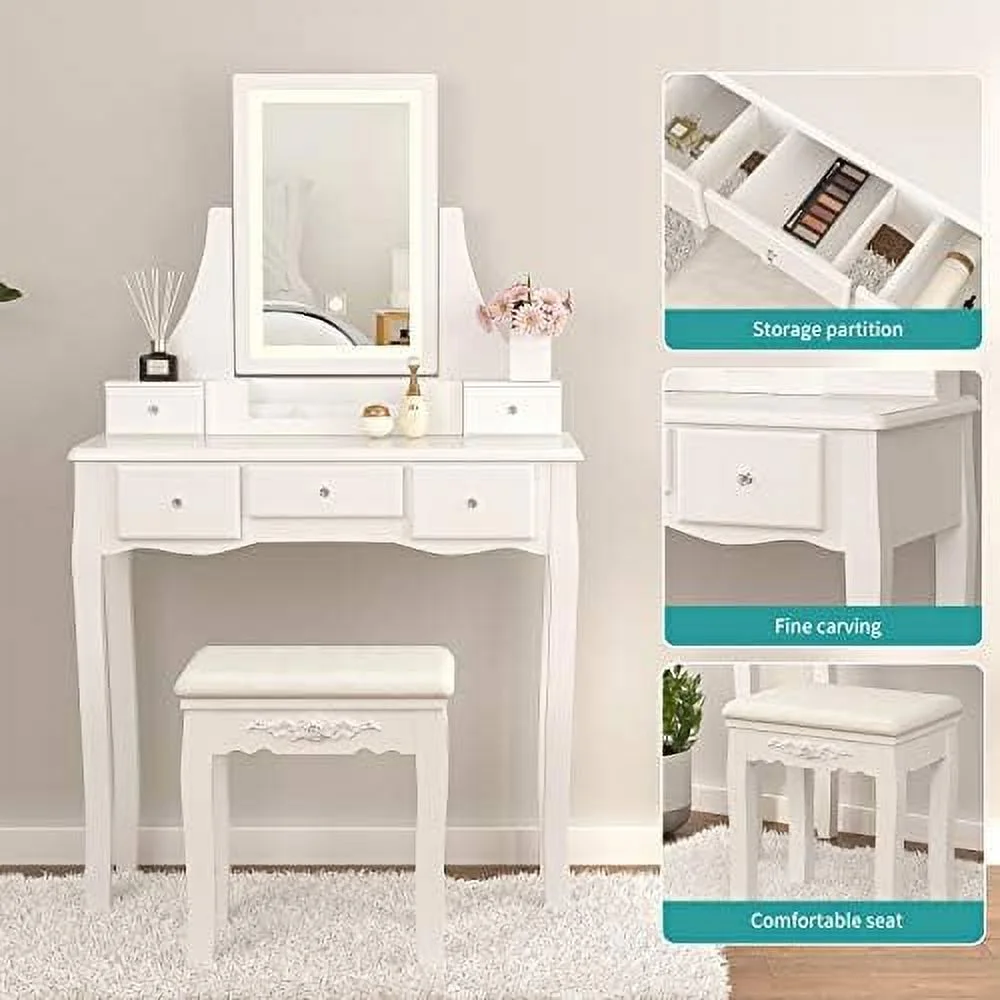 HYHBIBOOM Vanity Set with Lighted Mirror Vanity w/10 LED Dimmable Bulbs Dressing Table with Cushioned Stool&5 Drawers 3 Removable Dividers for Bedroom Vanity Desk White - Curated Treasures Market
