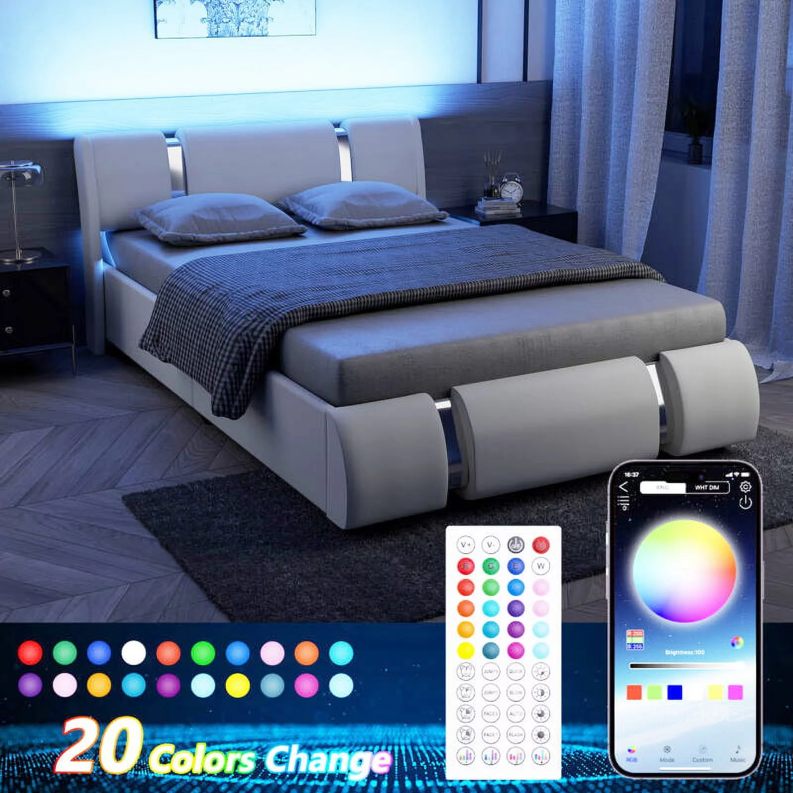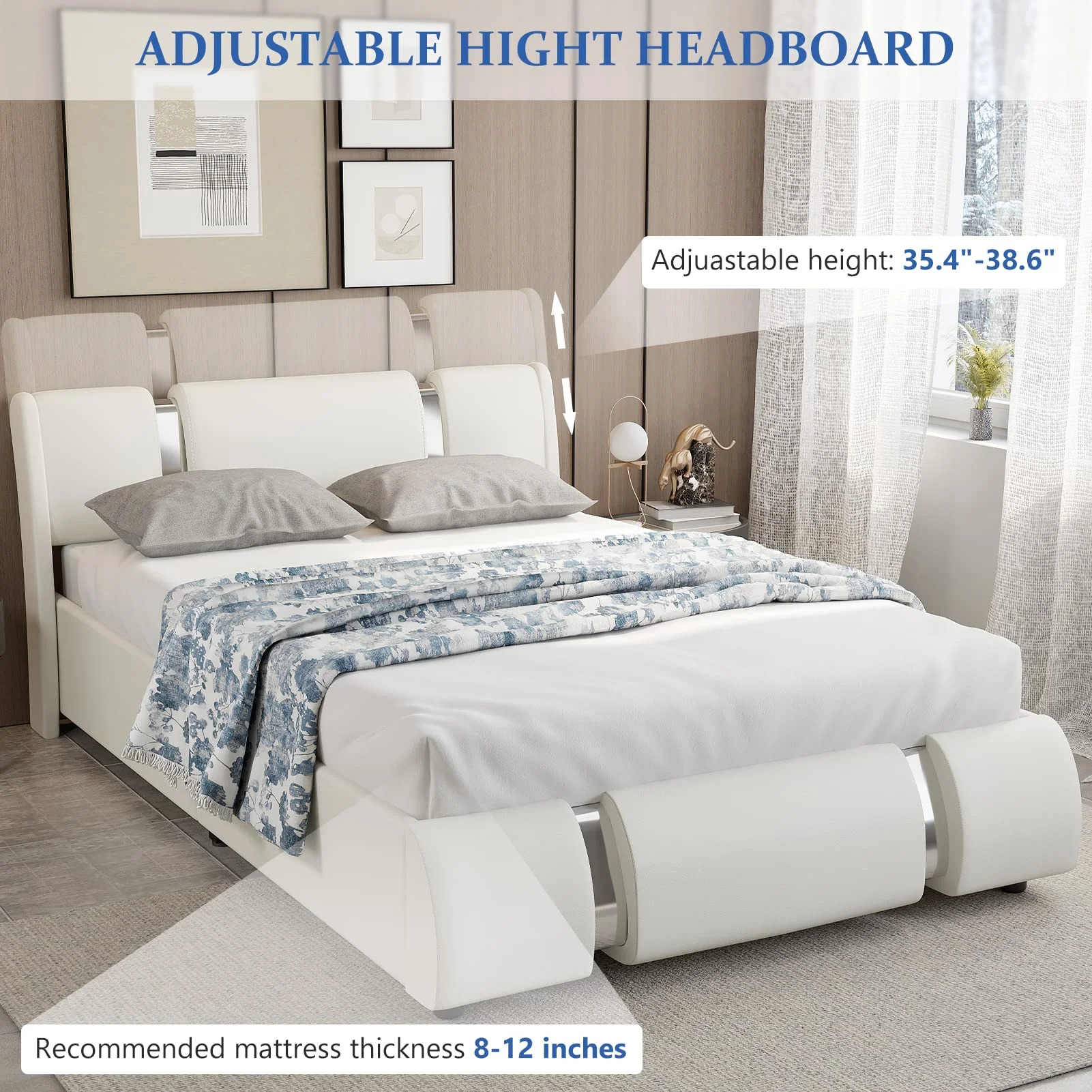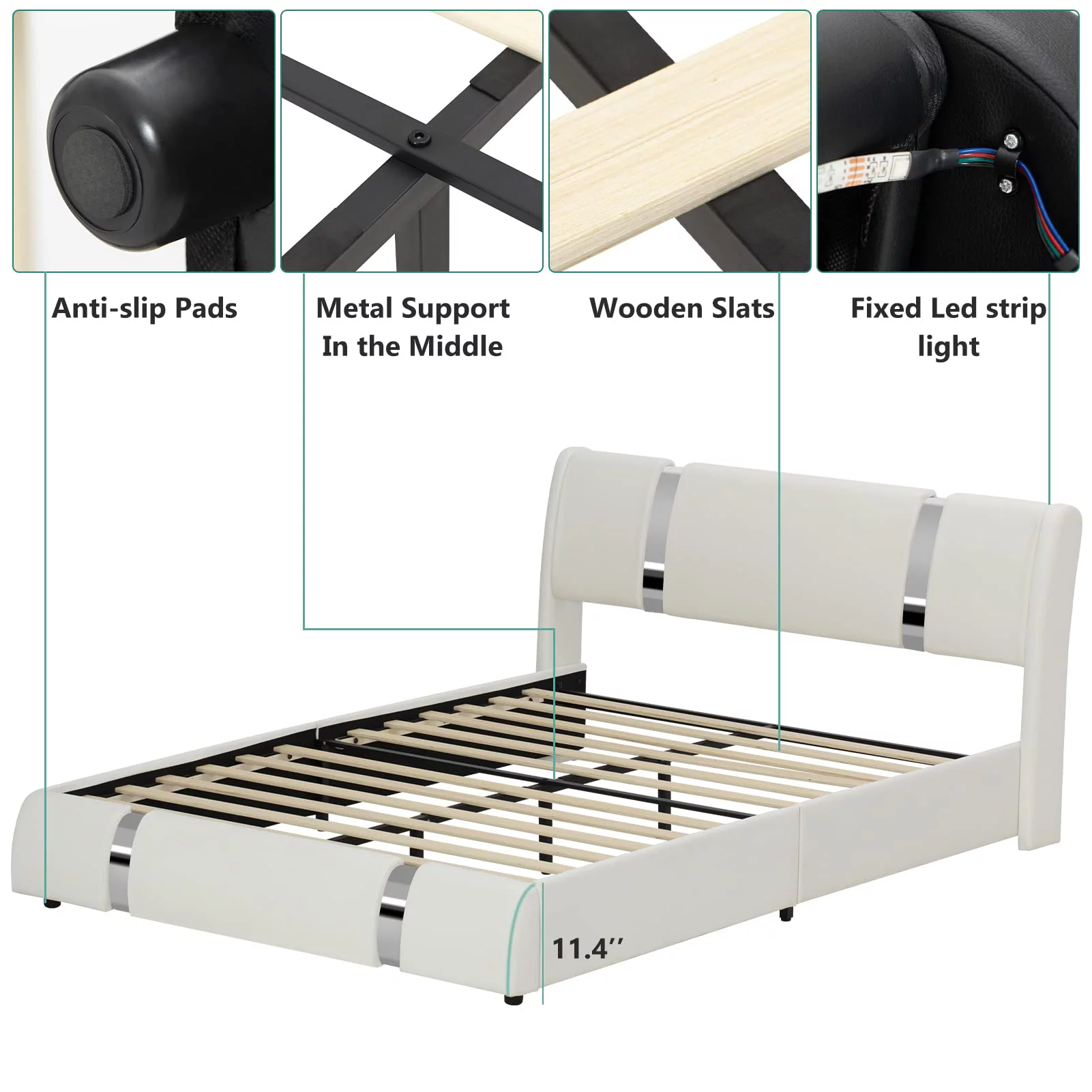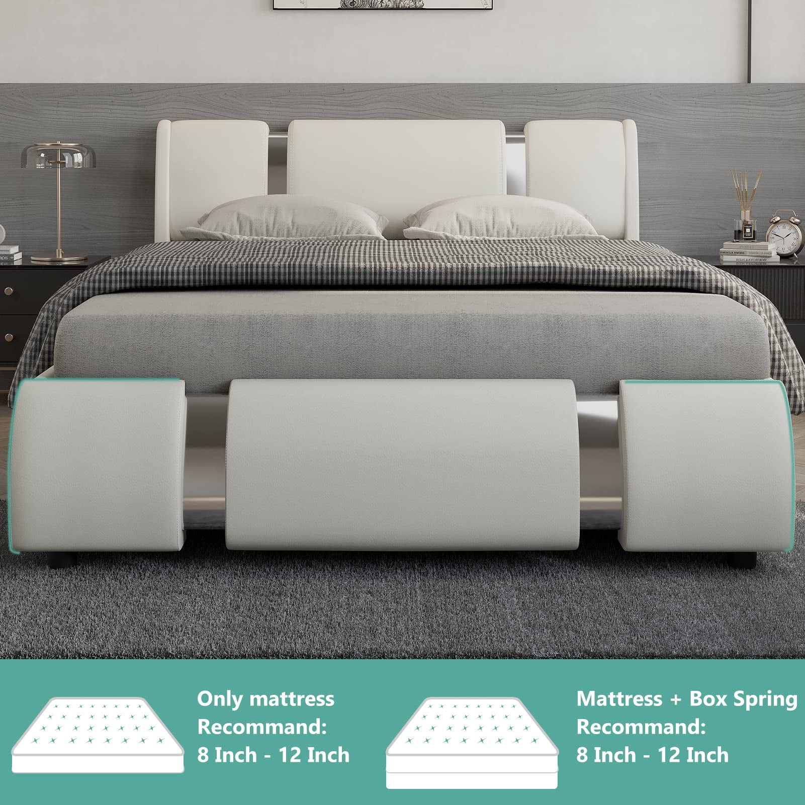 Faux Leather Bed Frame With LED Light & Adjustable Headboard, Full Size Modern Upholstered Platform Bed, Wooden Slats Bed Mattress Foundation(White-Full)