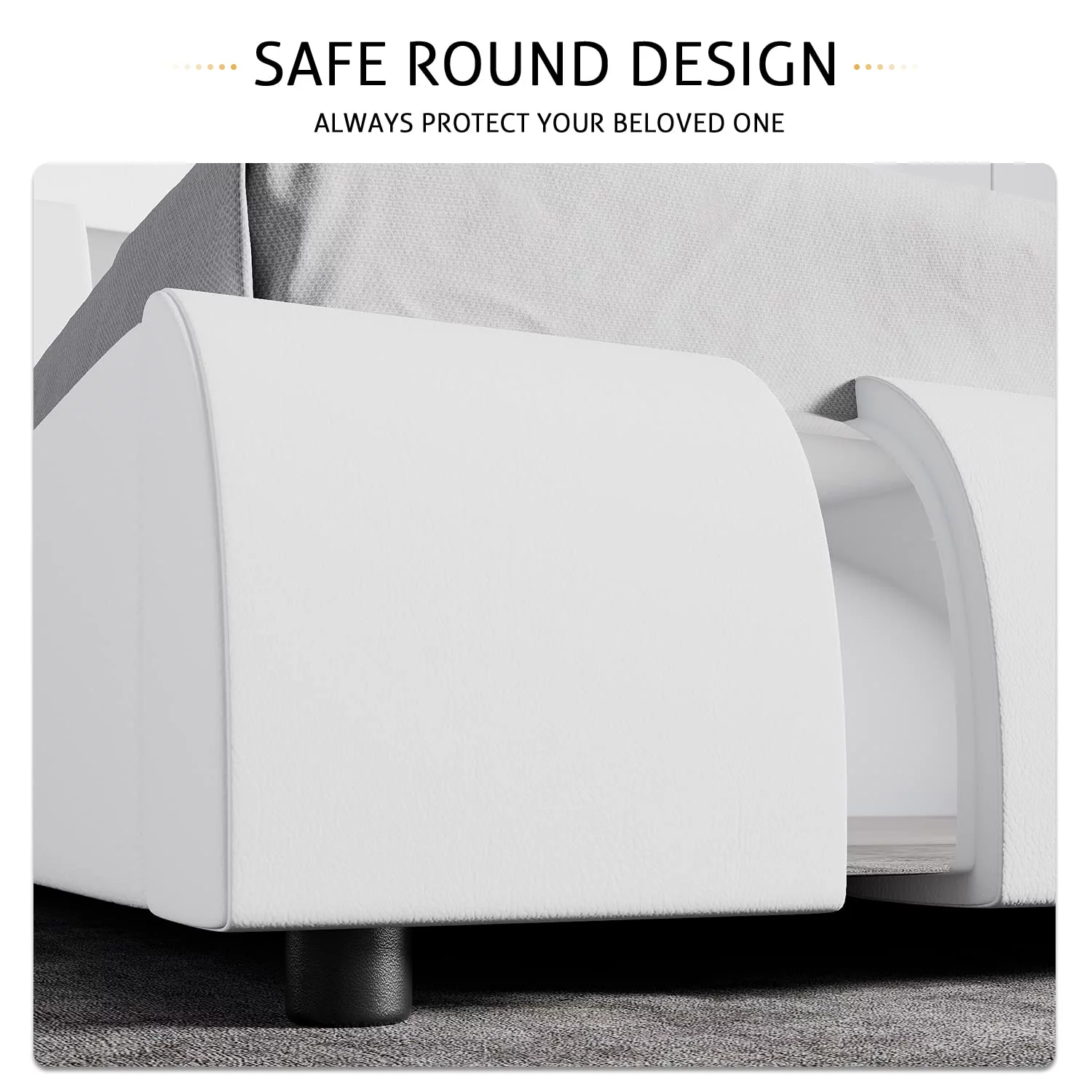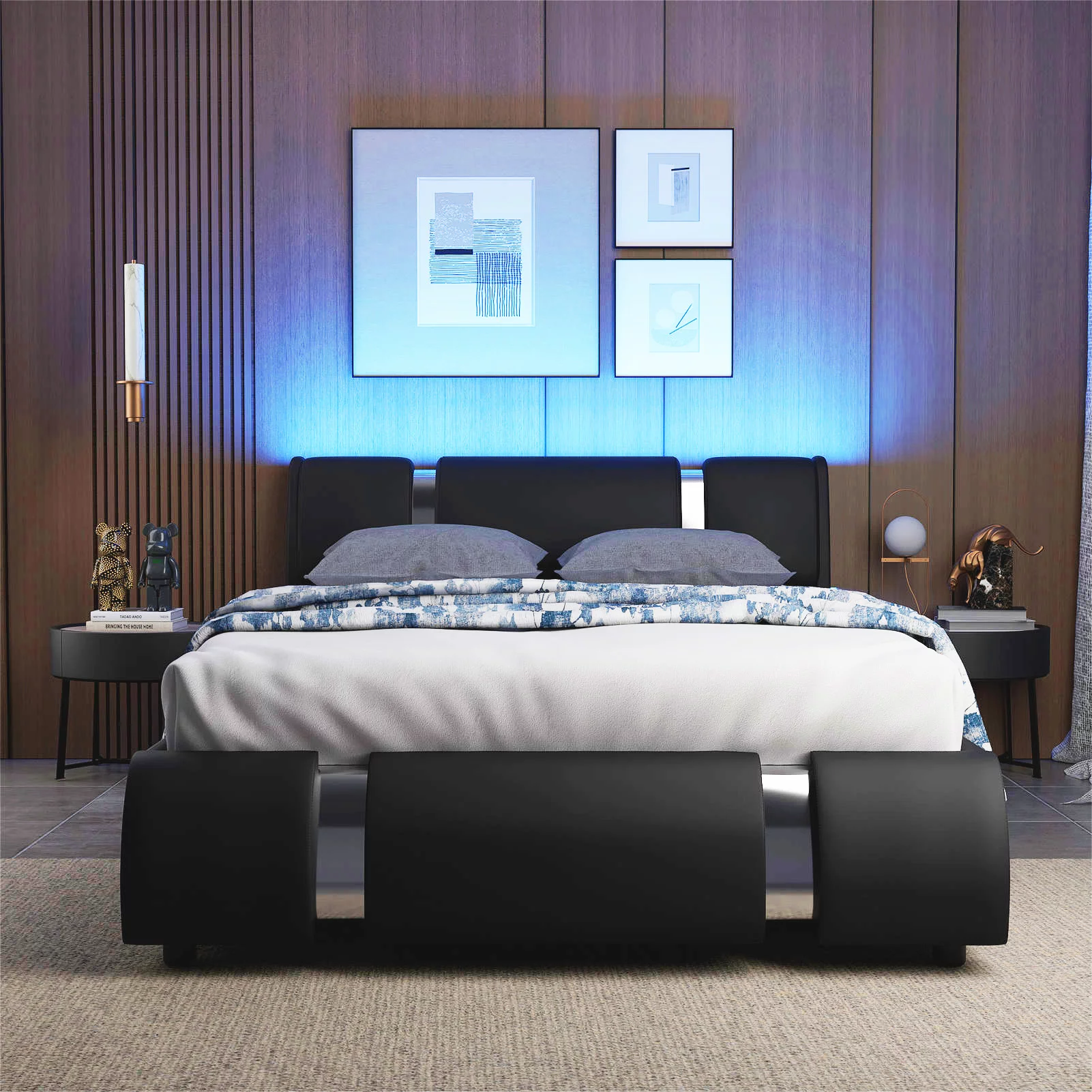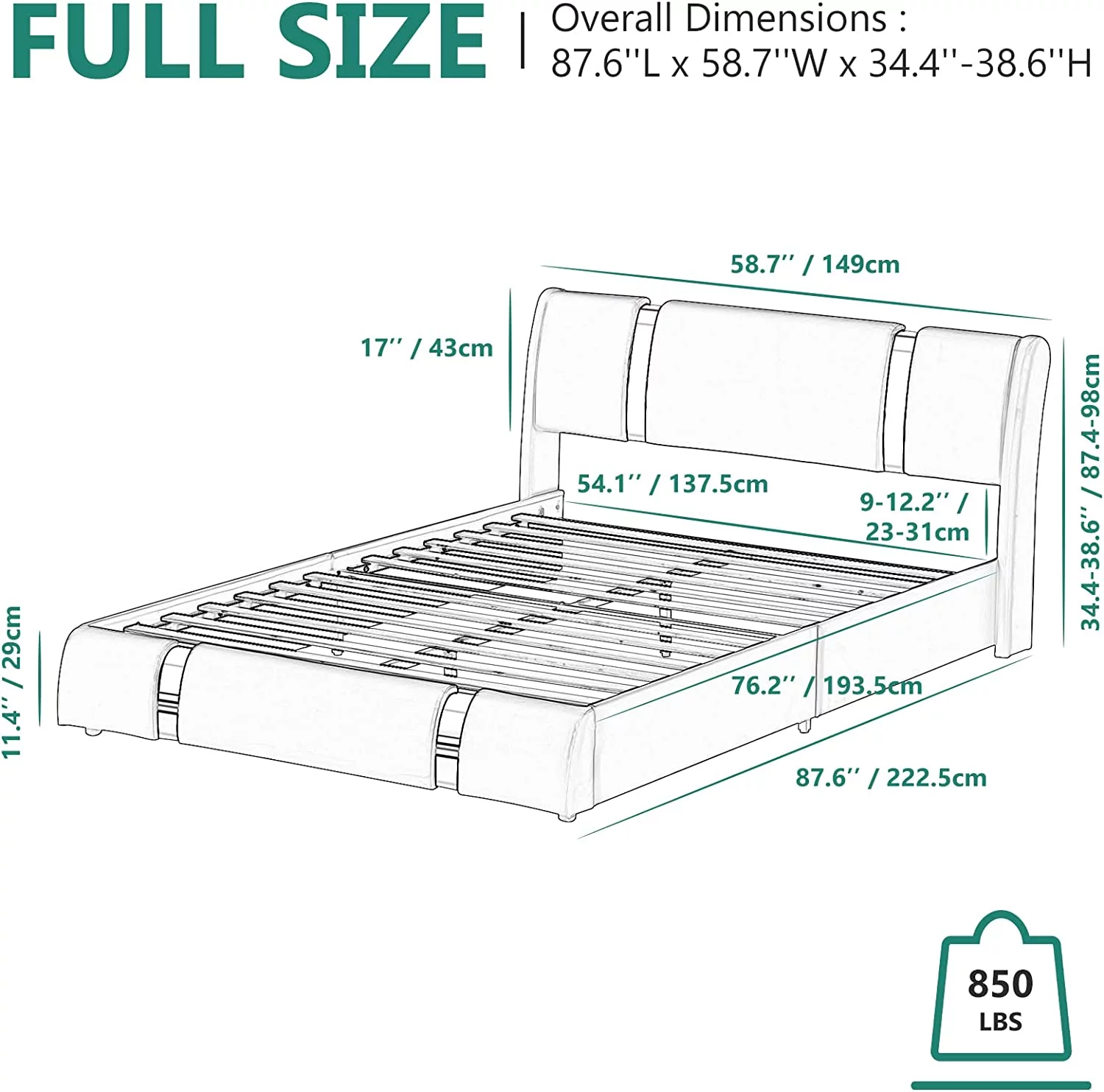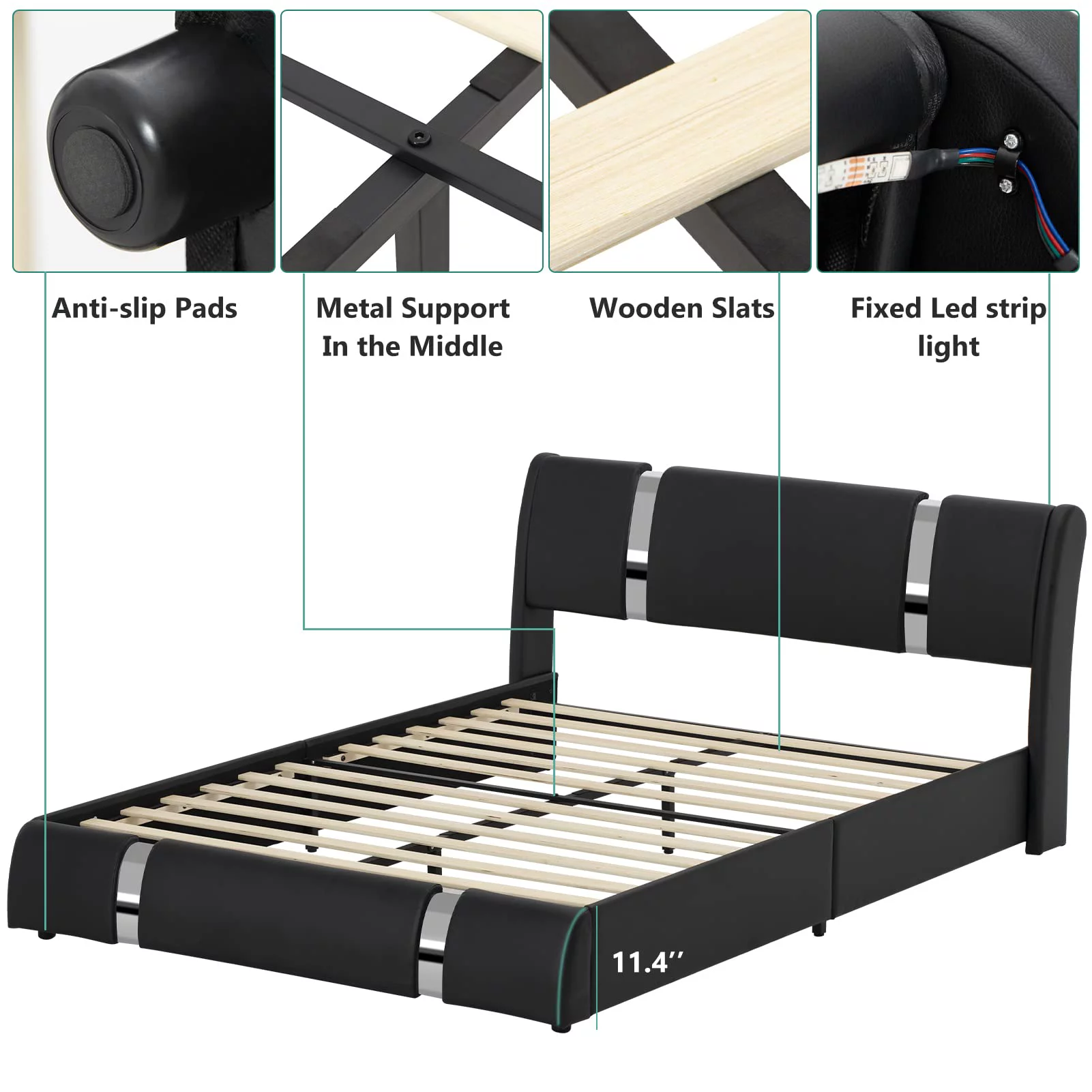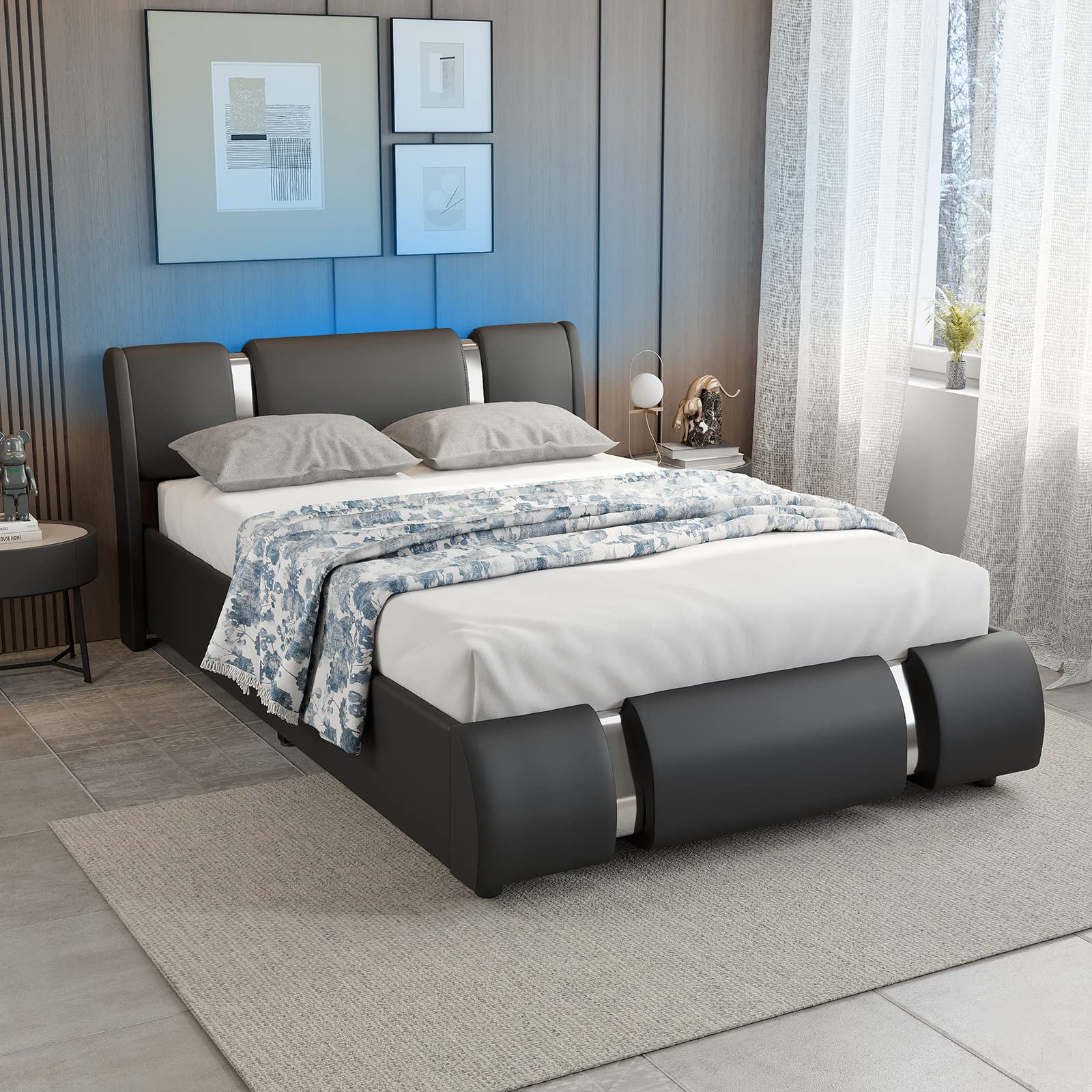 Faux Leather Bed Frame With LED Light & Adjustable Headboard, Full Size Modern Upholstered Platform Bed, Wooden Slats Bed Mattress Foundation(White-Full)