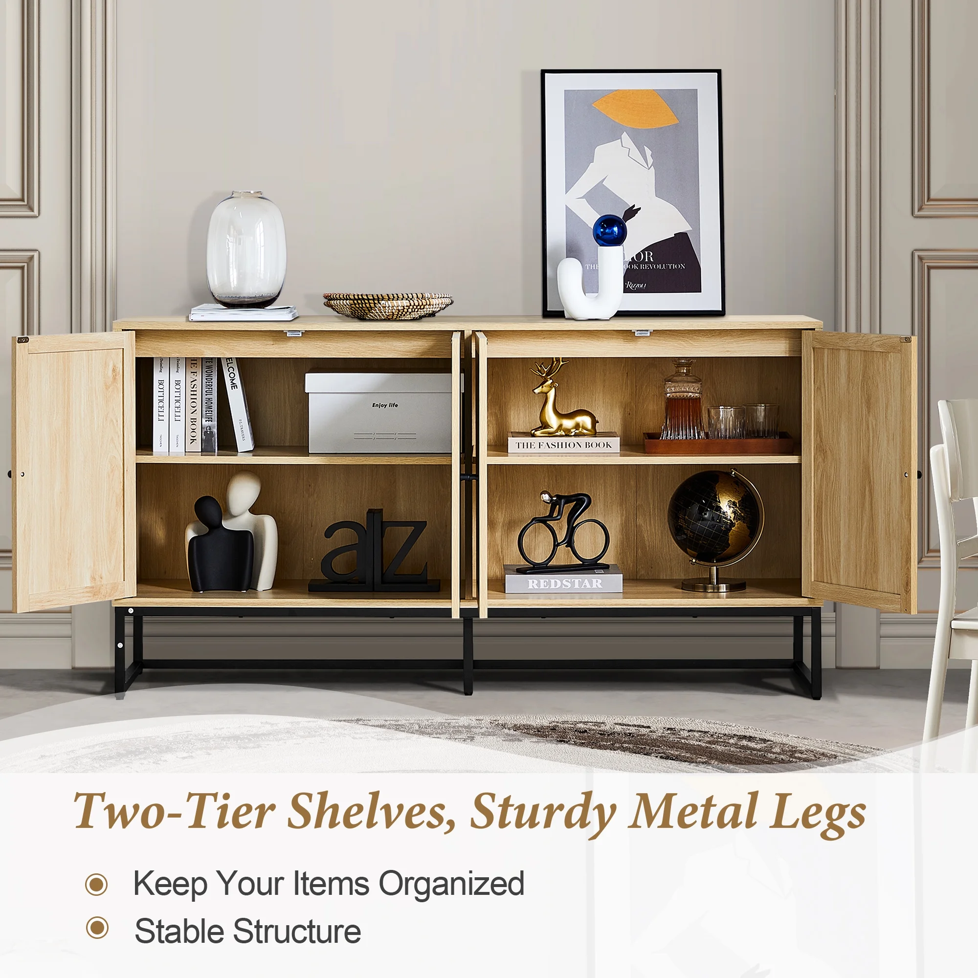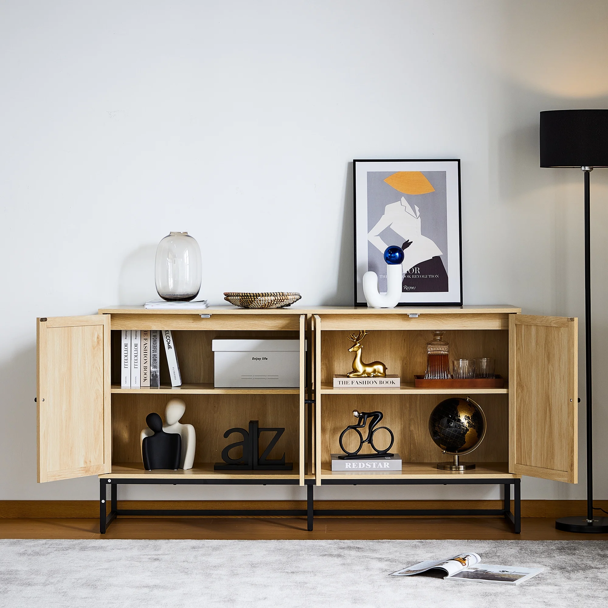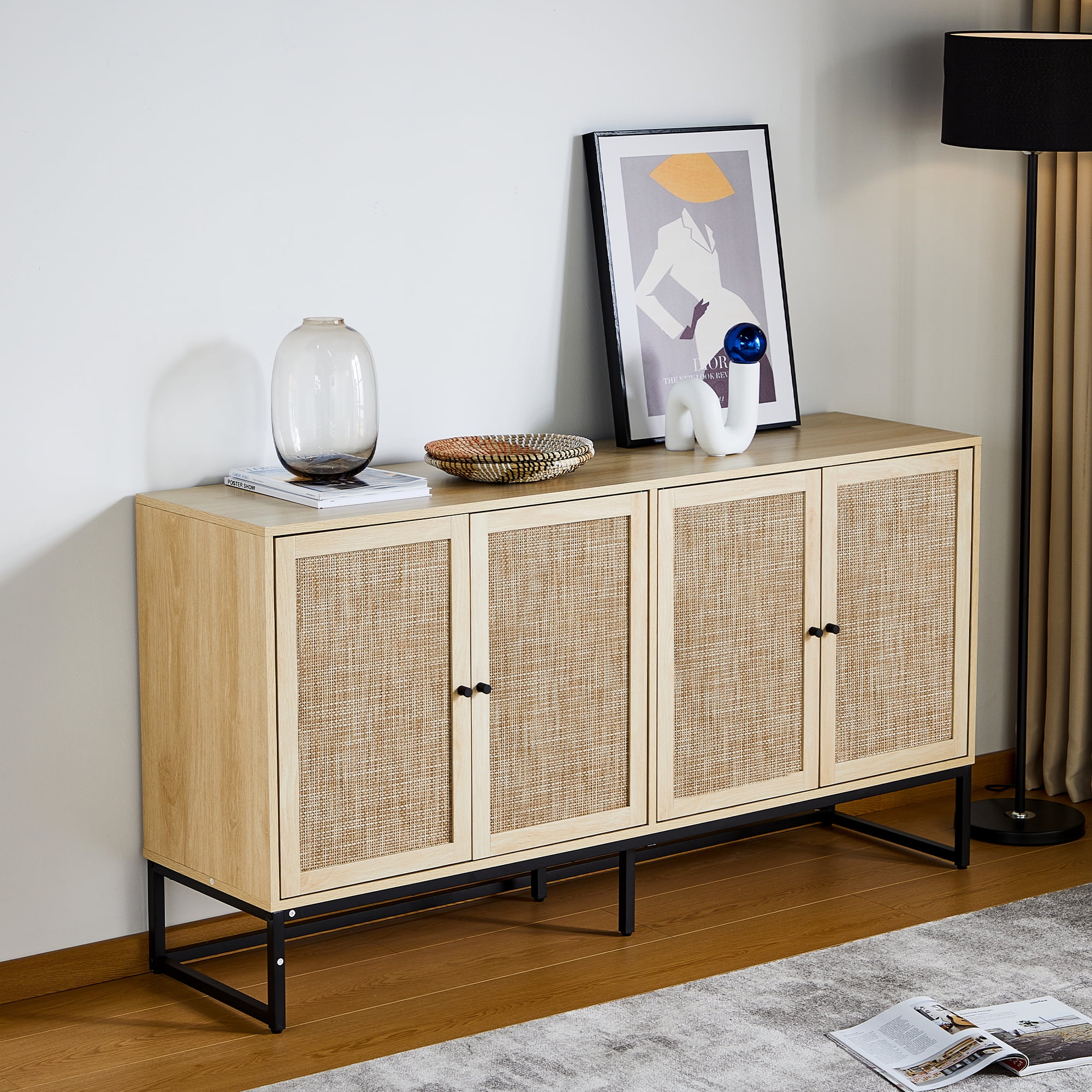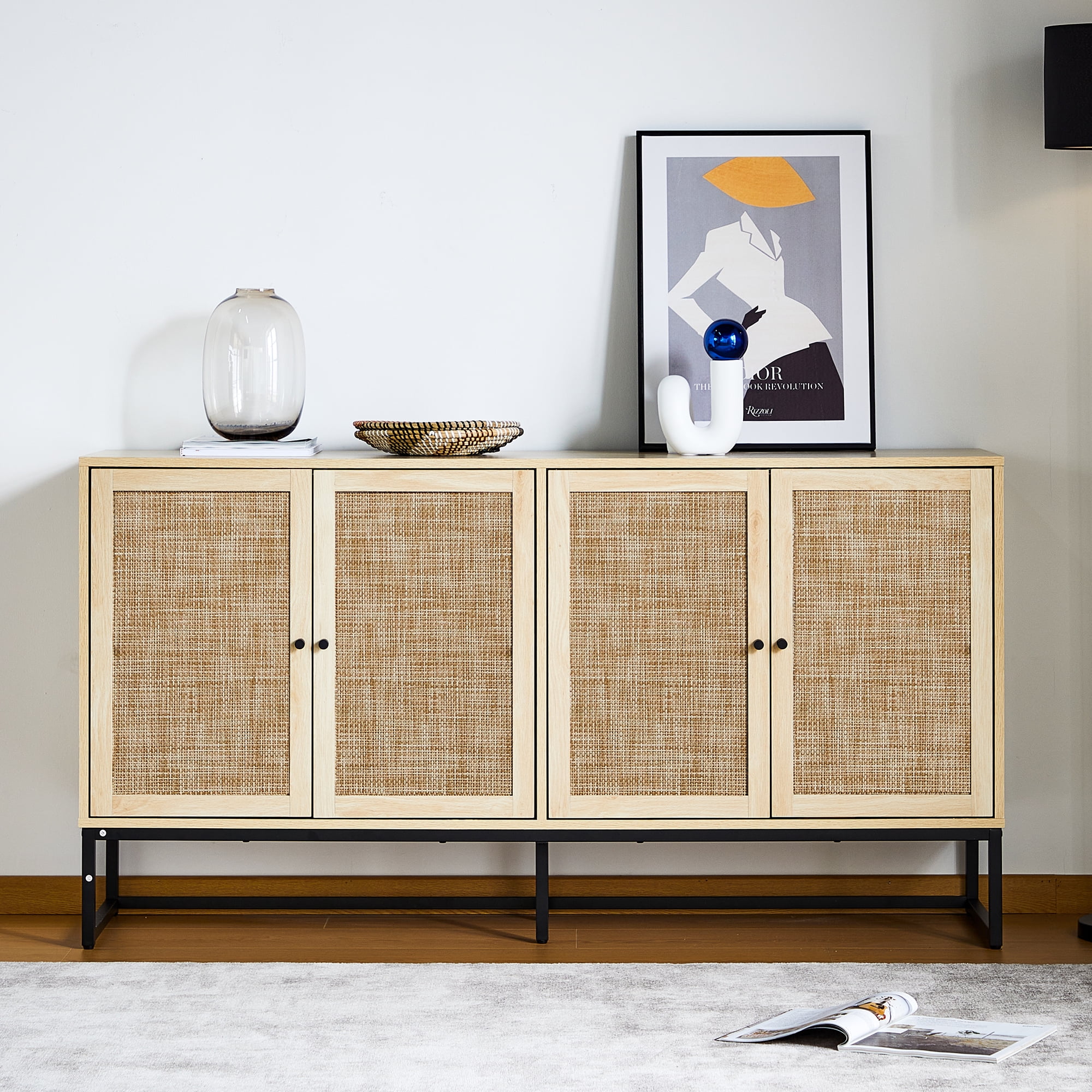 YOCWO 59.05" Buffet Sideboard Cabinets,4 Door Rattan Storage Cabinet Accent Entryway Chest Console Table for Kitchen,Dining Room, Living Room,Natural - Curated Treasures Market