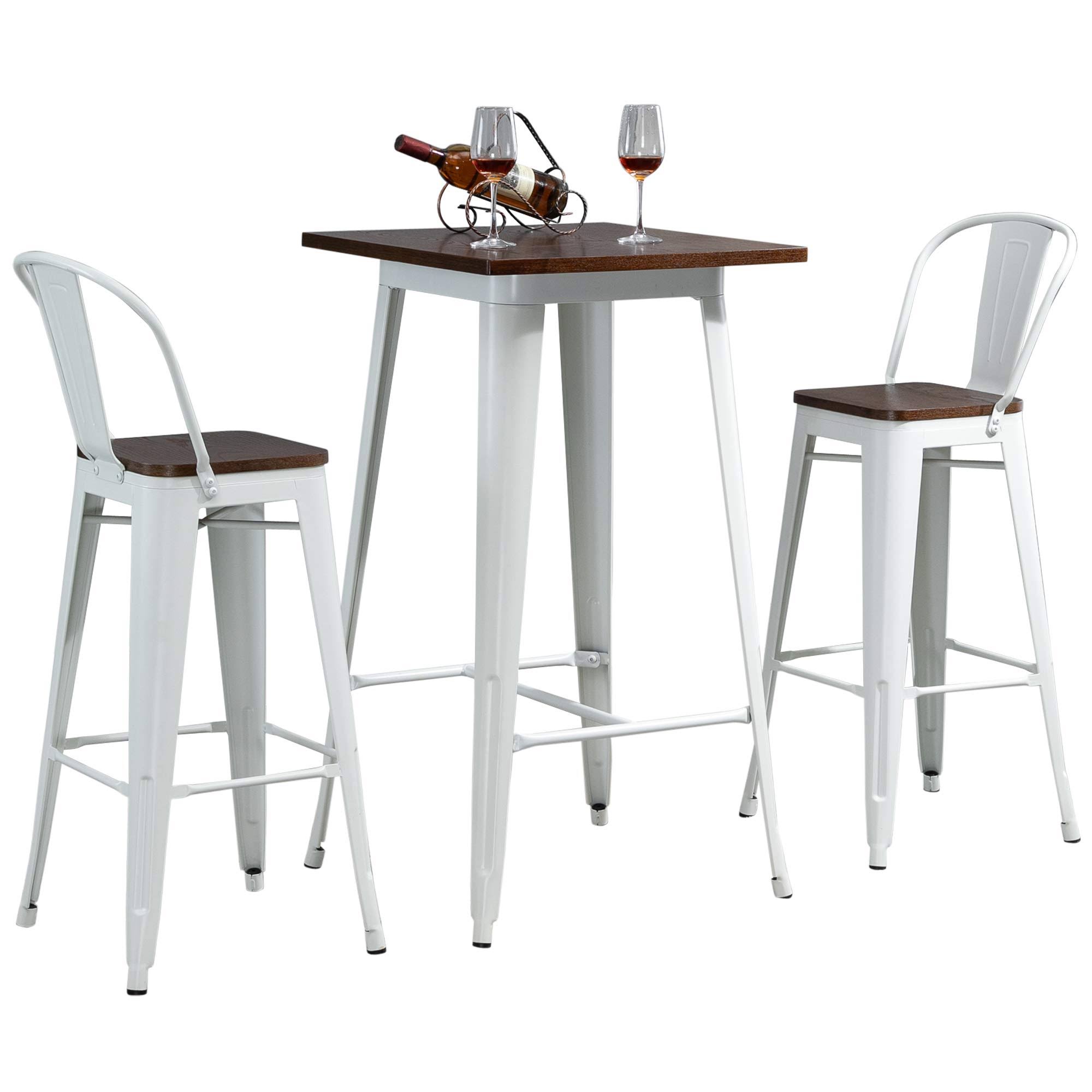 HOMCOM 3 Piece Bar Table Set with 1 Table, 2 High Back Chairs and Metal Frame with Footrests for Home - White & Brown - Megean