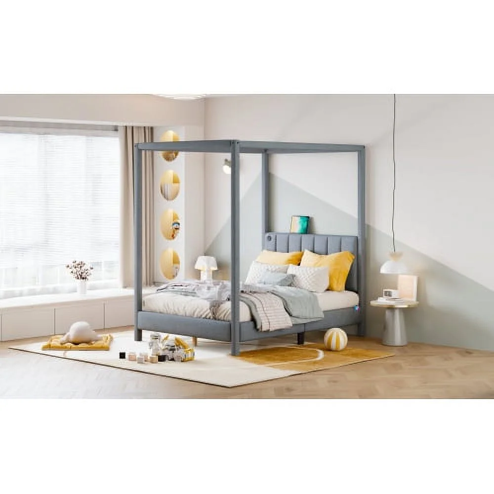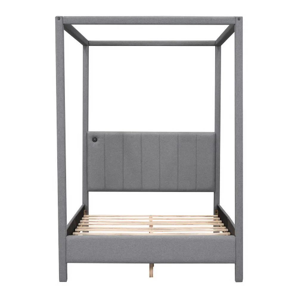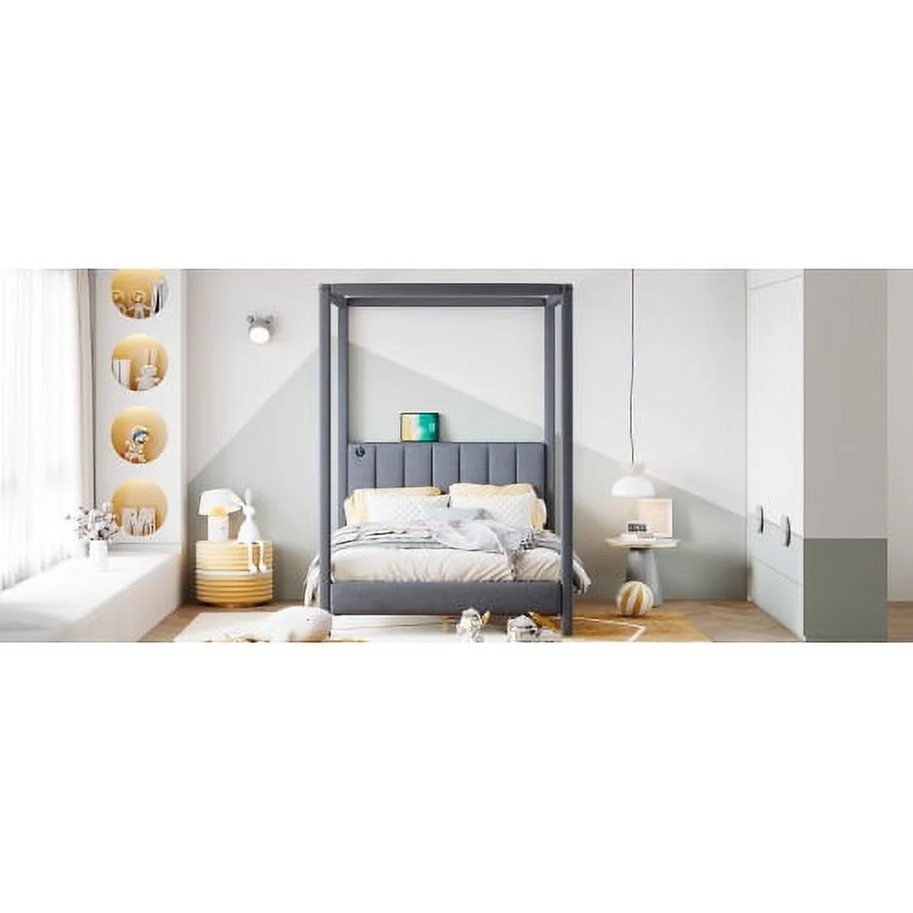 ZJbiubiuHome Full Size Canopy Platform Bed with USB and Type-C Ports Canvas Gray - Curated Treasures Market