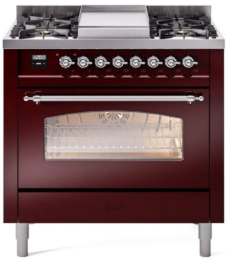 ILVE Nostalgie II 36 Dual Fuel Natural Gas Range in Burgundy with Chrome Trim, UP36FNMPBUC