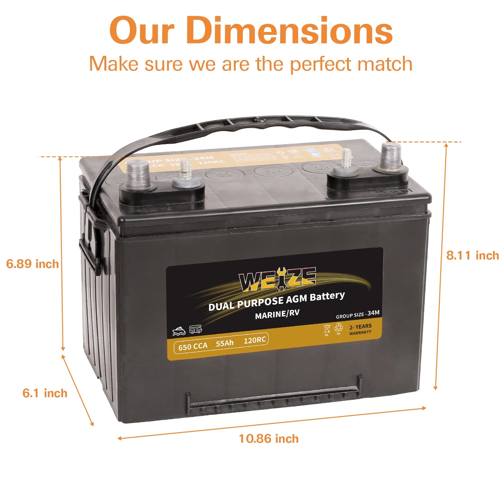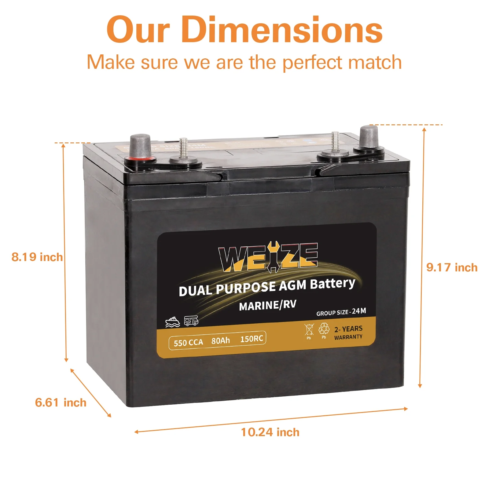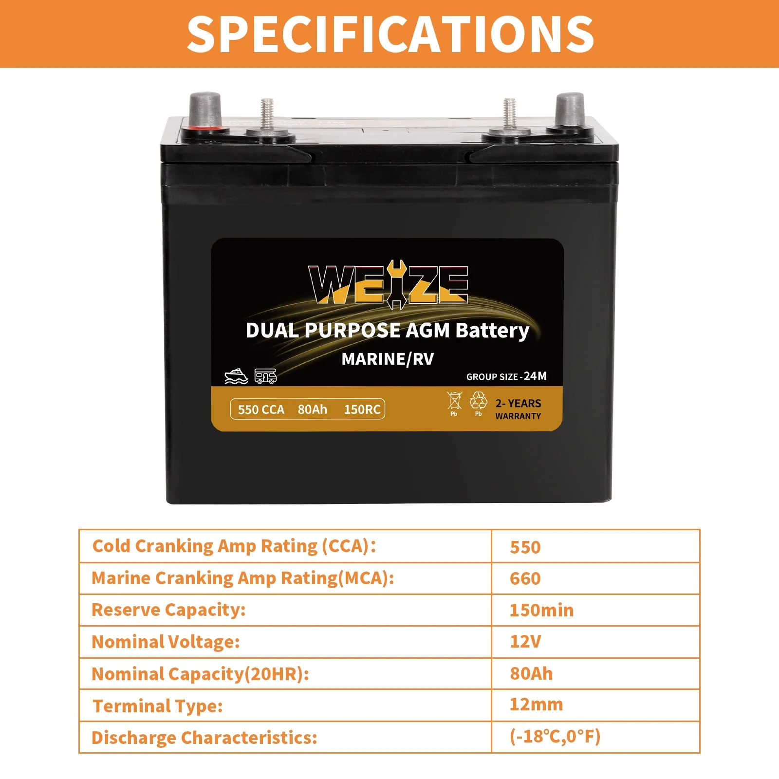 Weize 12V 80AH Dual Purpose AGM Battery, 150RC 550CCA BCI Group 24M Starter & Deep Cycle Sealed Marine & RV Battery