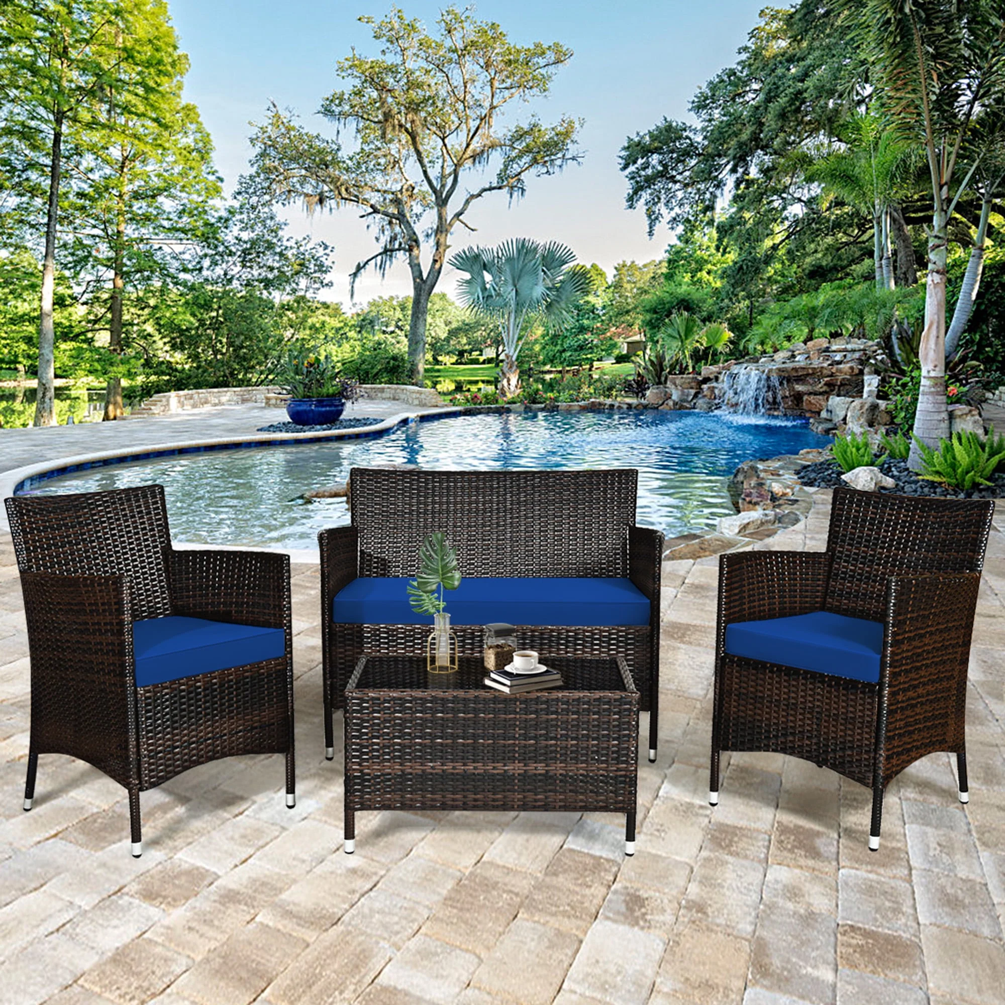 Gymax 4PCS Patio Rattan Conversation Furniture Set Outdoor Turquoise Cushioned