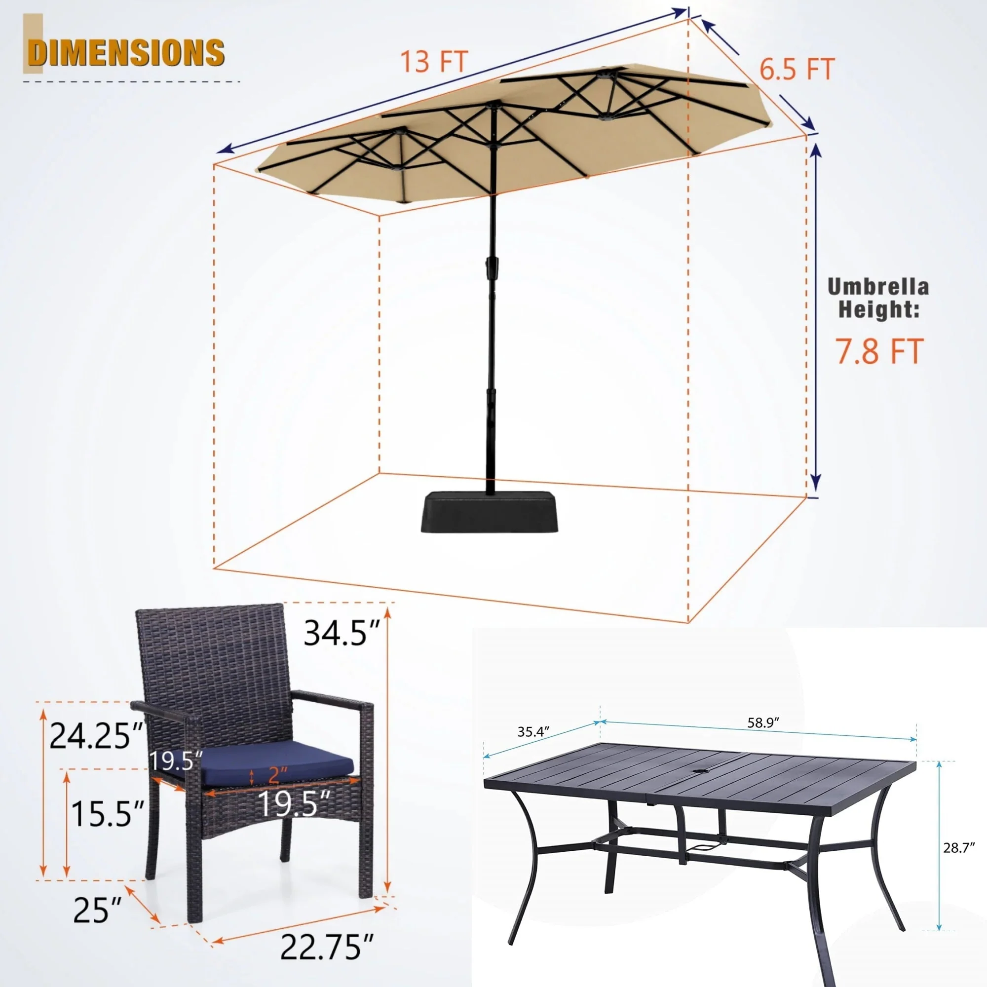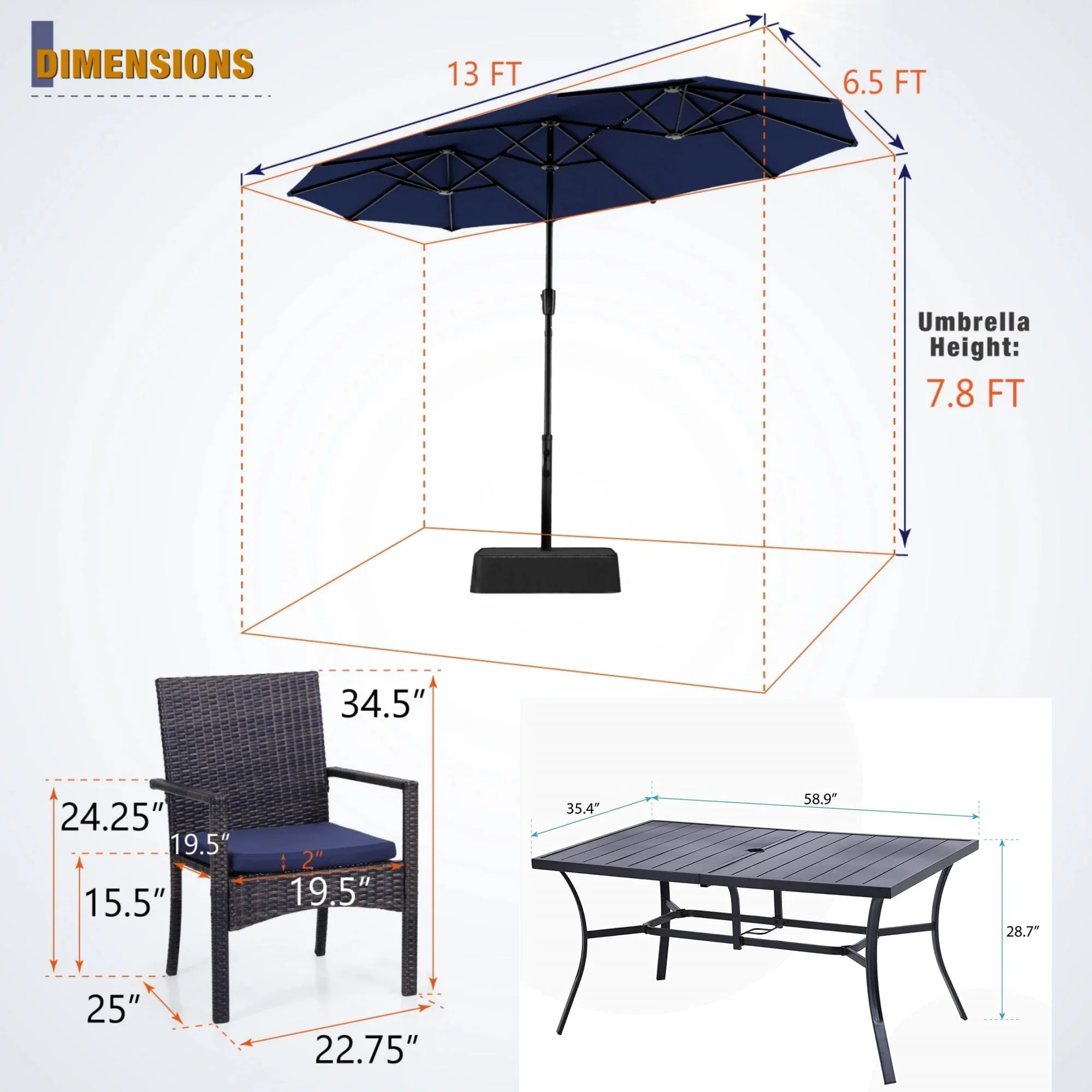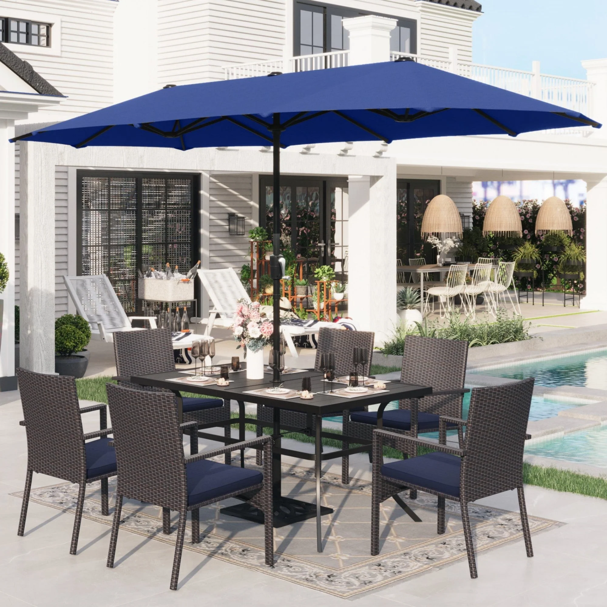 Sophia & William 8 Pieces Outdoor Patio Dining Set with 13 ft Navy Umbrella, Rattan Chairs & Metal Table for 6