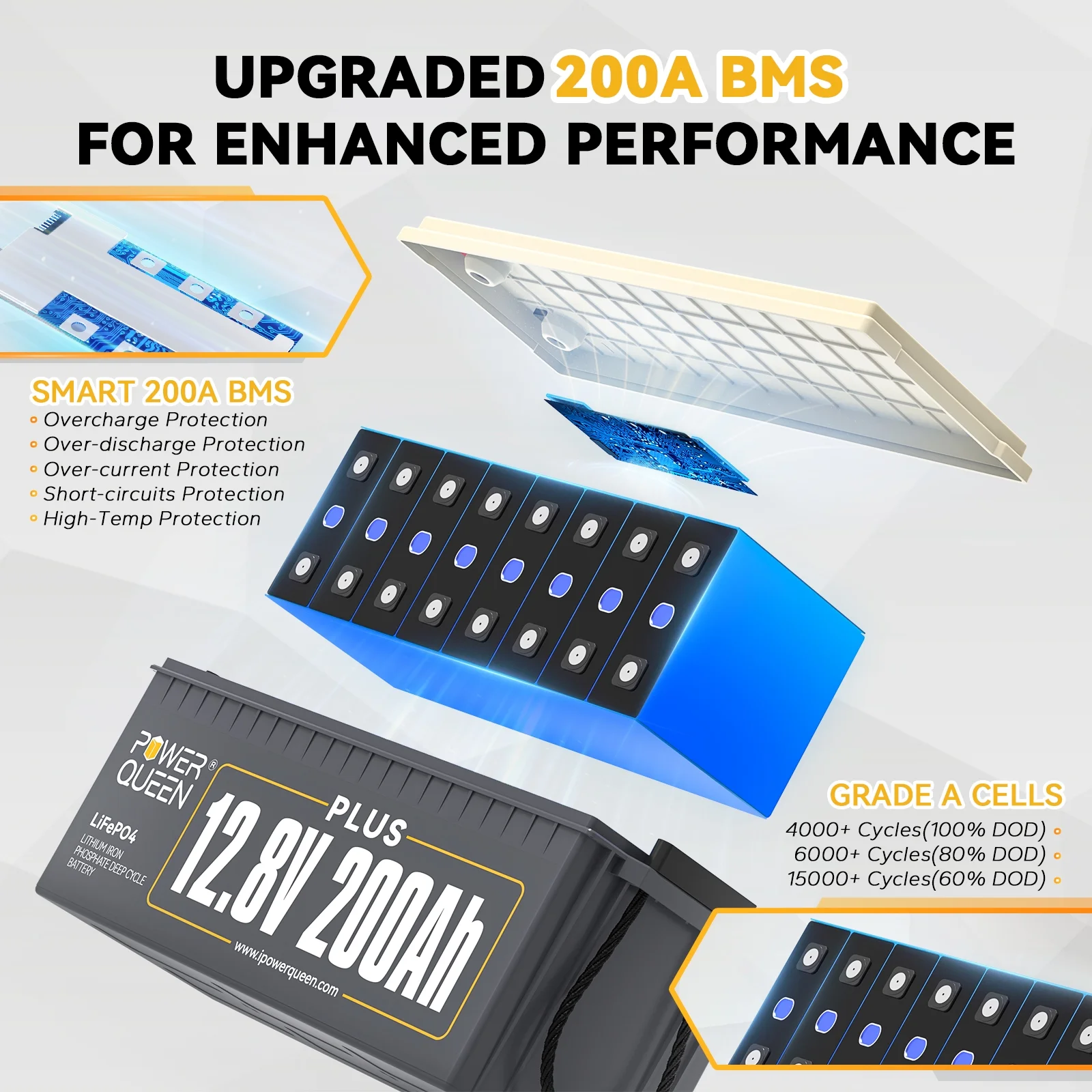 Power Queen 12V 200AH Plus LiFePO4 Deep Cycle Lithium Battery+Charger for RV Off-Grid Solar