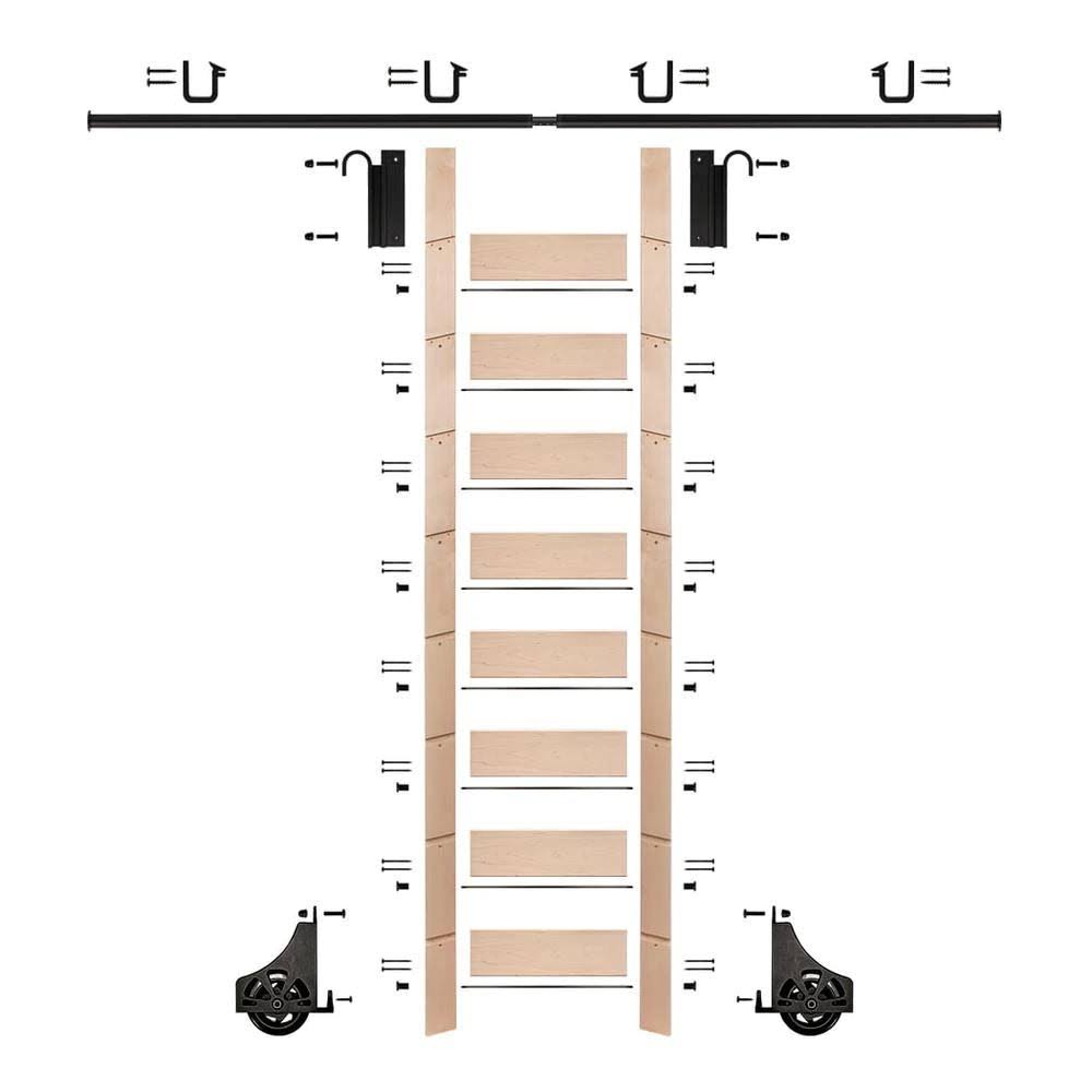 Custom Service HardwareARE 107 in. Clear Pre-Finished Maple Library Ladder (119 in. Reach) Black Sliding Hook Ladder Kit with 8 ft. Rail - Megean