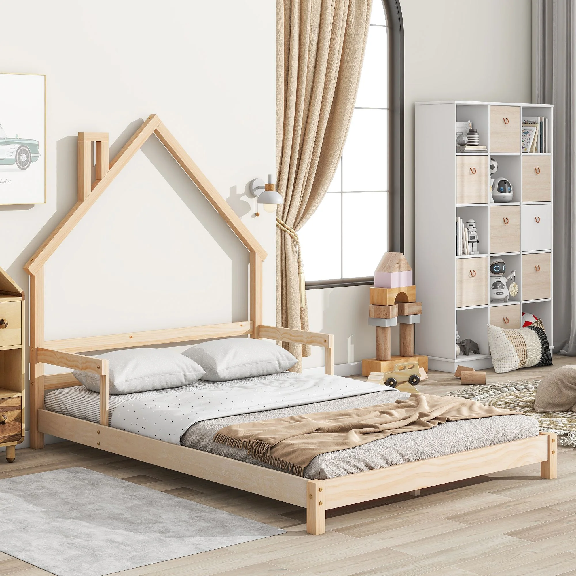 Wood House-Shaped Headboard Floor Bed Mattress Foundation with Handrails .Slats. Bed Frame Storage Bed w/ Wooden Slats for Boy Girl. No Box Spring Needed. Easy Assembly