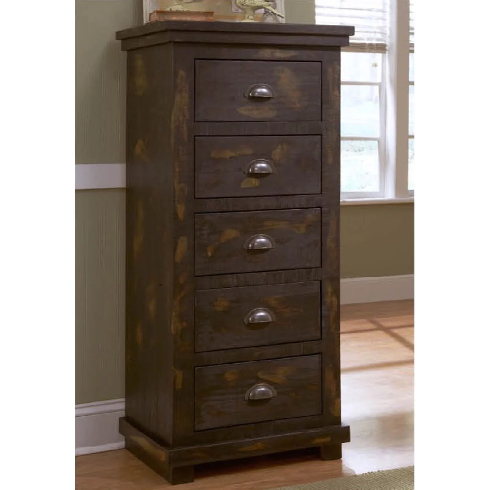 Progressive Furniture Willow 5 Drawer Wood Lingerie Chest in Distressed Pine Tan