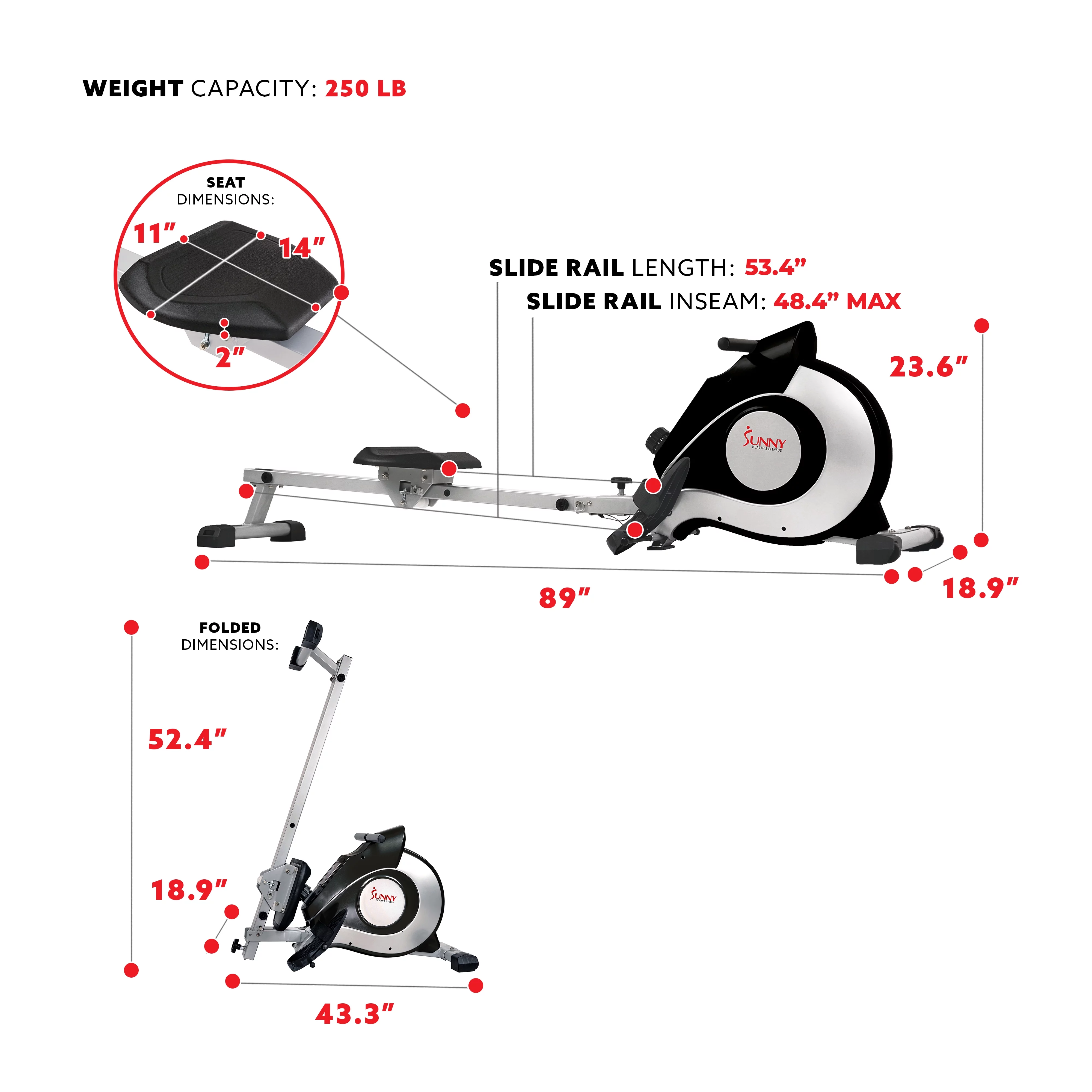 Sunny Health & Fitness Smart Magnetic Rowing Machine with Extended Slide Rail with Optional Exclusive SunnyFit® App Enhanced Bluetooth Connectivity SF-RW5515