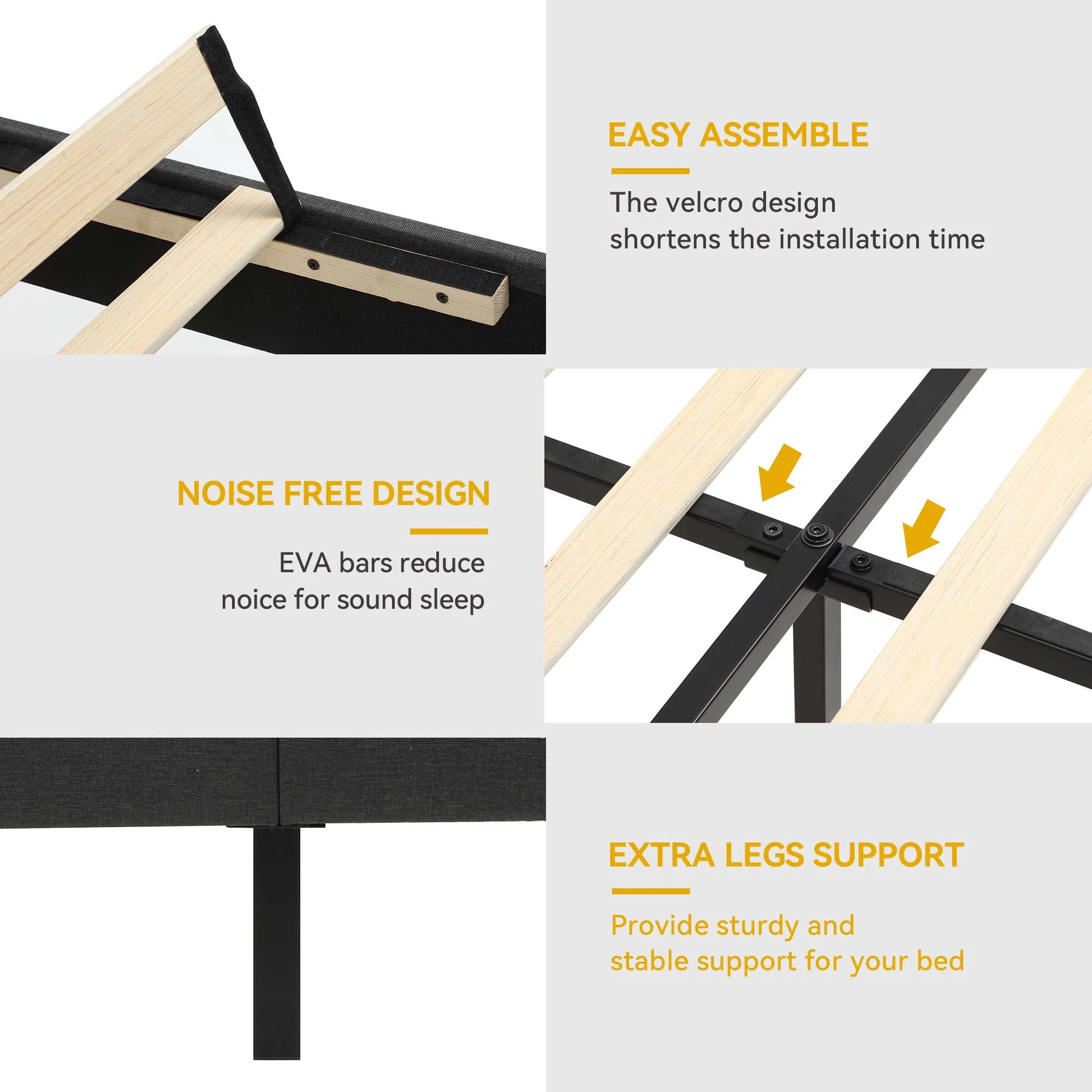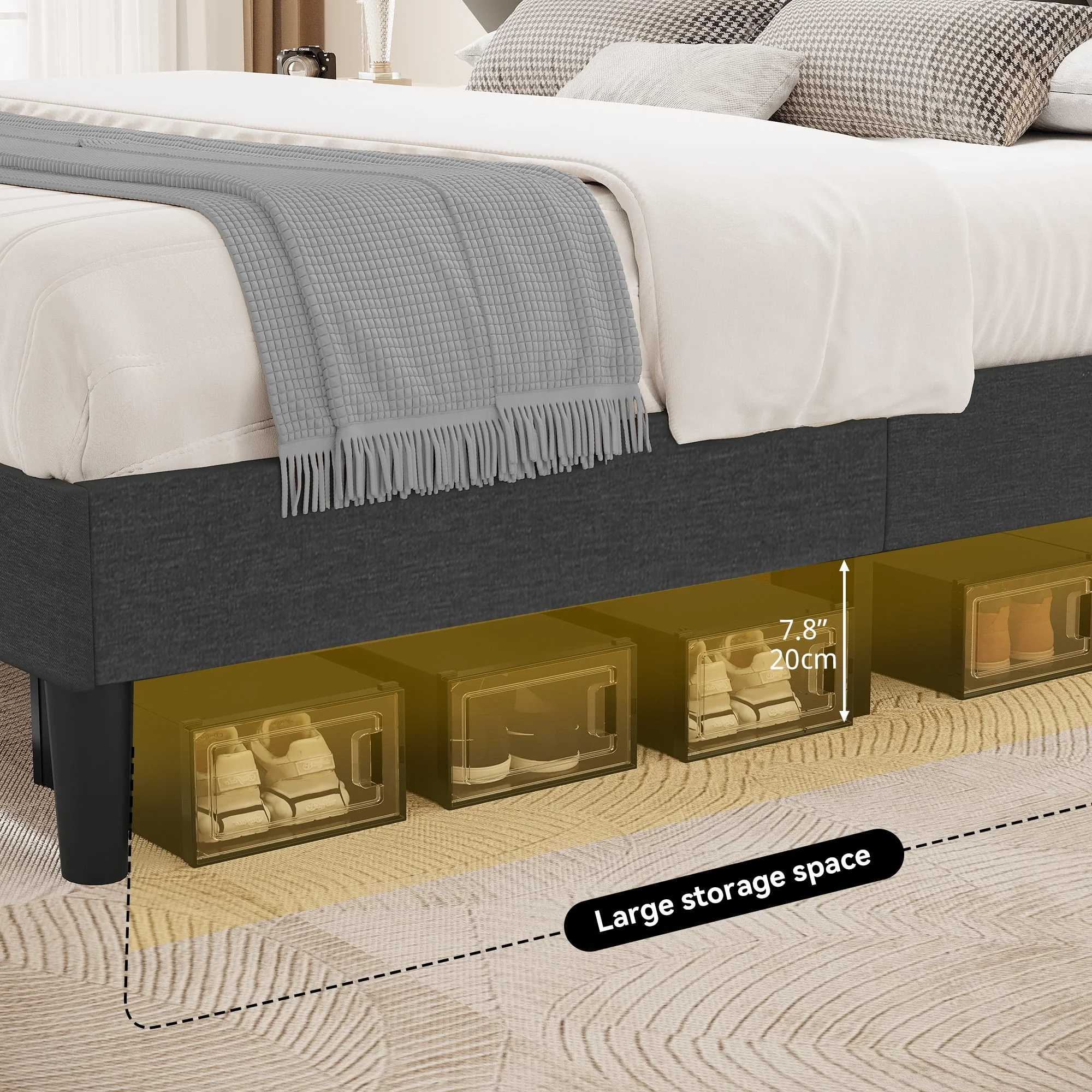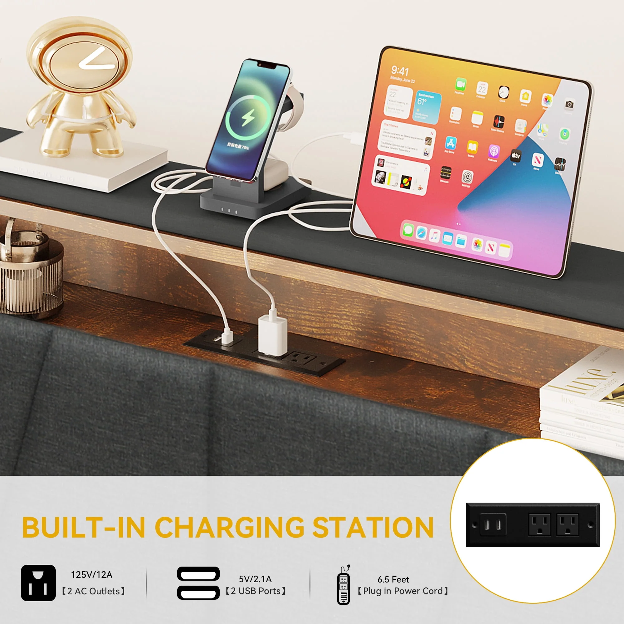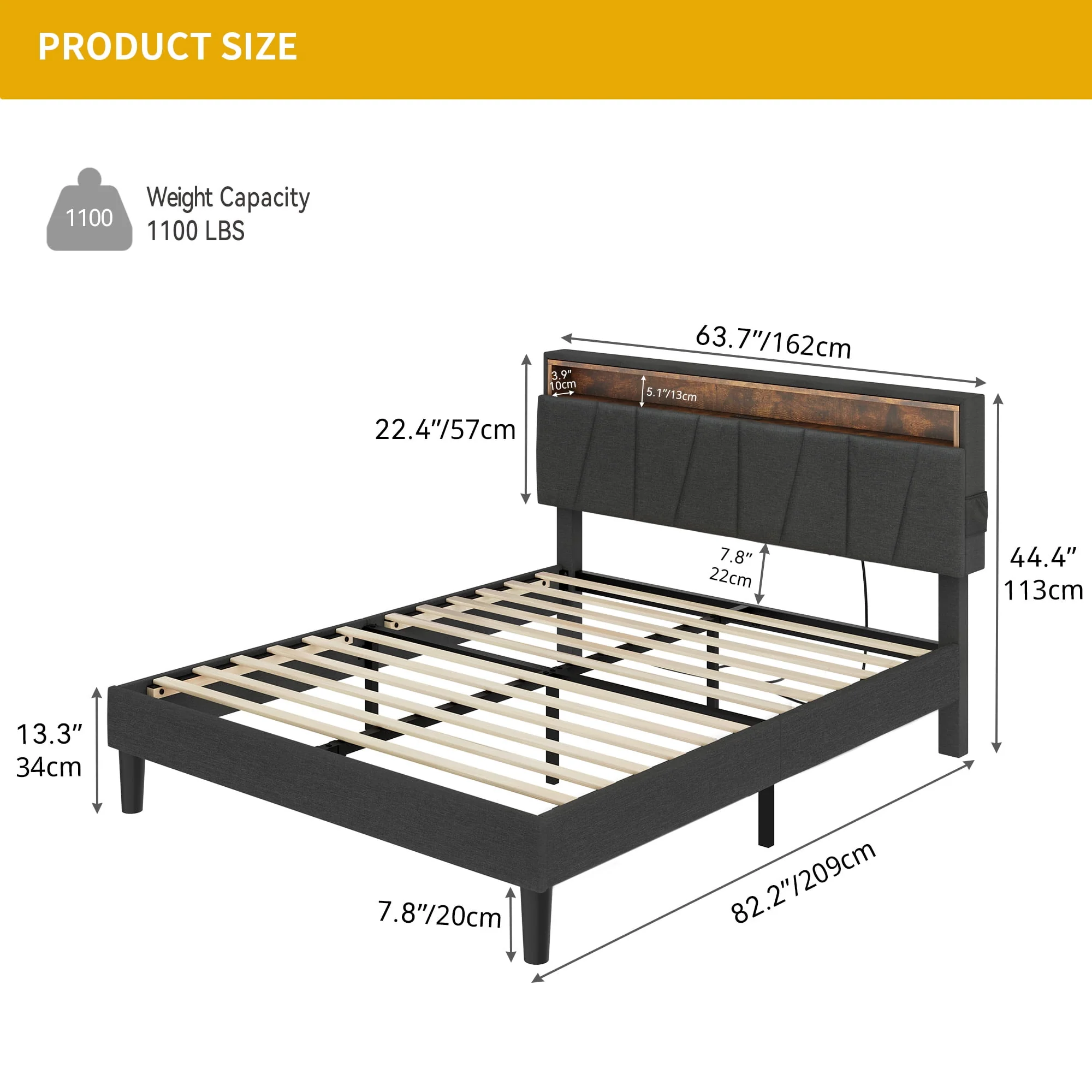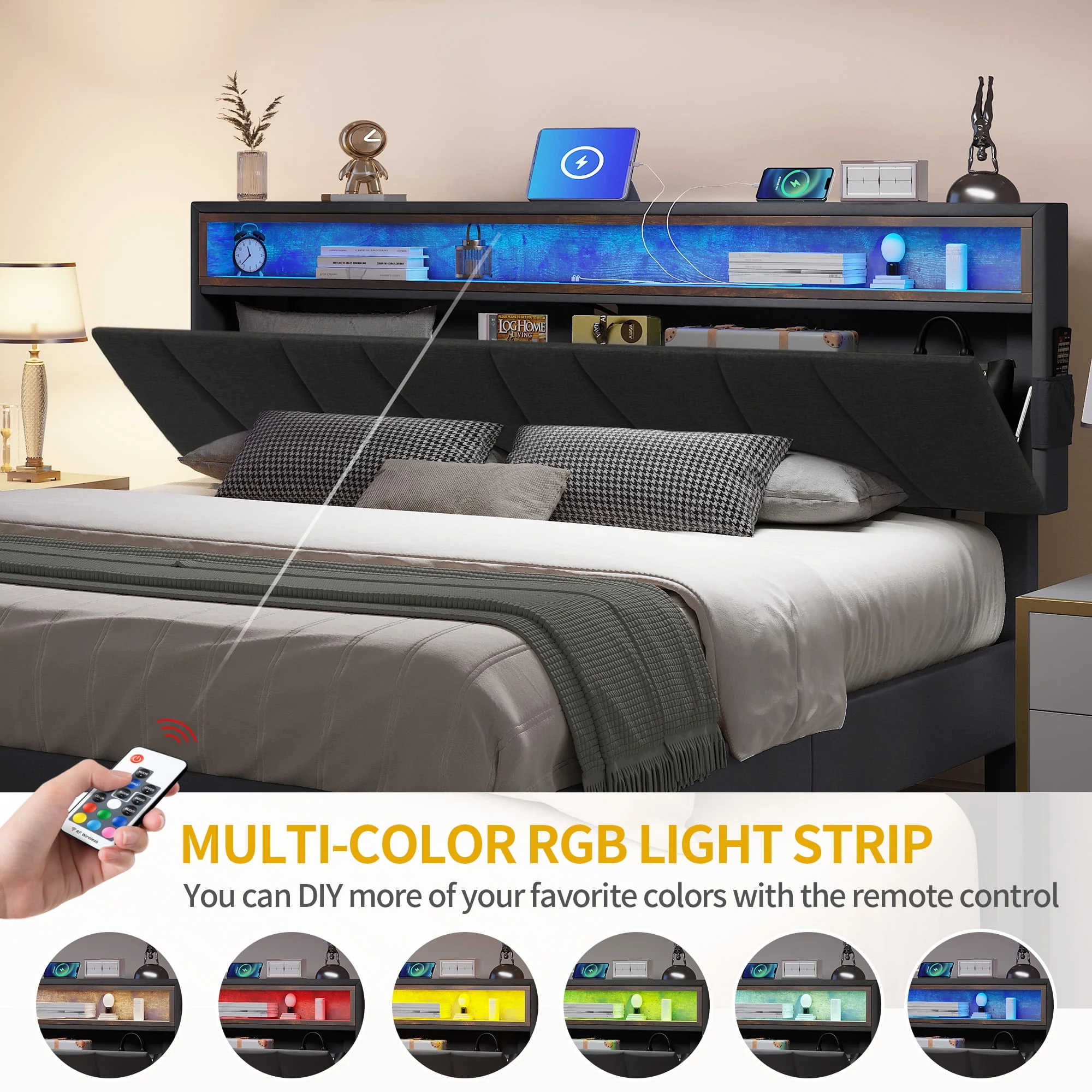 Dextrus Queen Size Bed Frame, Storage Bed Frame with LED&Upholstered Headboard, Platform Bed with Outlet & USB Ports, No Box Spring Needed, Grey