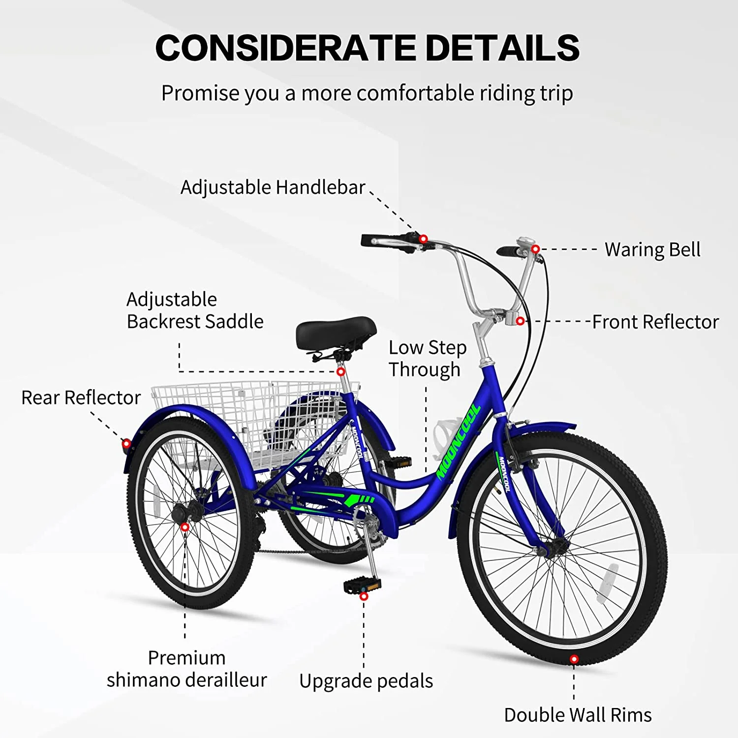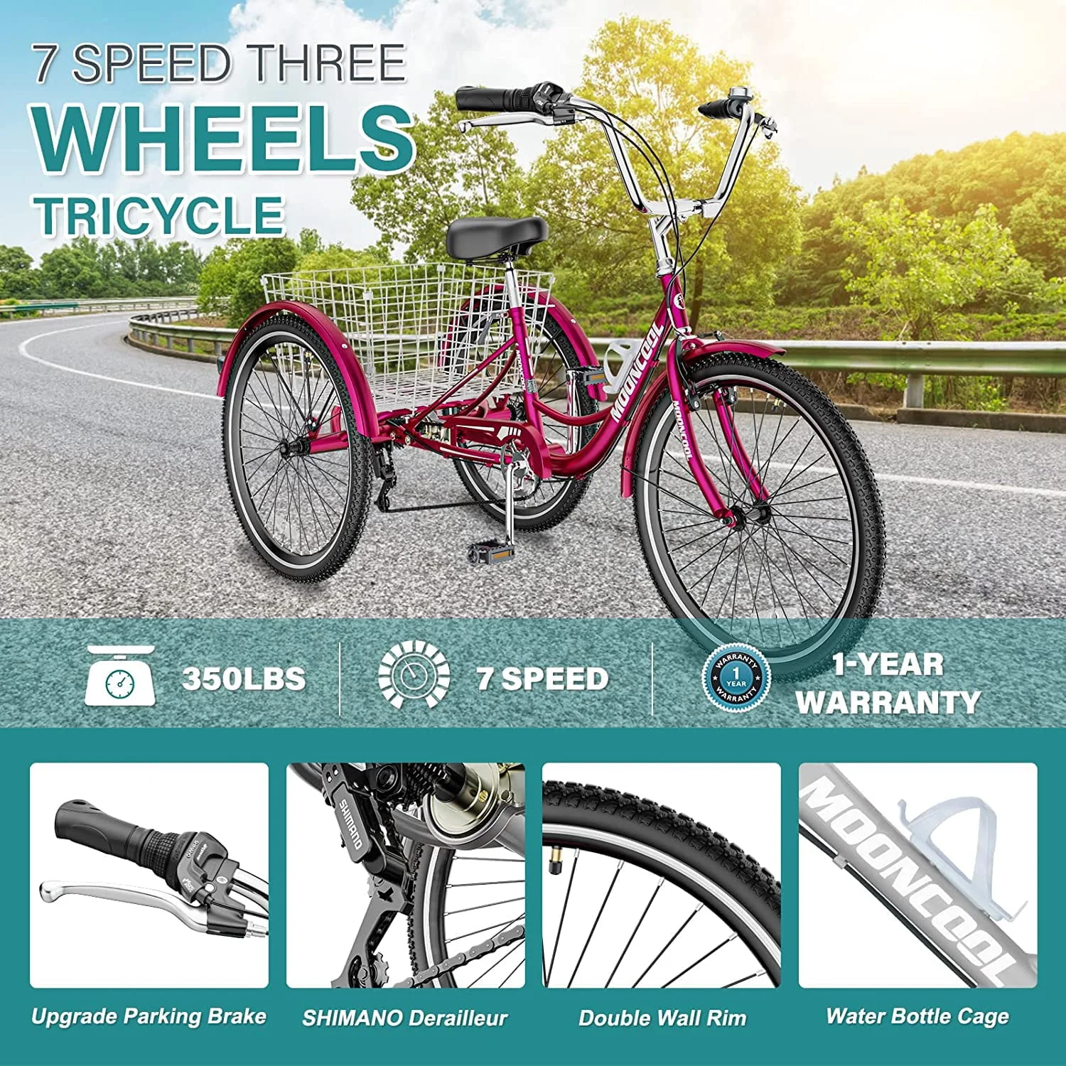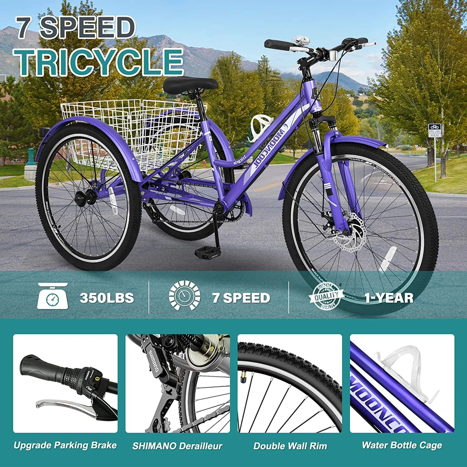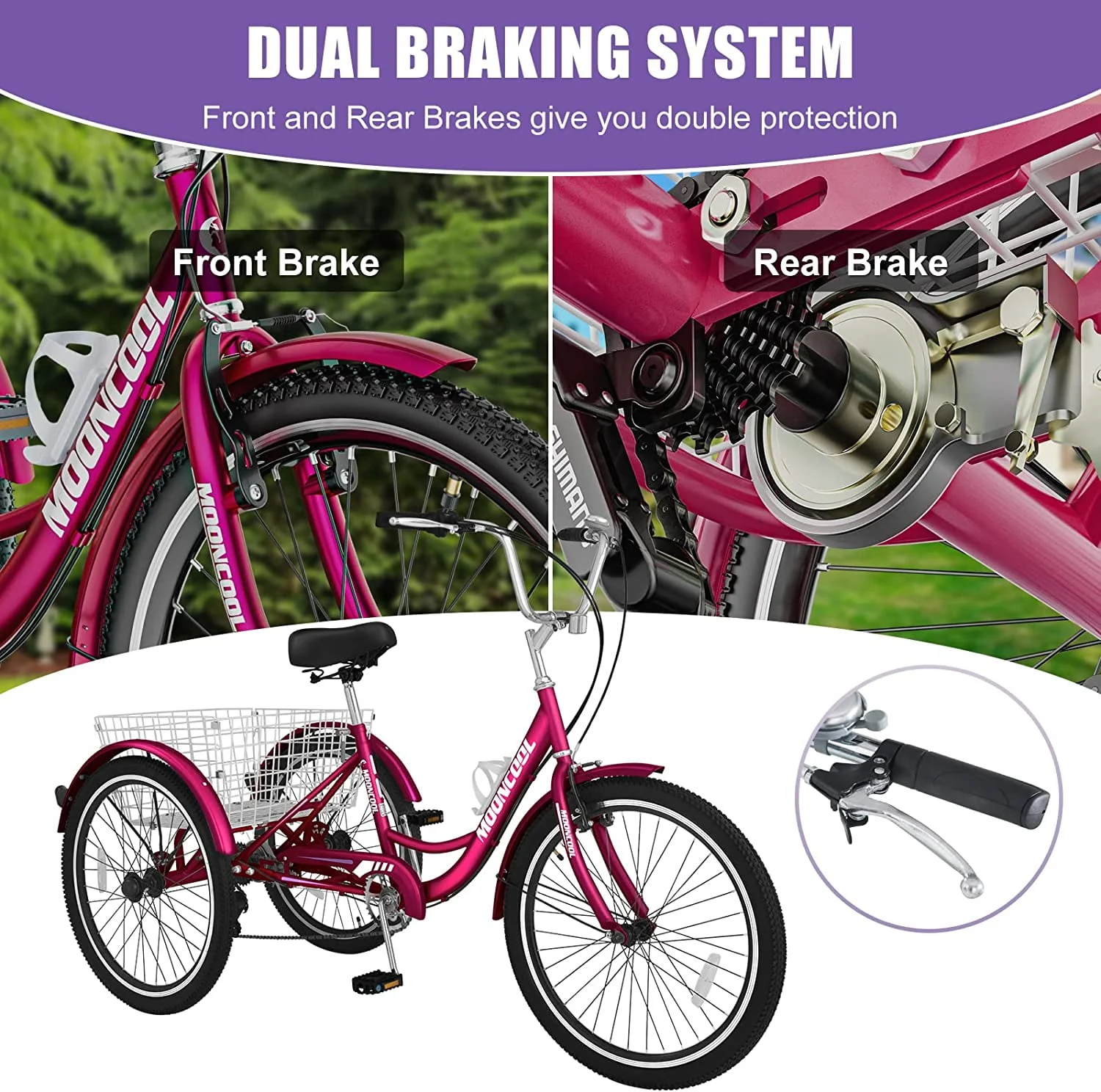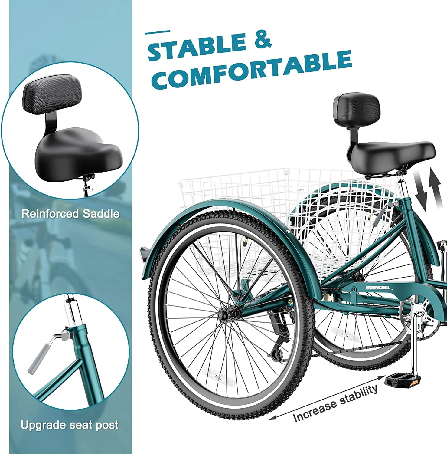 Mooncool Adult Tricycle 20/24/26 inch 7 Speed, Three Wheel Bicycle for Adult, Trike Cruiser W/ Tools & Big Basket for Exercise Shopping Picnic Outdoor Activities