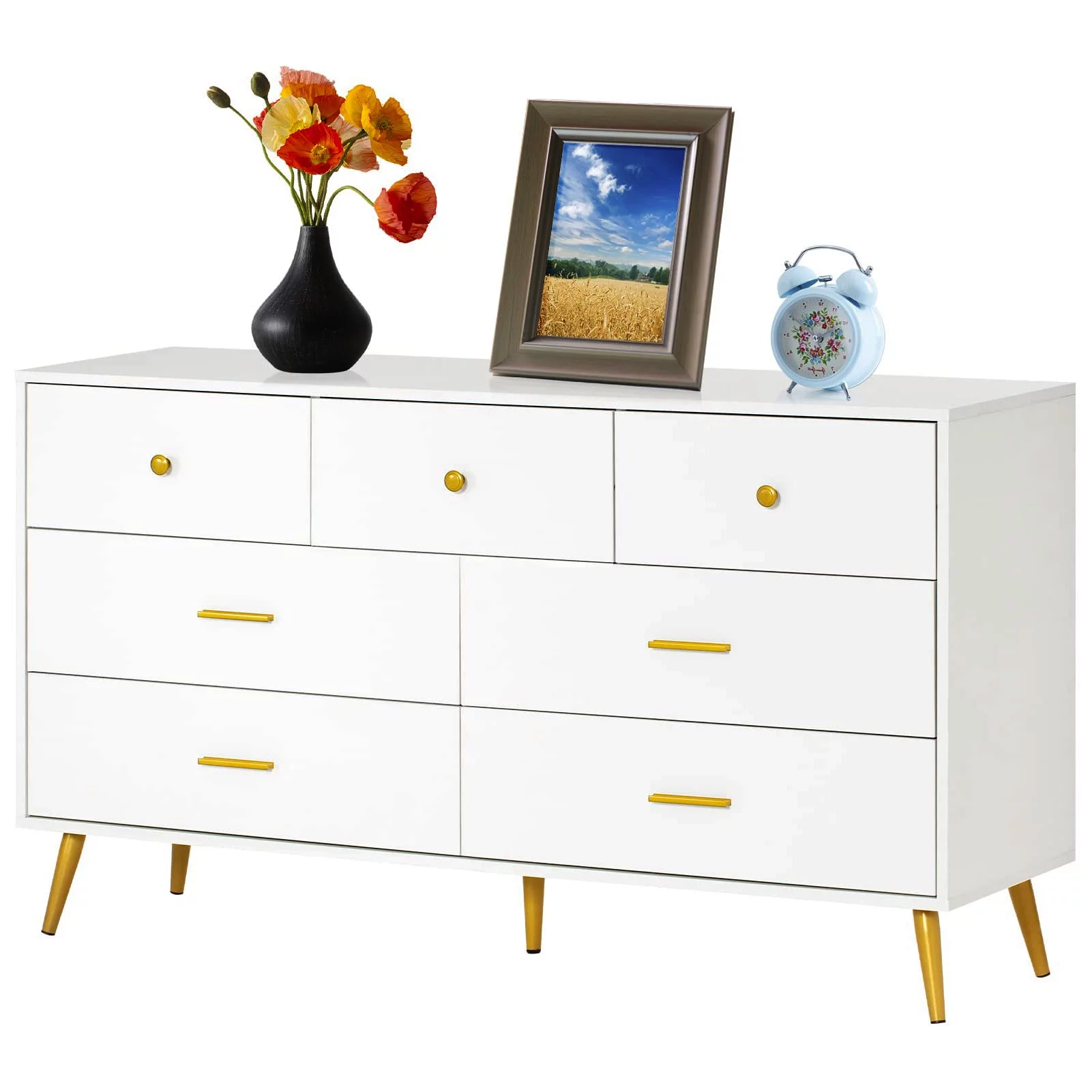 7 Drawer Dresser For Bedroom, 55-inch White and Gold Dresser Chest of Drawers Wood Bedroom Organizer(White-7 Drawers)