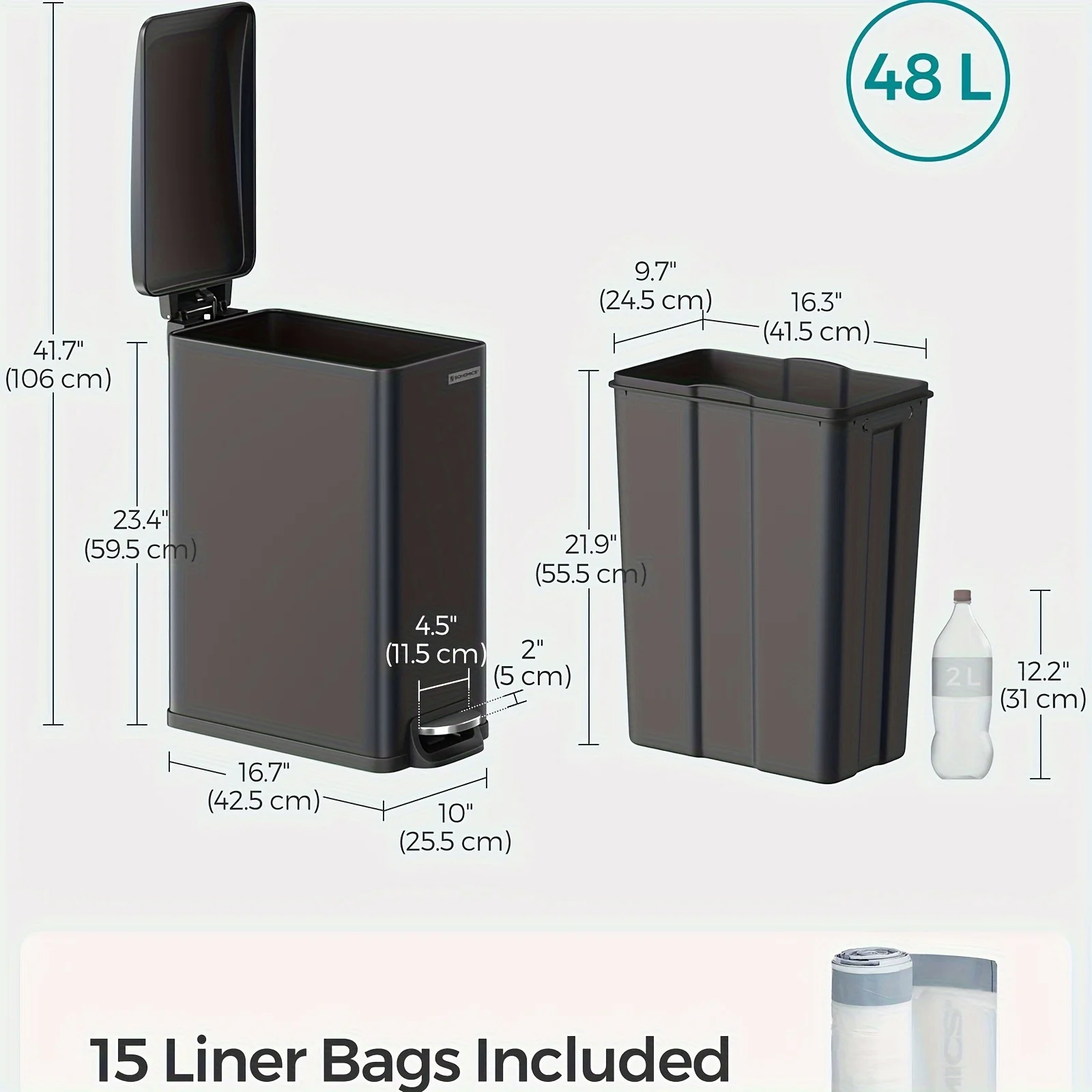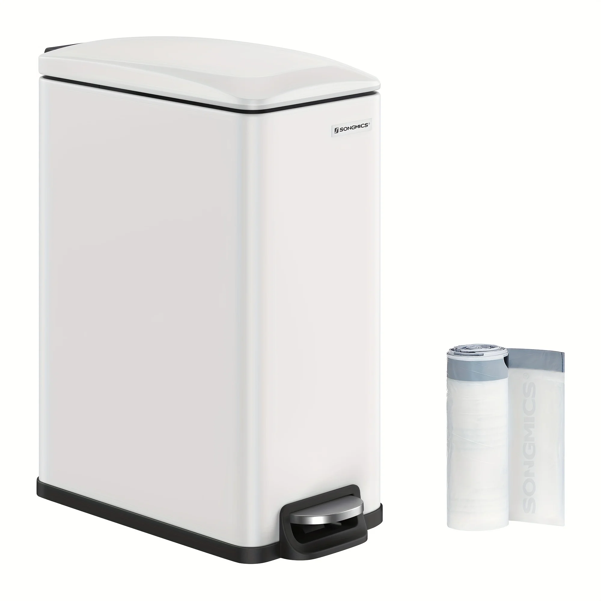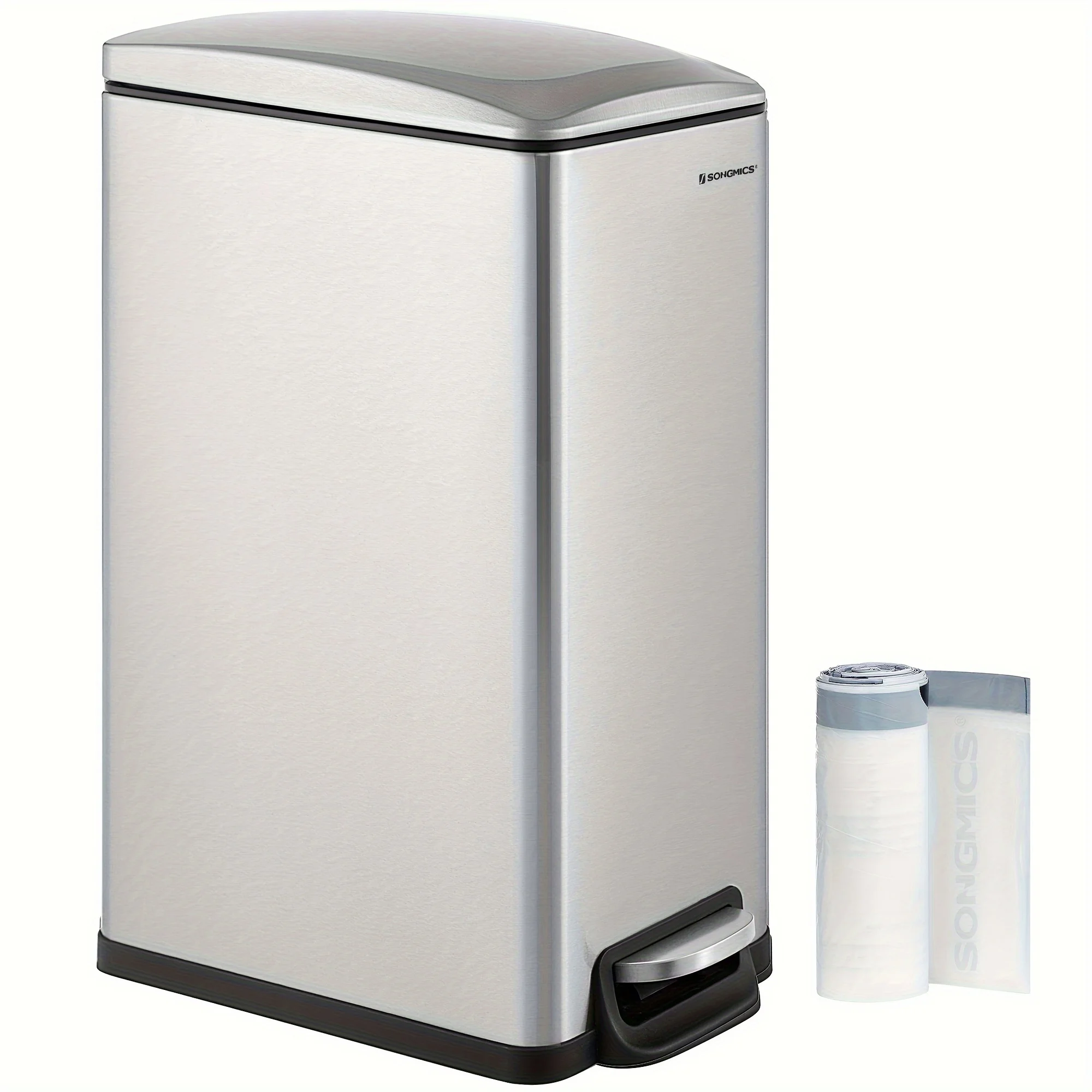 Slim Trash Can, 12.7 Gallon Garbage Can for Narrow Spaces with Soft-Close Lid, Inner Bucket, and Step-on Pedal, Stainless Steel, 15 Trash Bags Included - Curated Treasures Market