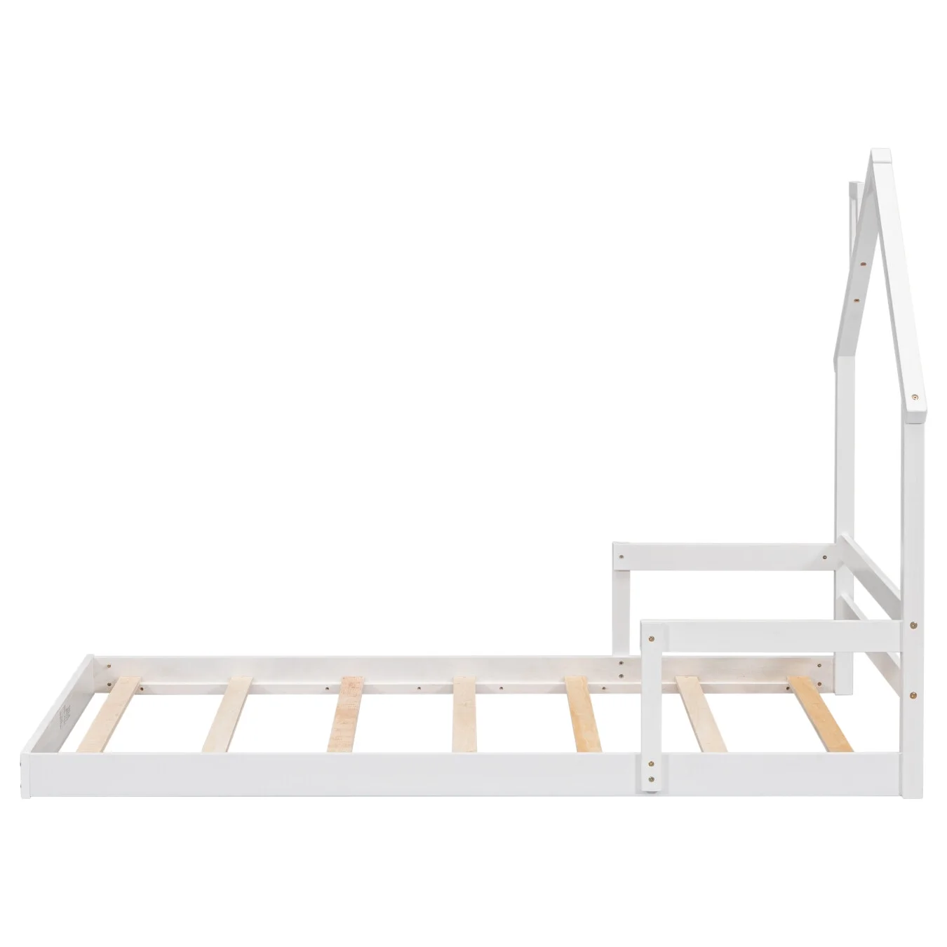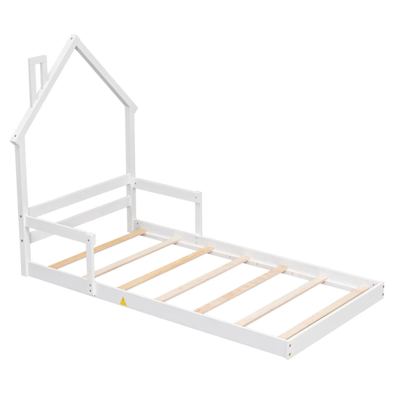 Twin Floor Bed Frame with Roof, Wooden Montessori House-Shaped Bed with Wood Slats Support,Twin Size Platform Bed Frame Floor Bed with Handrail for Kids,Girls,Boys,No Box Spring Needed,Grey