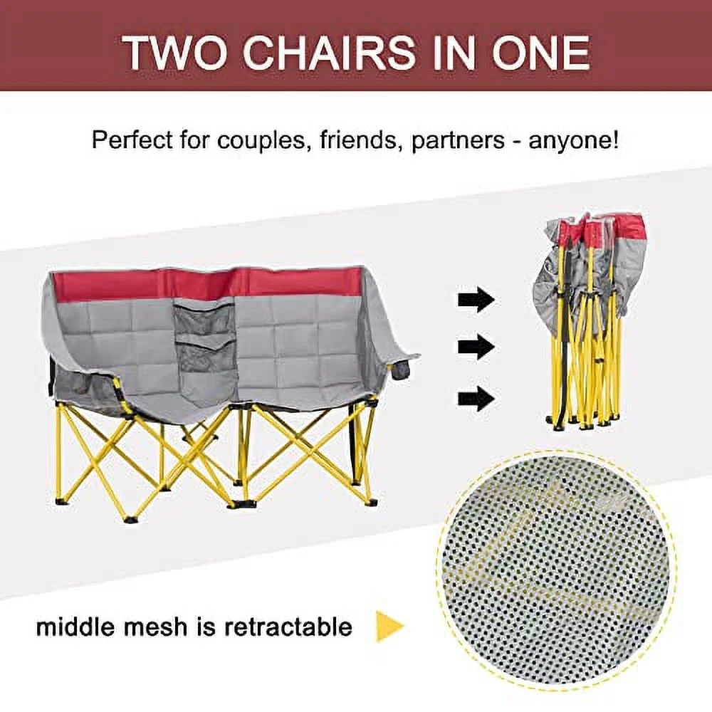 Outsunny Loveseat Style Camping Chair, Oversized Folding Lawn Chair with Carry Bag & Cup Holders, for Outdoor, Beach, Picnic, Hiking, Travel, Red & Gray - Curated Treasures Market