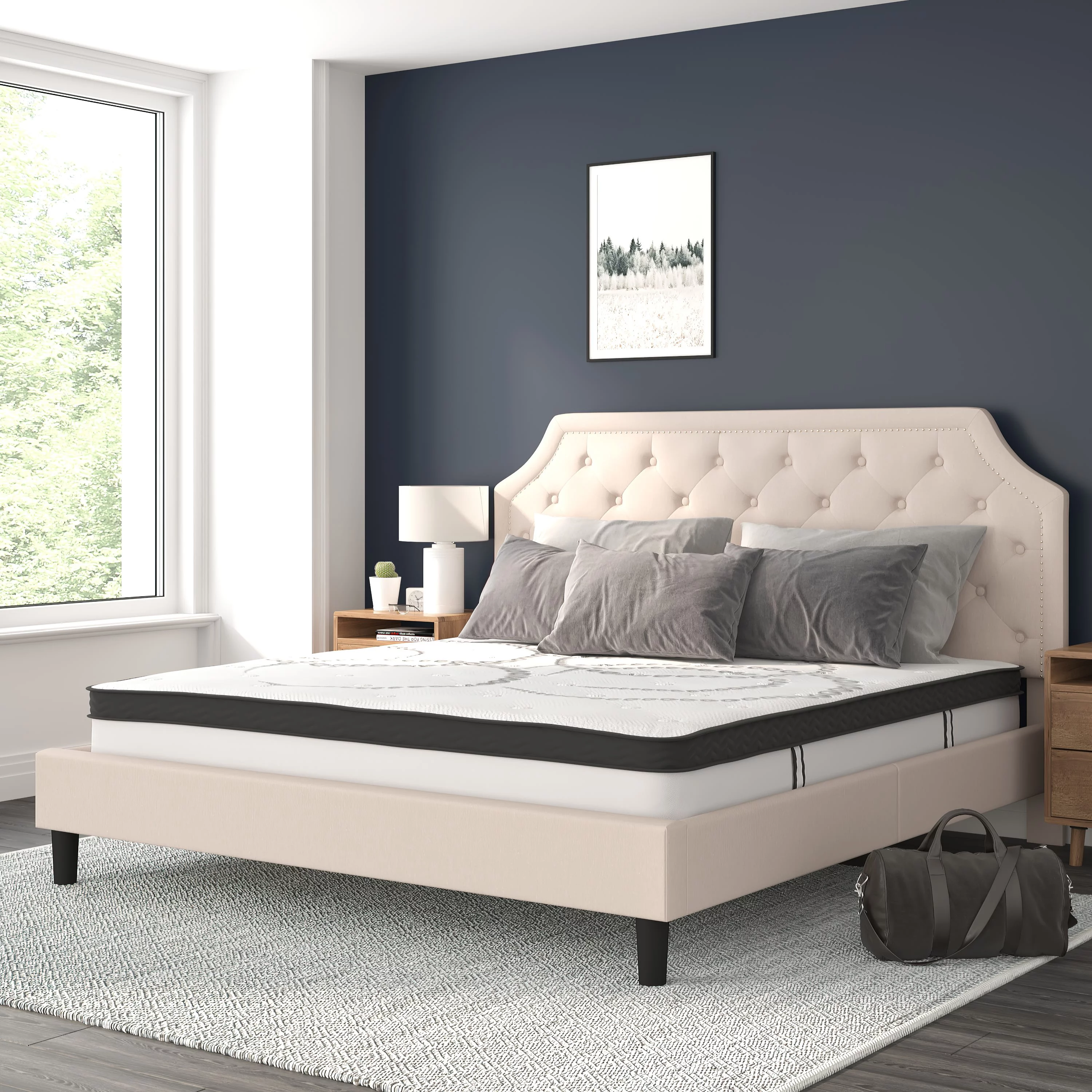 BizChair Brighton King Size Tufted Upholstered Platform Bed in Beige Fabric with 10 Inch CertiPUR-US Certified Pocket Spring Mattress