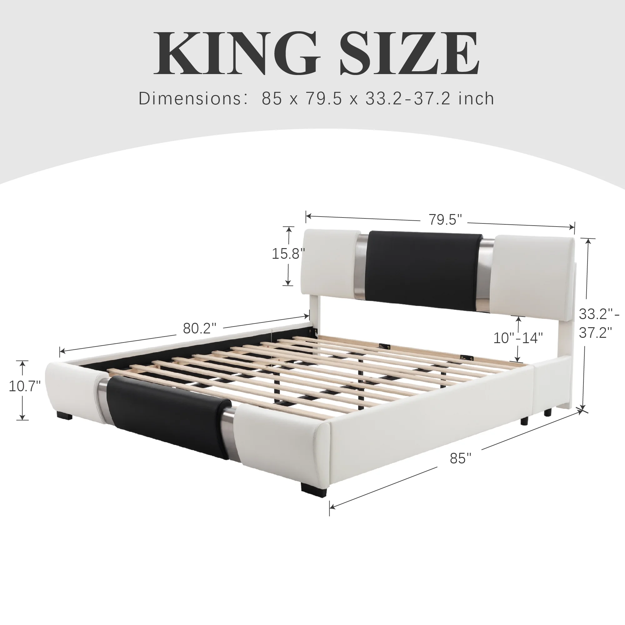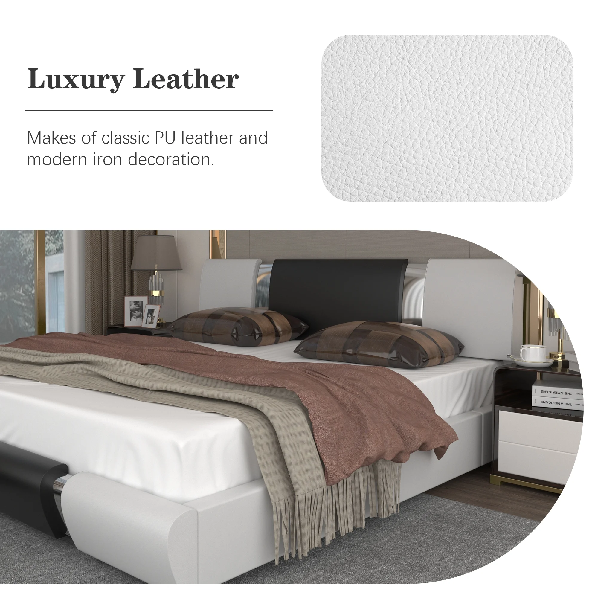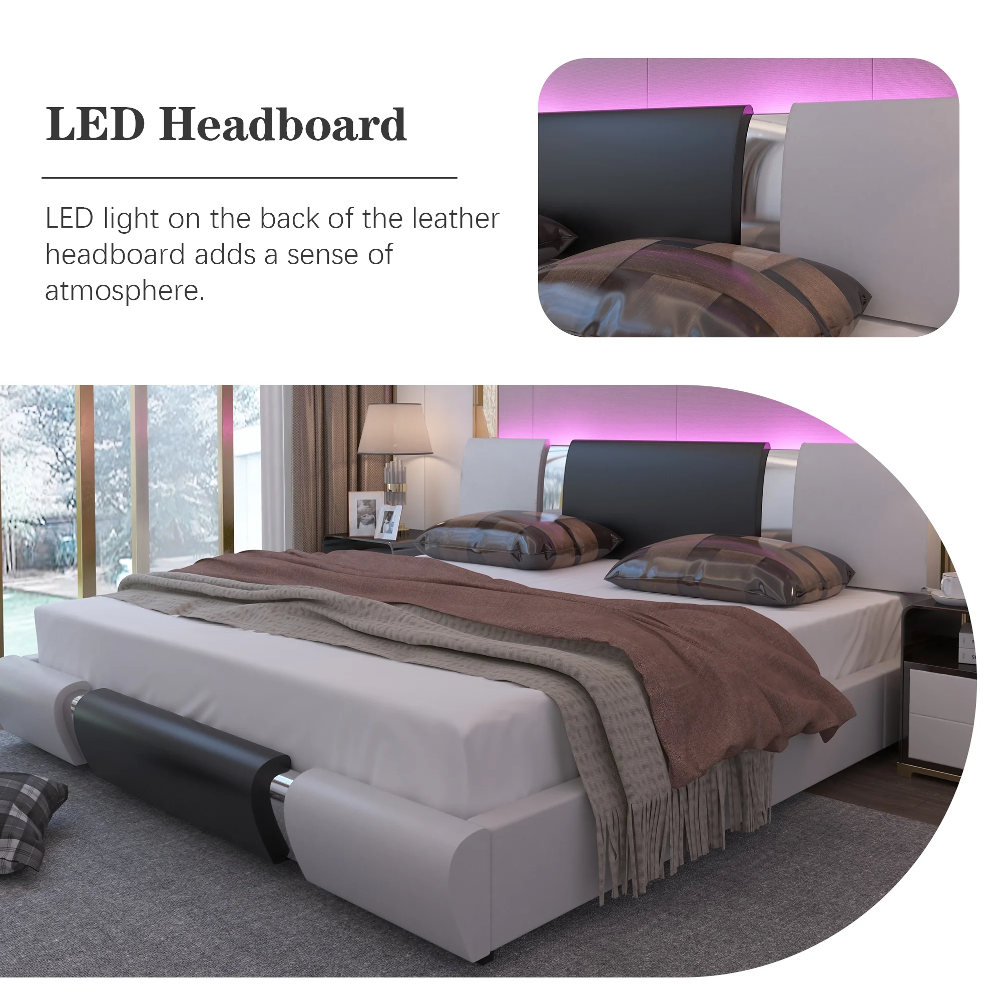 Kallabe Full Size Modern Bed Frame with Led Light,Iron Pieces Decor and Faux Leather Headboard, Black