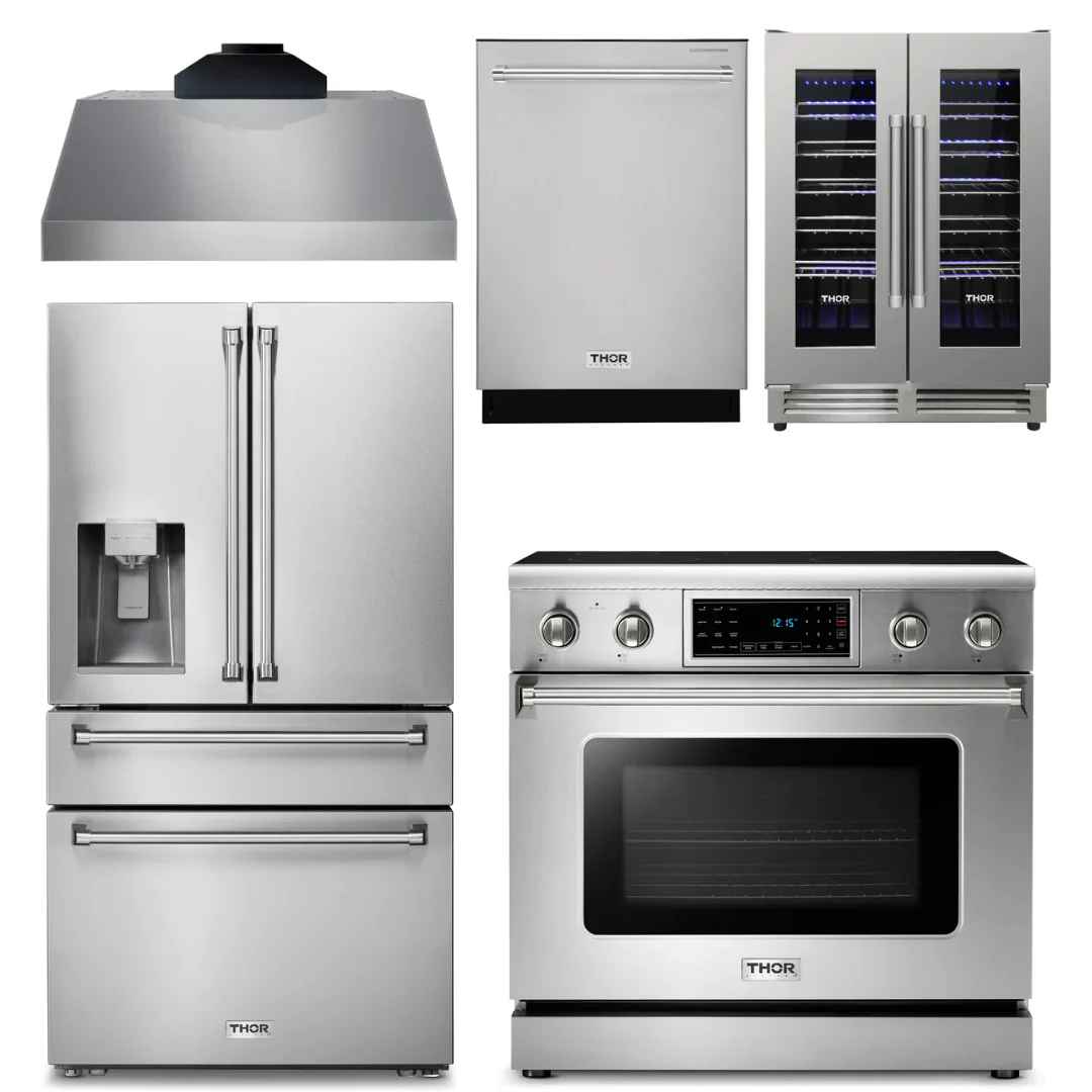 Thor Kitchen Package - 36 Electric Range, Range Hood, Refrigerator with Water and Ice Dispenser, Dishwasher, Wine Cooler, AP-TRE3601-C-8