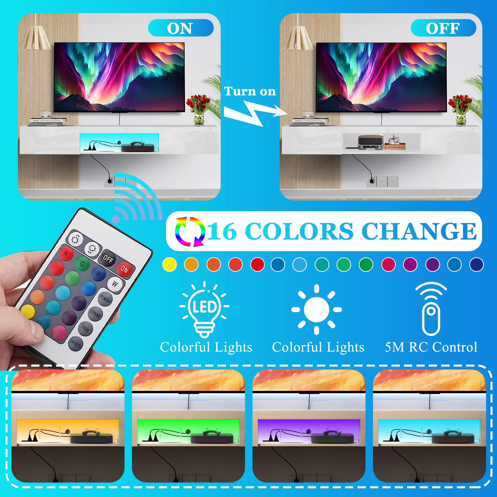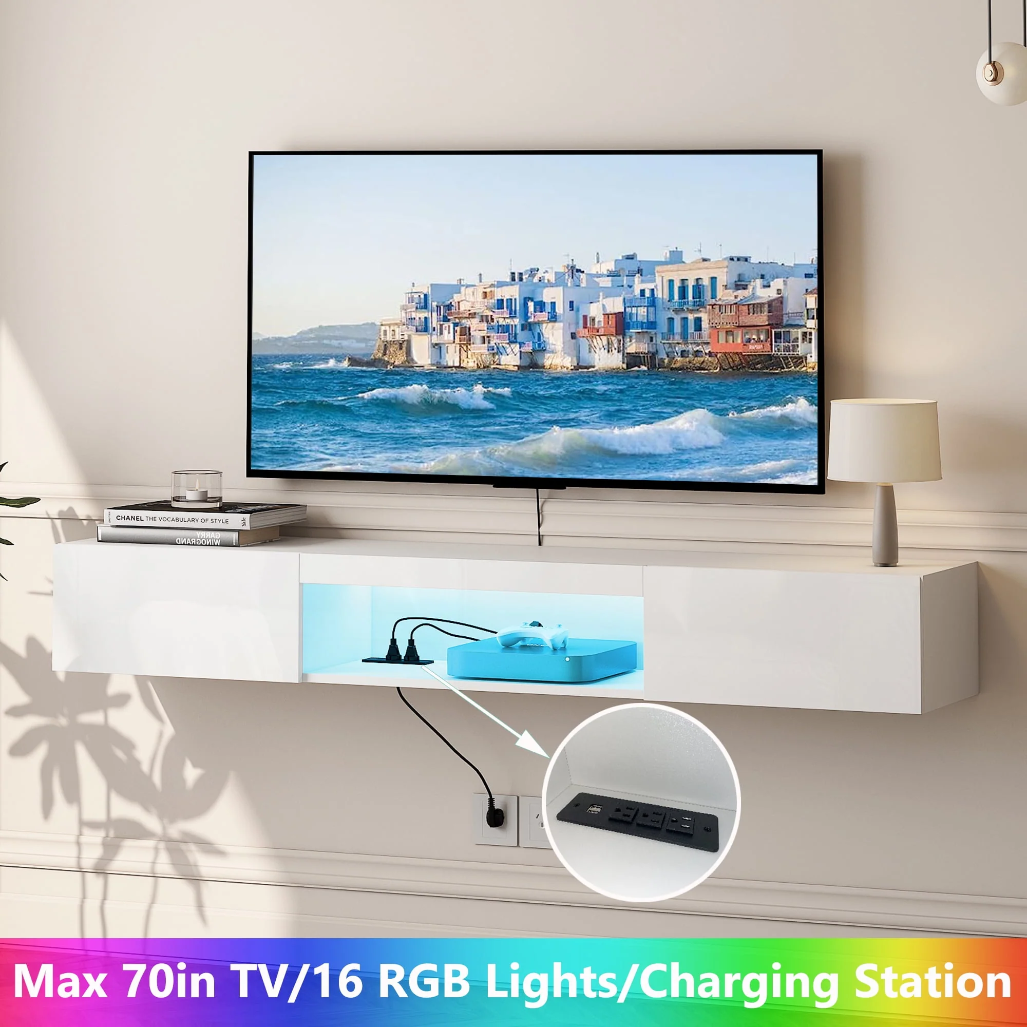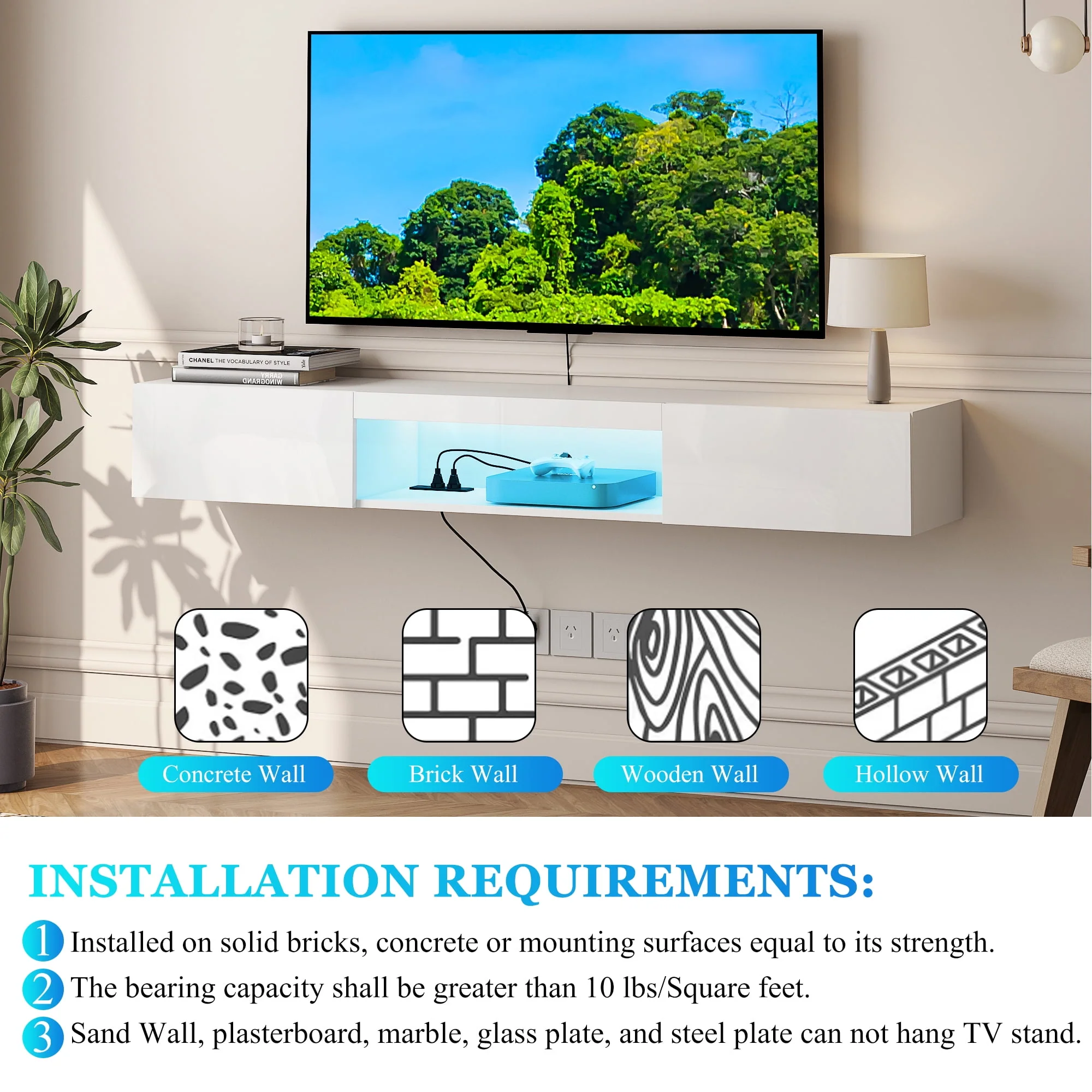 Floating TV Stand for 80 inch TVs, Paproos 71in Long LED Floating TV Cabinet, High Gloss Floating Entertainment Center with APP/Remote Control, Media Console Cabinet Living Room, Black