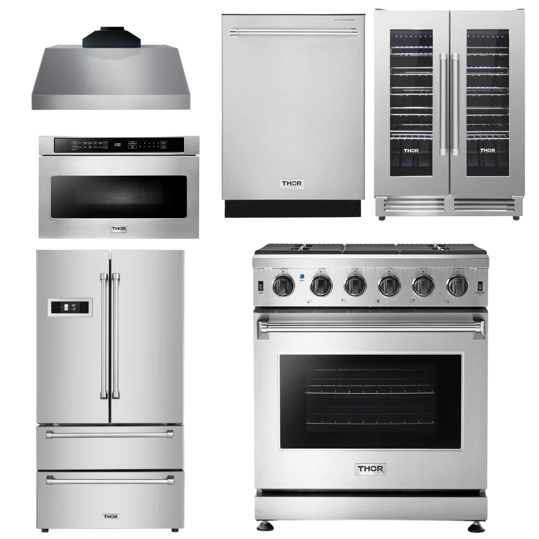 Thor Kitchen Package - 30 Propane Gas Range, Range Hood, Microwave, Refrigerator, Dishwasher, Wine Cooler, AP-LRG3001ULP-C-6