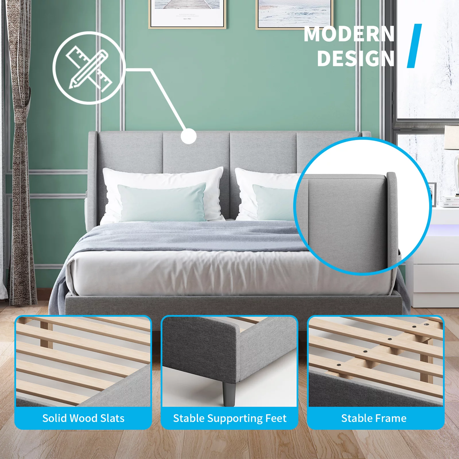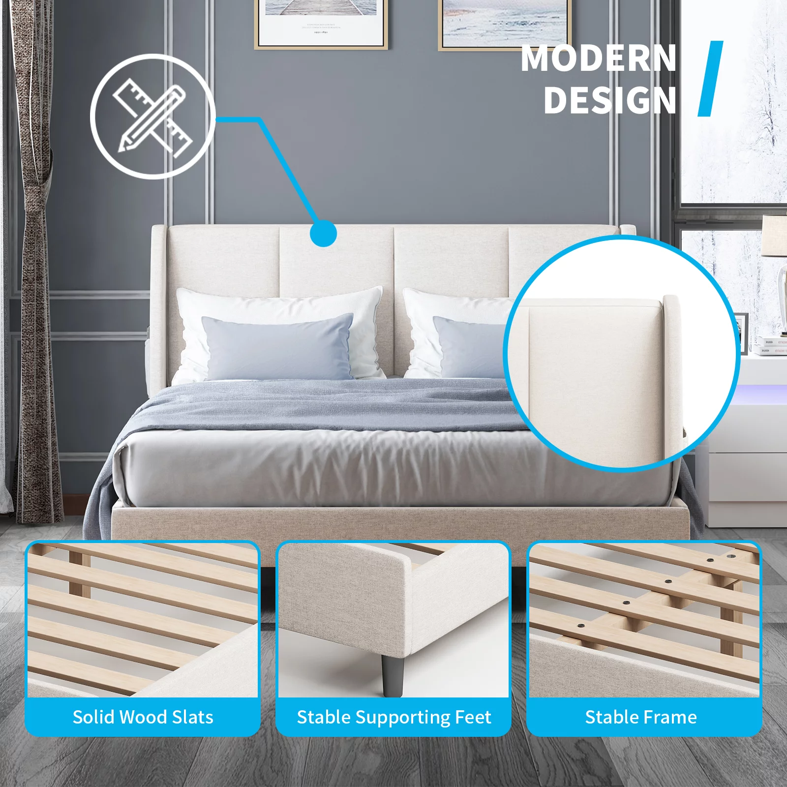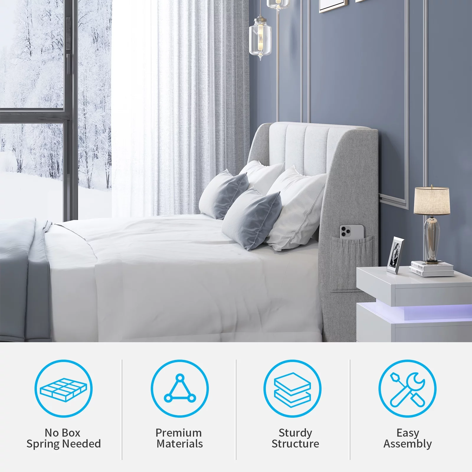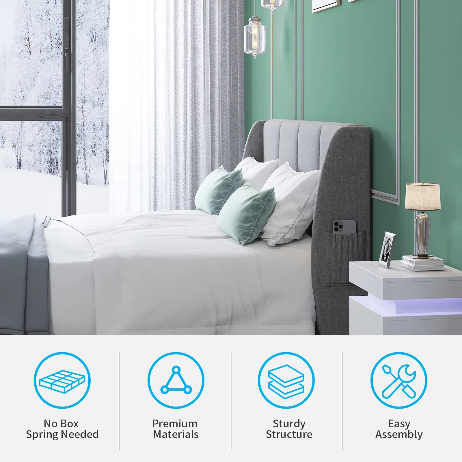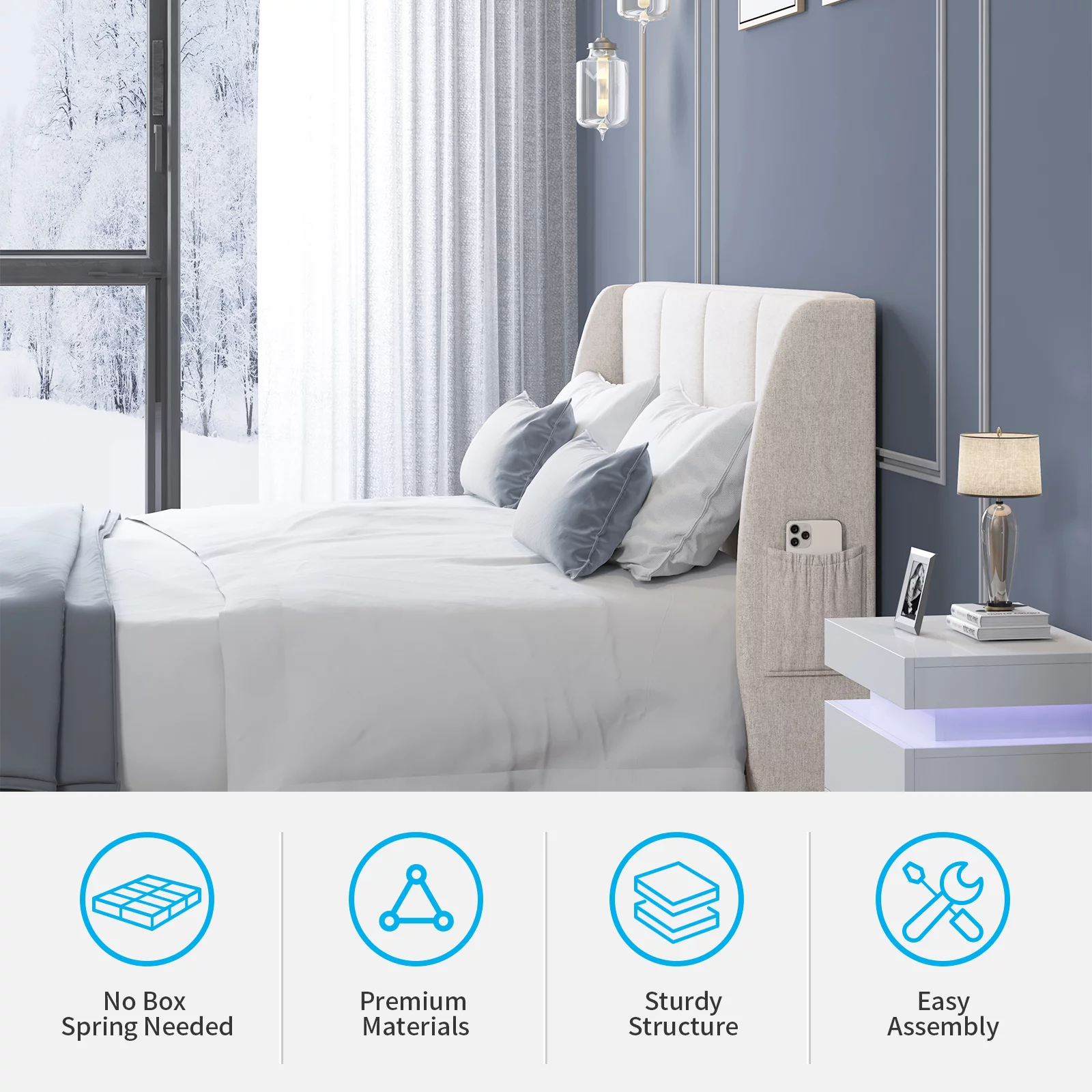 Queen Upholstered Bed With Lift Up Storage And LED Light. Modern Queen Platform Bed With Button-Tufted Headboard. Wood Queen Size Bed Frame For Bedroom. Linen. Beige. HZG-SF000039AAA