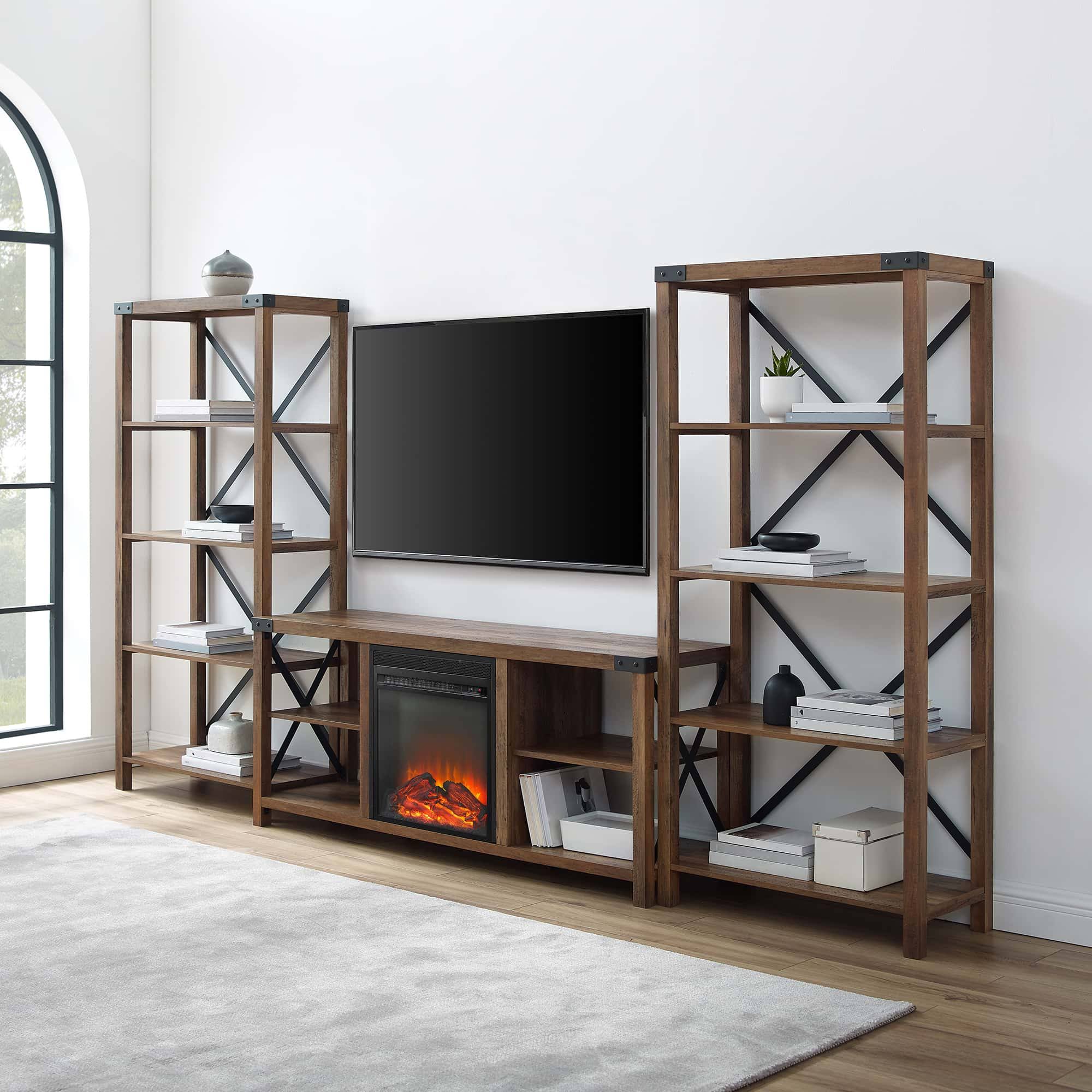 Walker Edison Metal x Accent Wall with 60" Fireplace Console - Reclaimed Barnwood - Megean