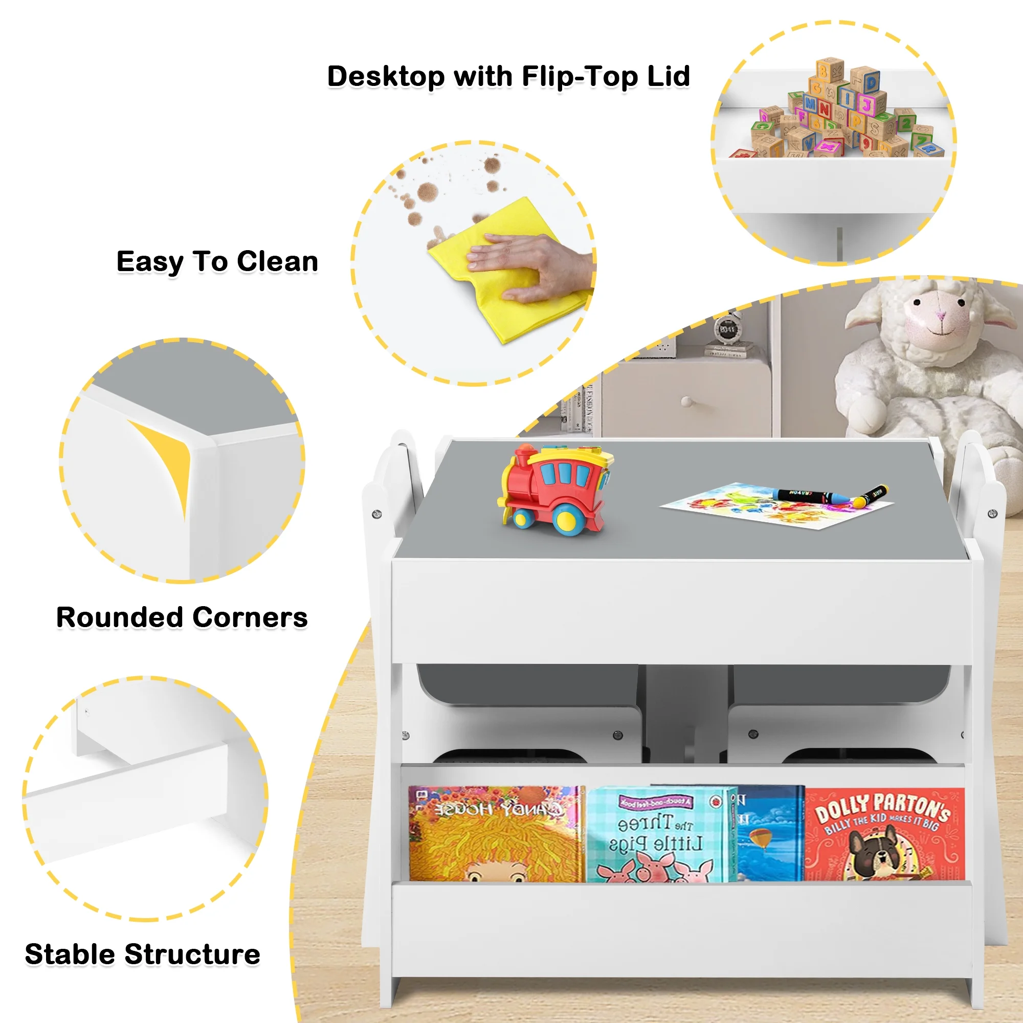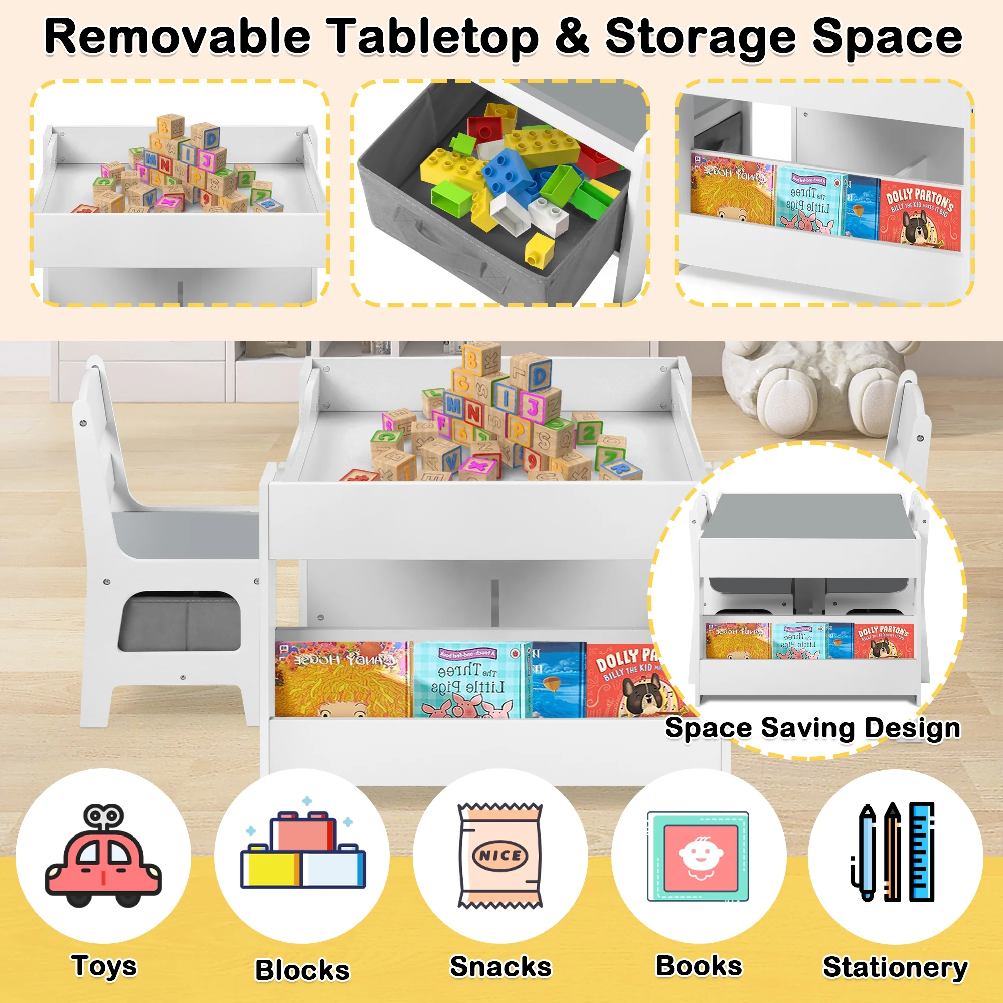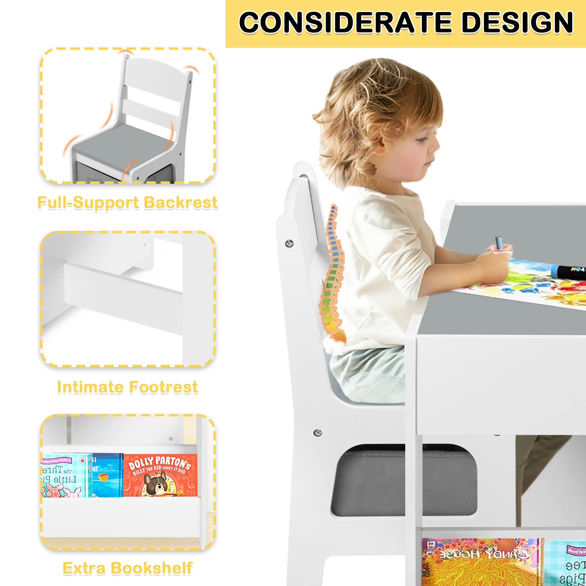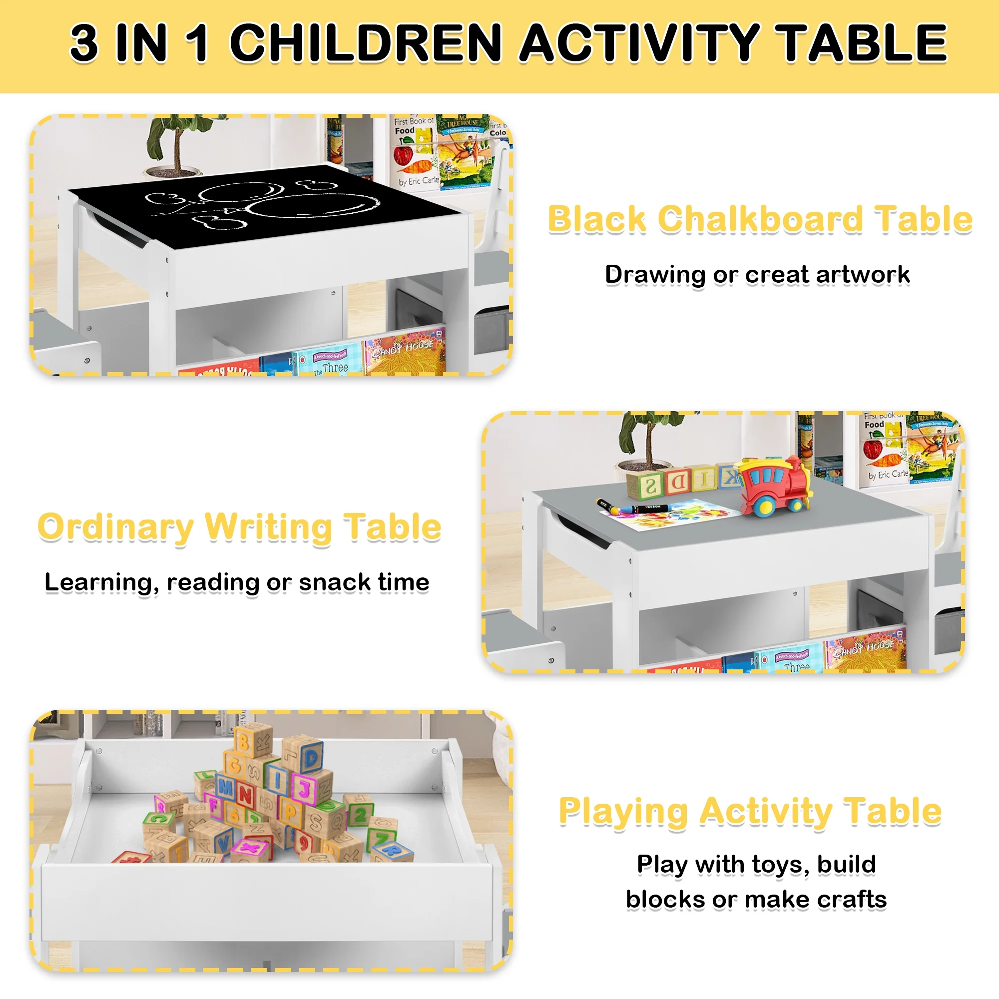 AILEEKISS 4 in 1 Kids Wood Table & 2 Chairs Set, Children Activity Table for Toddler w/Storage, Grey - Curated Treasures Market