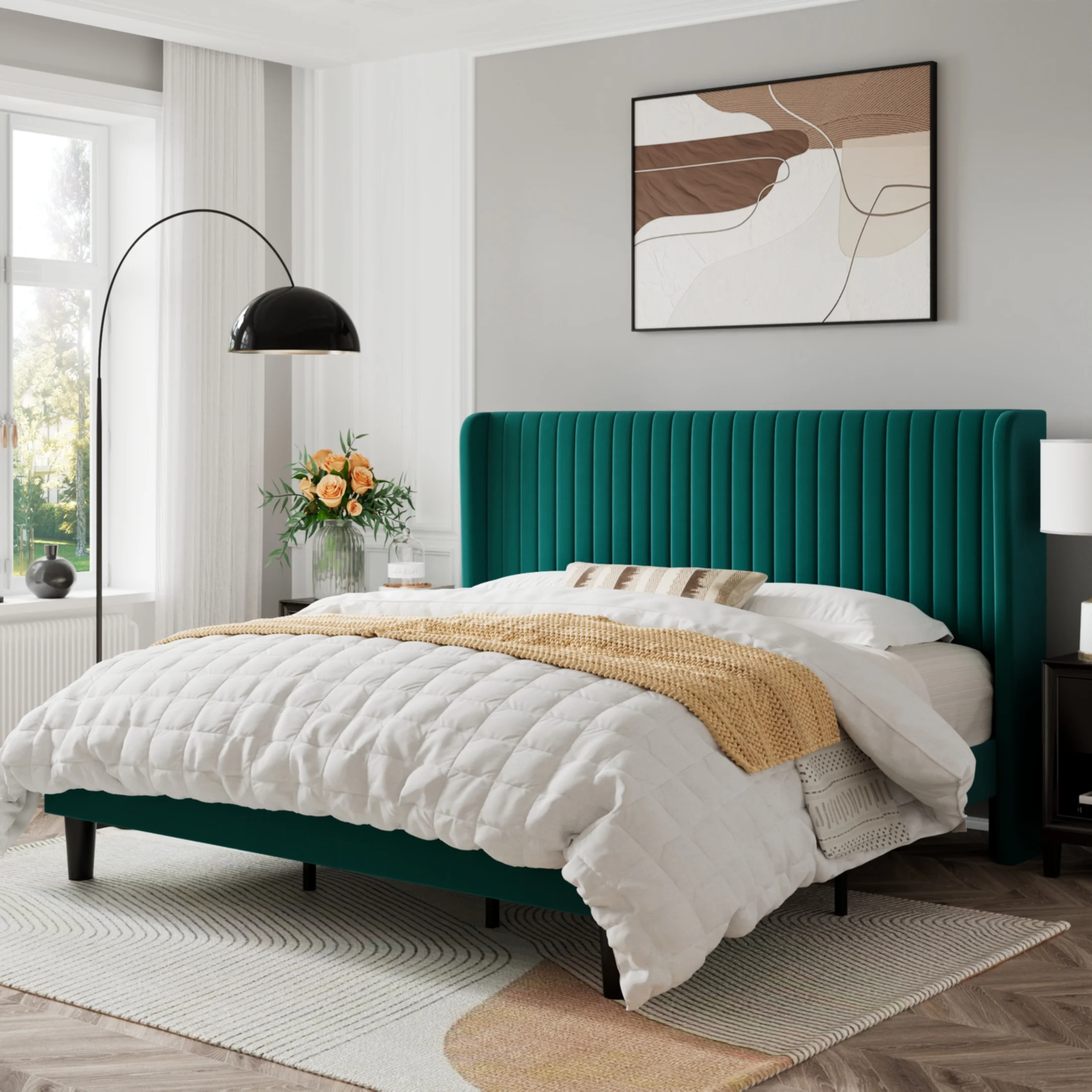 Sifurni Queen Size Velvet Platform Bed Frame with Vertical Channel Tufted Wingback Headboard, Off White
