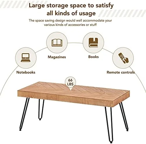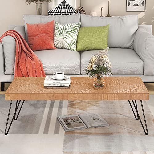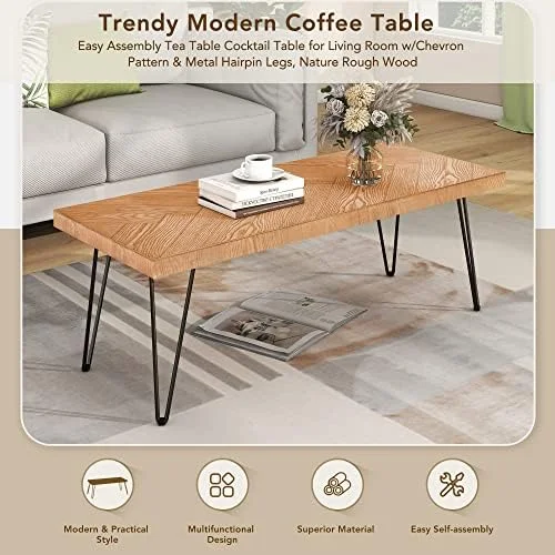 xrboomlife Modern Coffee Table Easy Assembly Tea Table Thicken Cocktail Table with w/Chevron Pattern & Metal Hairpin Legs for Living Room Ash Wood Finished (Natural) - Curated Treasures Market