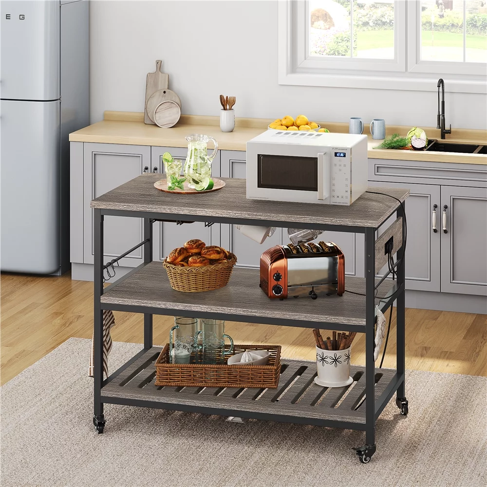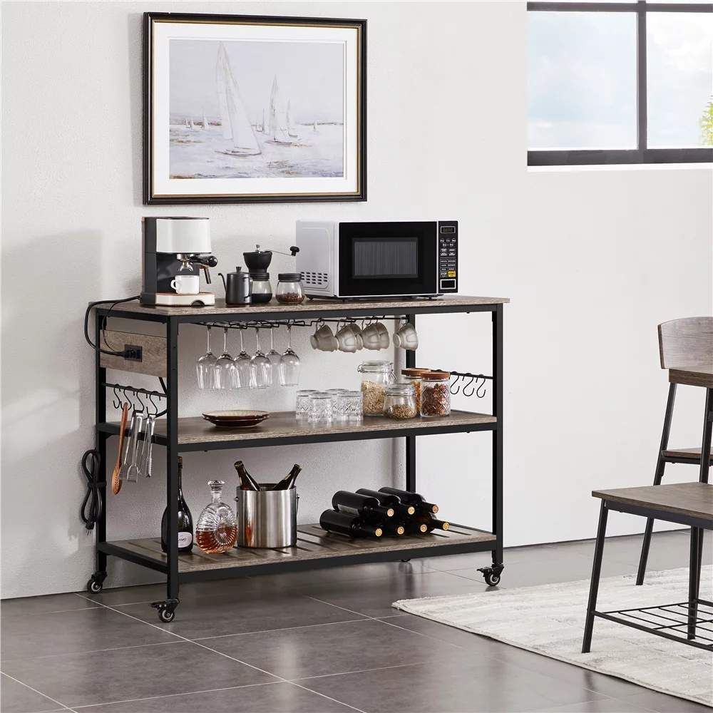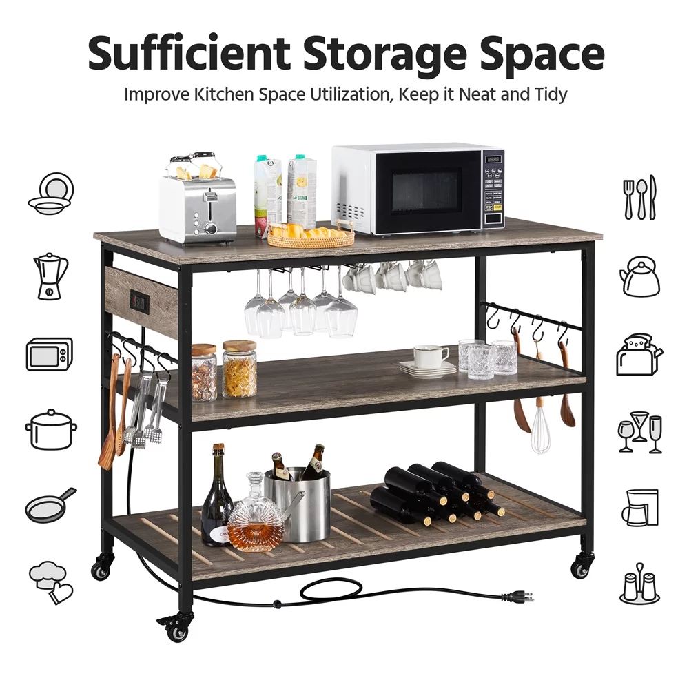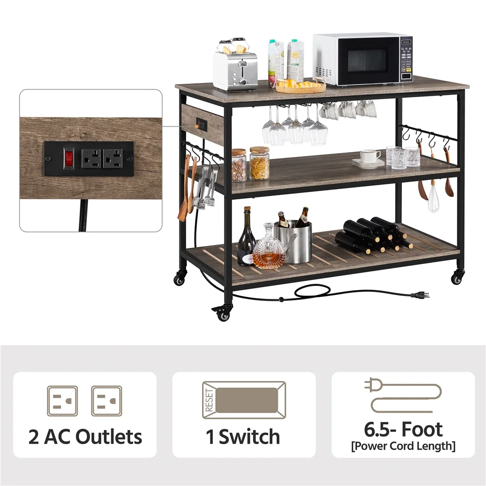 Topeakmart 3-Tier Rolling Kitchen Cart with Glass Holder and Power Outlets for Kitchen, Taupe Wood - Curated Treasures Market