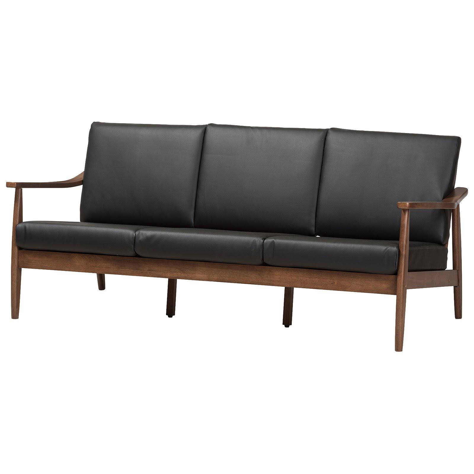 Baxton Studio Venza Walnut Wood Black Faux Leather 3 Seater Sofa - Megean