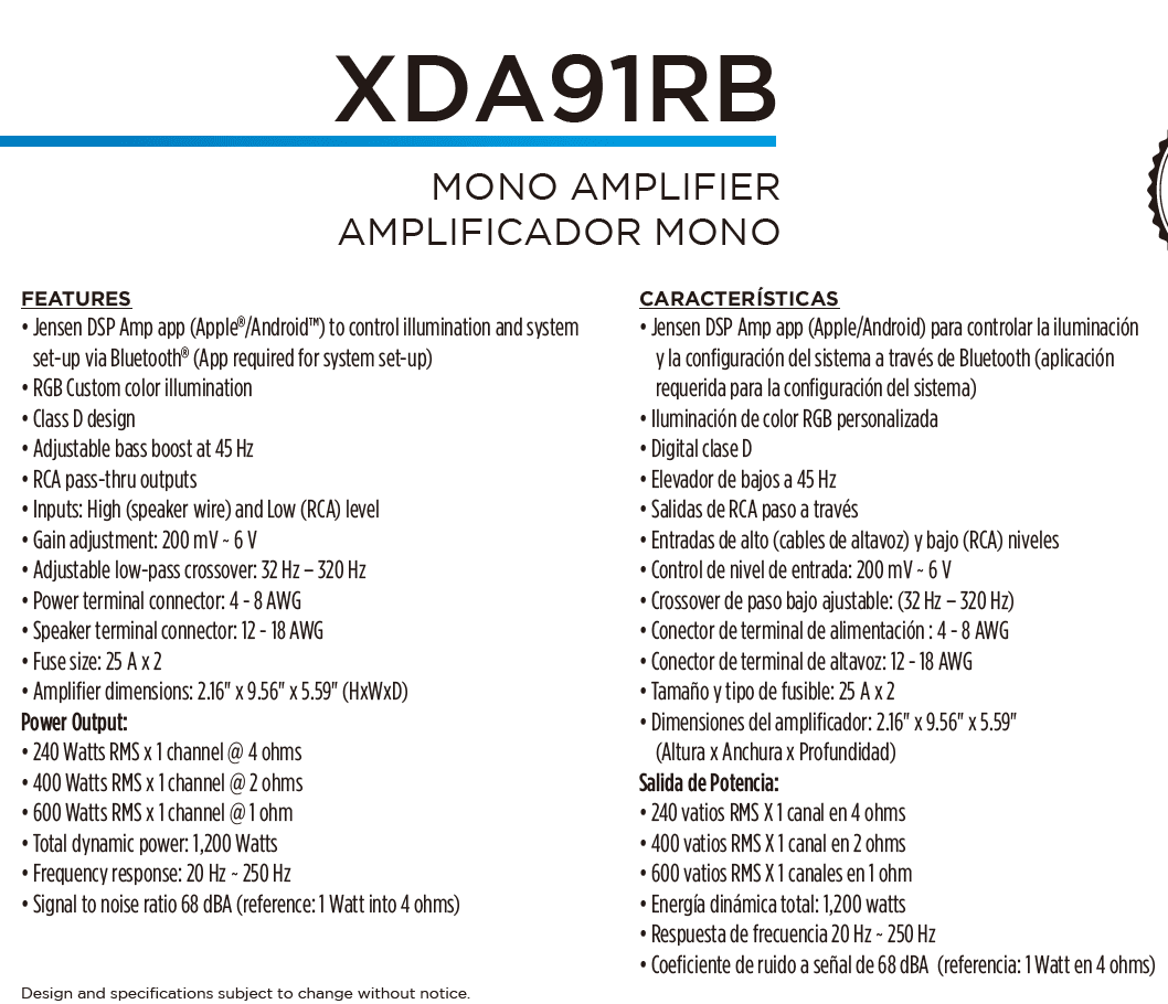 Jensen XDA91RB Class-D Mono Amplifier with 240 Watts x 1 RMS,1200 Watts Peak Power, New