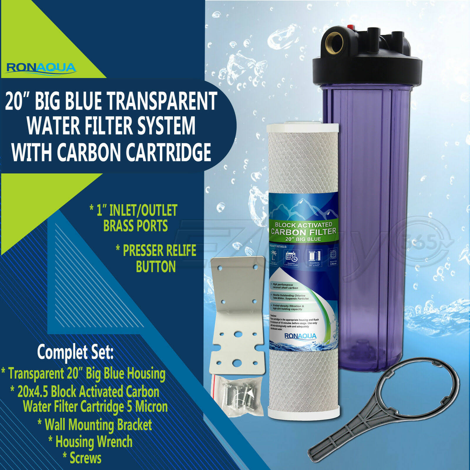 Whole House Water Filter Purifier System Transparent Big Blue Housing with Presser Relief Button 1A Inlet Outlet Brass Port 5 Micron Block Activated - Megean