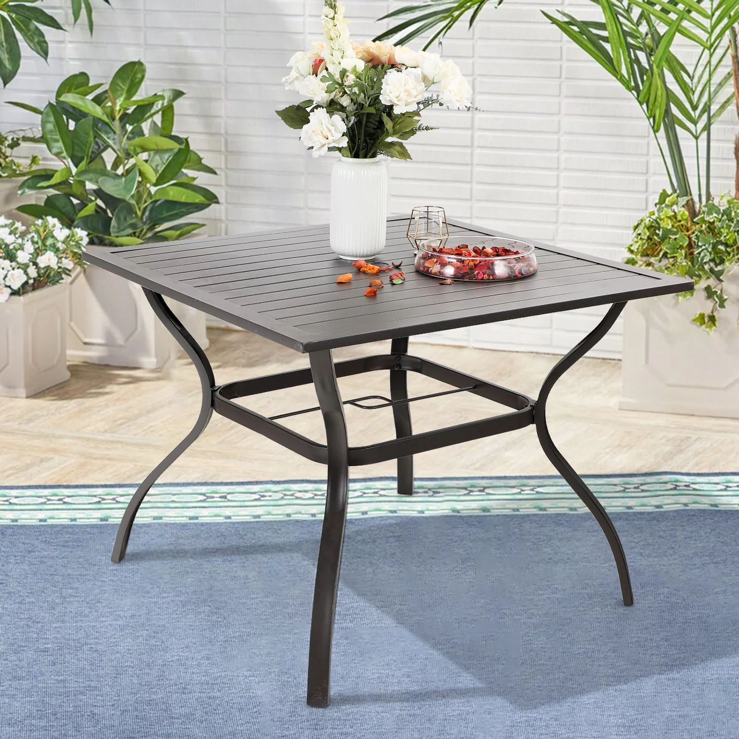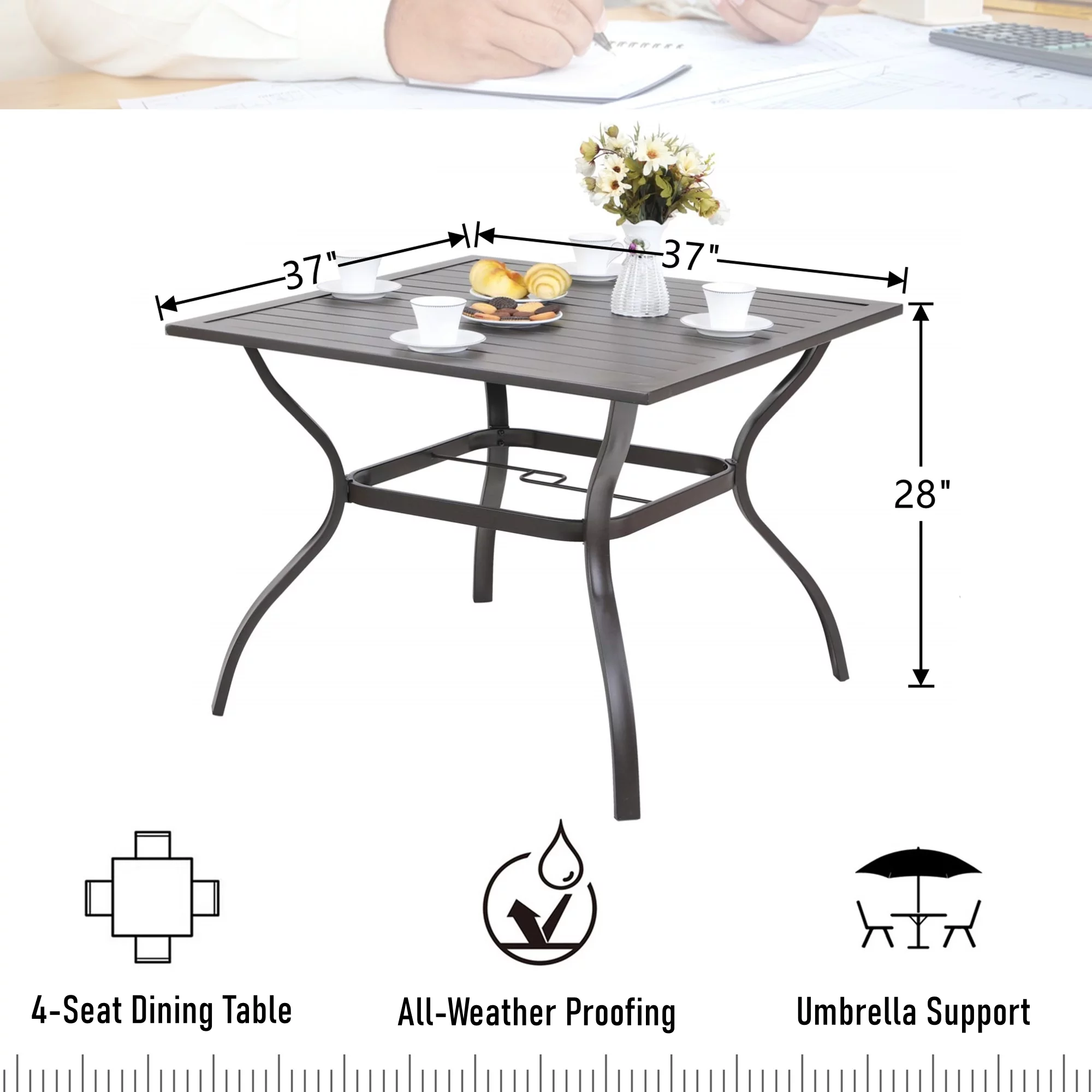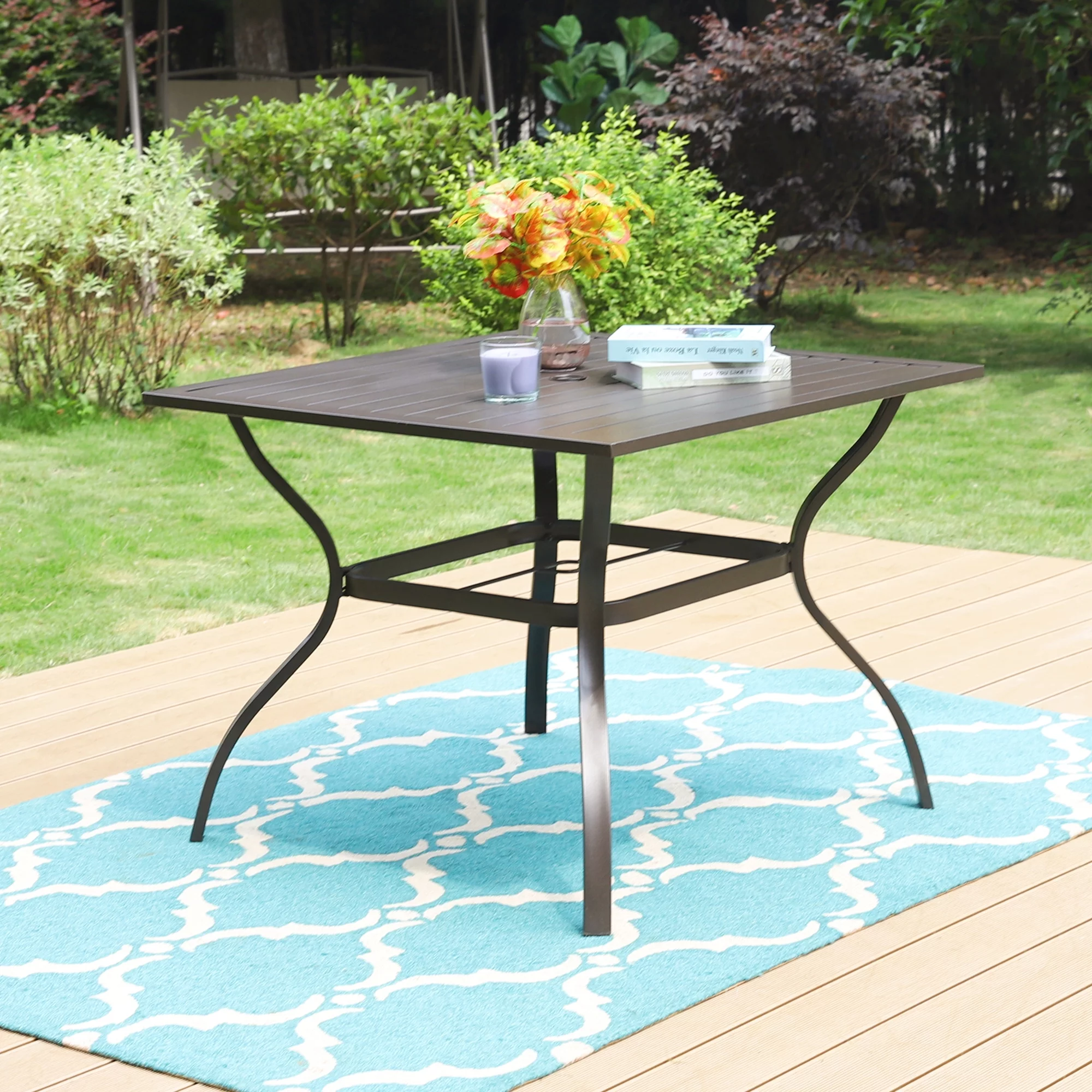 MF Studio Metal Steel Slat Patio Metal 37 inch Dining Table Steel Slat Bistro Large Square with 1.57 Umbrella Hole - Brown