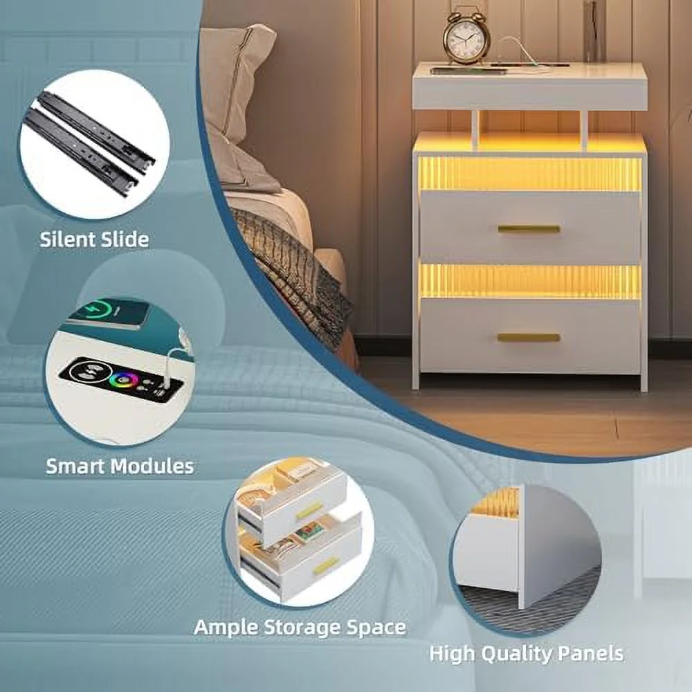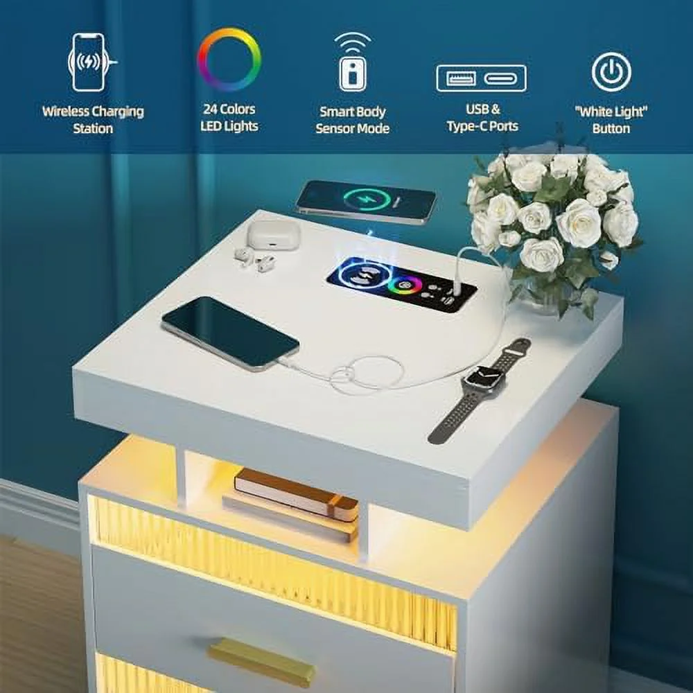GEROBOOM LED Nightstand with Charging Station Modern End Table with 2 Drawers Bedside Table with with Human Sensor 24 Colors Lights for Bedroom (Black ) - Curated Treasures Market